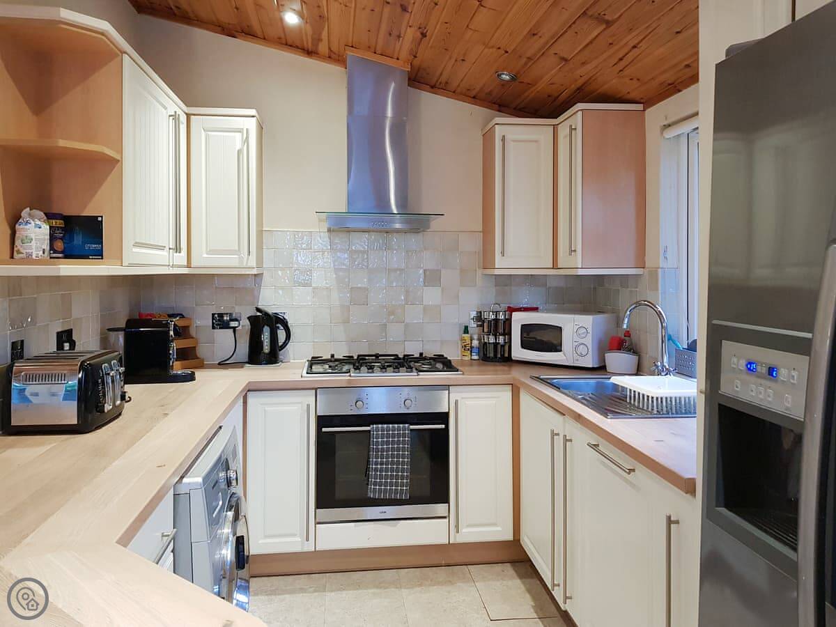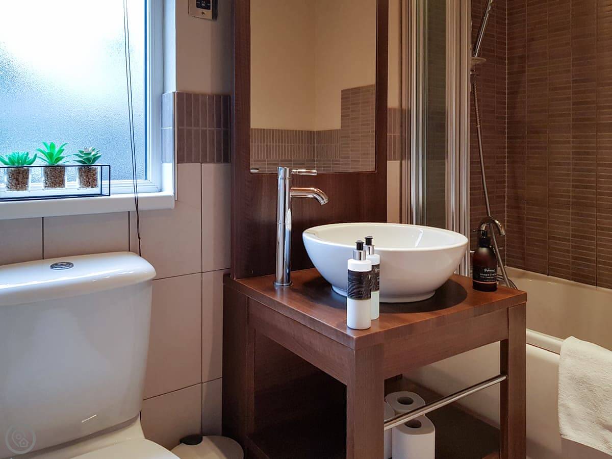 It sleeps six. That’s in two bedrooms, but there are two bathrooms, which helps. There’s a 4 Star rating. It’s clean and well-equipped. It’s open-plan downstairs, so if someone’s in the kitchen you’re all together.