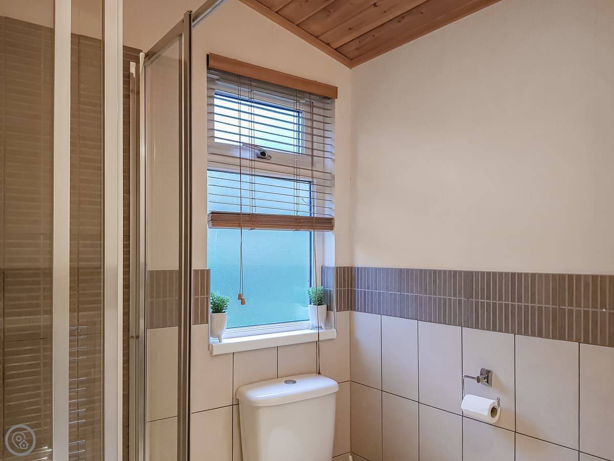 Kingfisher Lodge is in Arden, on the edge of Loch Lomond. It’s a modern, detached chalet, one of a row of four. You get your own decking and garden area. It looks out towards the loch.