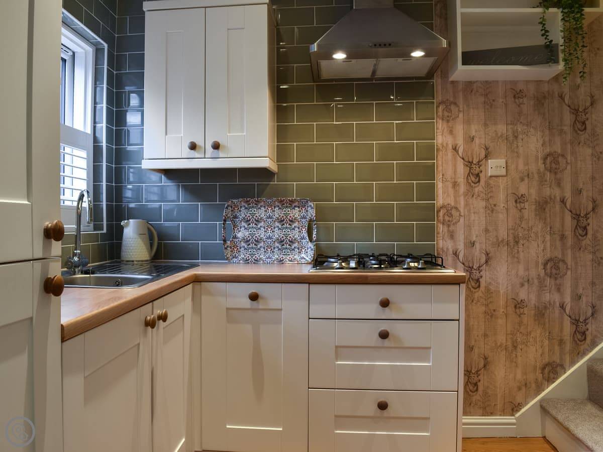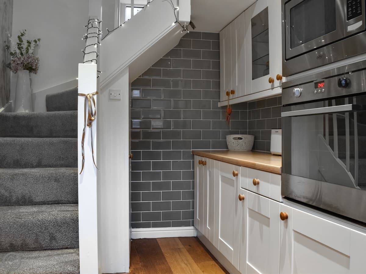 The stairs are quite steep. The kitchen has a cooker, fridge, dishwasher and washing machine. There's a gas fire in the living room and a smart TV. The bedroom has a double bed and storage. The bathroom is upstairs and has a shower.