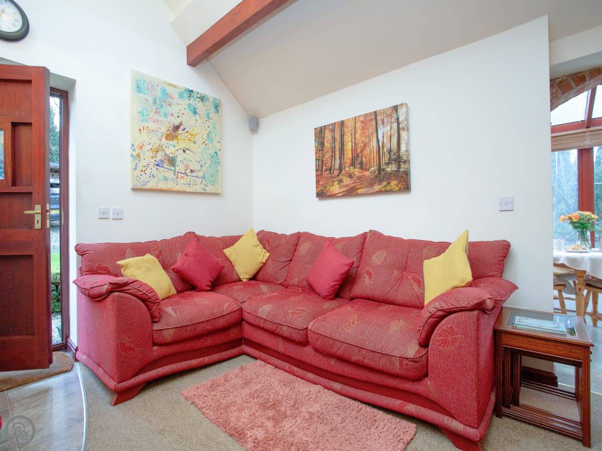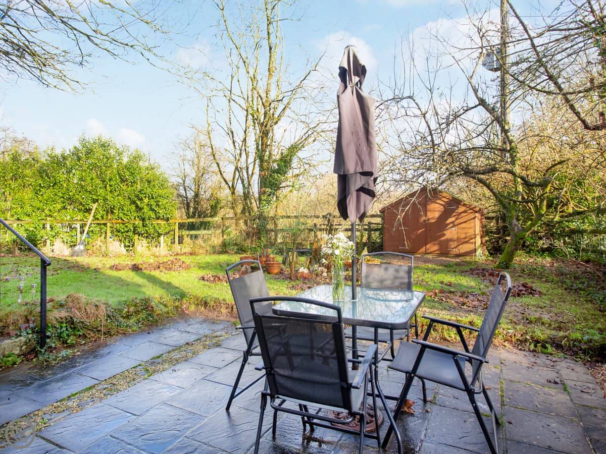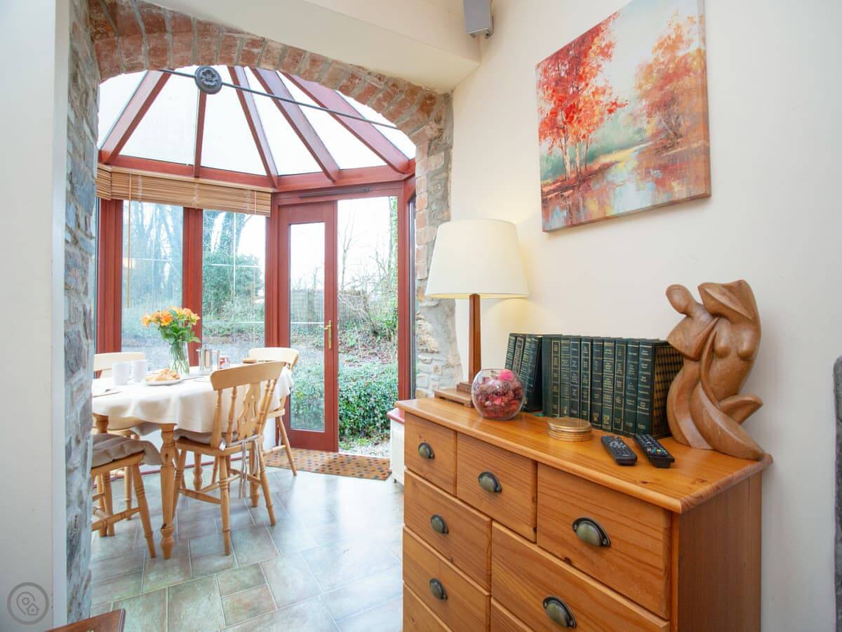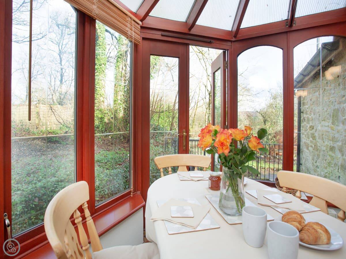 The conservatory looks out onto the garden. The garden is enclosed and it's got a seating area and a barbecue. Because it's so rural, the night sky is very dark here. You can see a lot of stars.