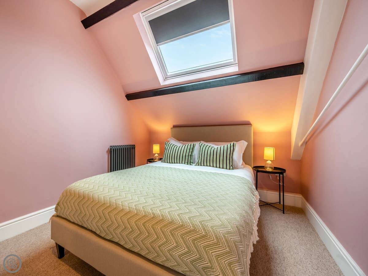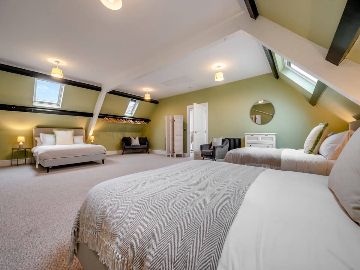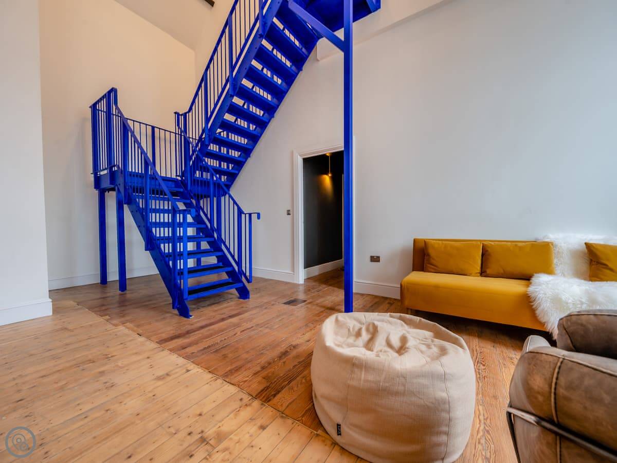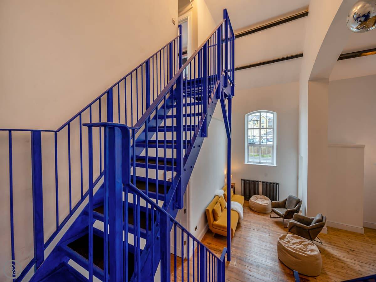 Then there's another big living area that used to be the stage. It gets a lot of light and you could use it for anything, like yoga if you wanted. The stairs up to the top floor are quite bright and colourful. Up there is the fifth bedroom, which has three kingsize beds in it, and two more shower rooms. Off that bedroom is a little study nook with a view out to sea.