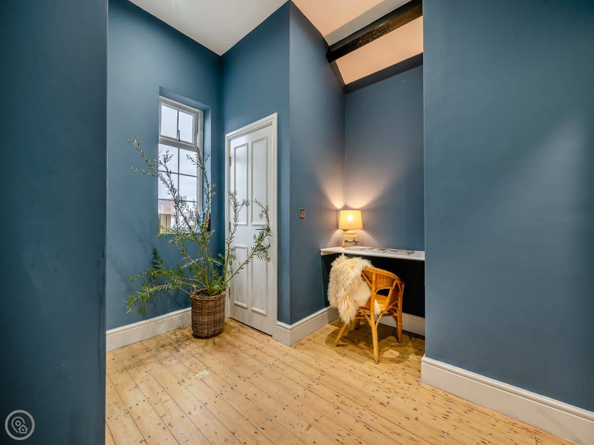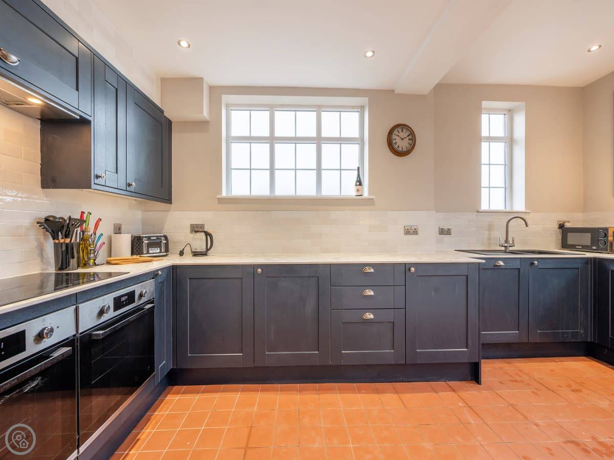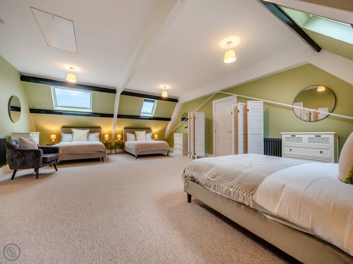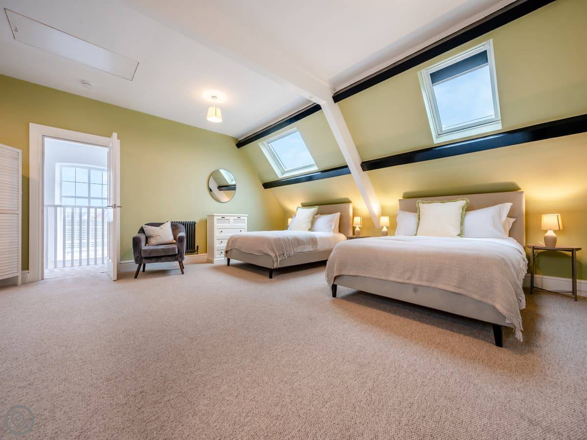 The layout is a bit different. Four of the bedrooms are on the ground floor, each with a kingsize bed. There are two bathrooms down there, one has a bath. The main living area is open plan, with the kitchen, dining, and a sitting area. The ceilings are high. There's a utility room with a washing machine and a desk if you need it.