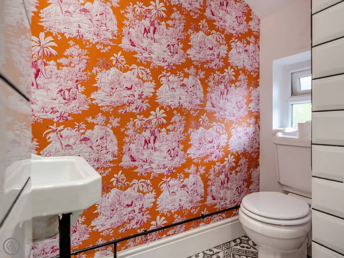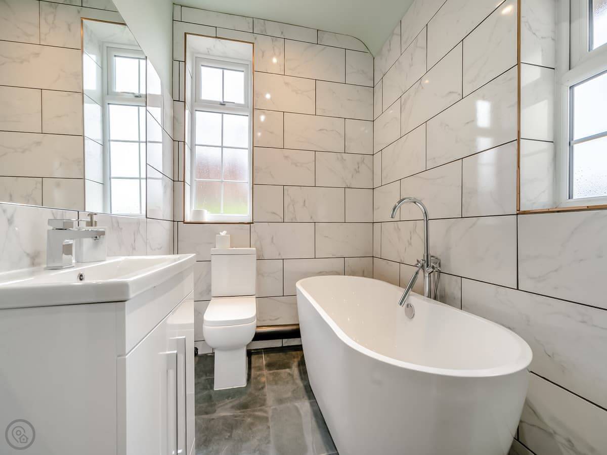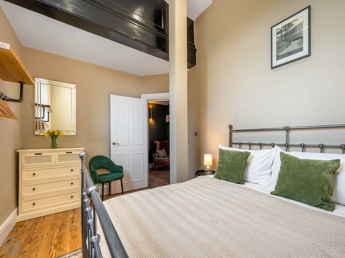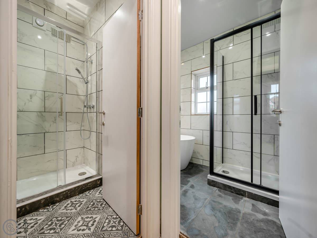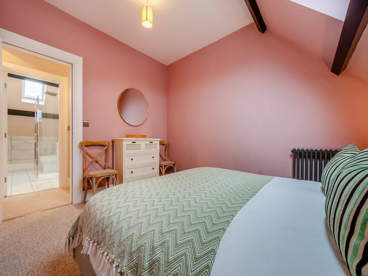 The layout is a bit different. Four of the bedrooms are on the ground floor, each with a kingsize bed. There are two bathrooms down there, one has a bath. The main living area is open plan, with the kitchen, dining, and a sitting area. The ceilings are high. There's a utility room with a washing machine and a desk if you need it.