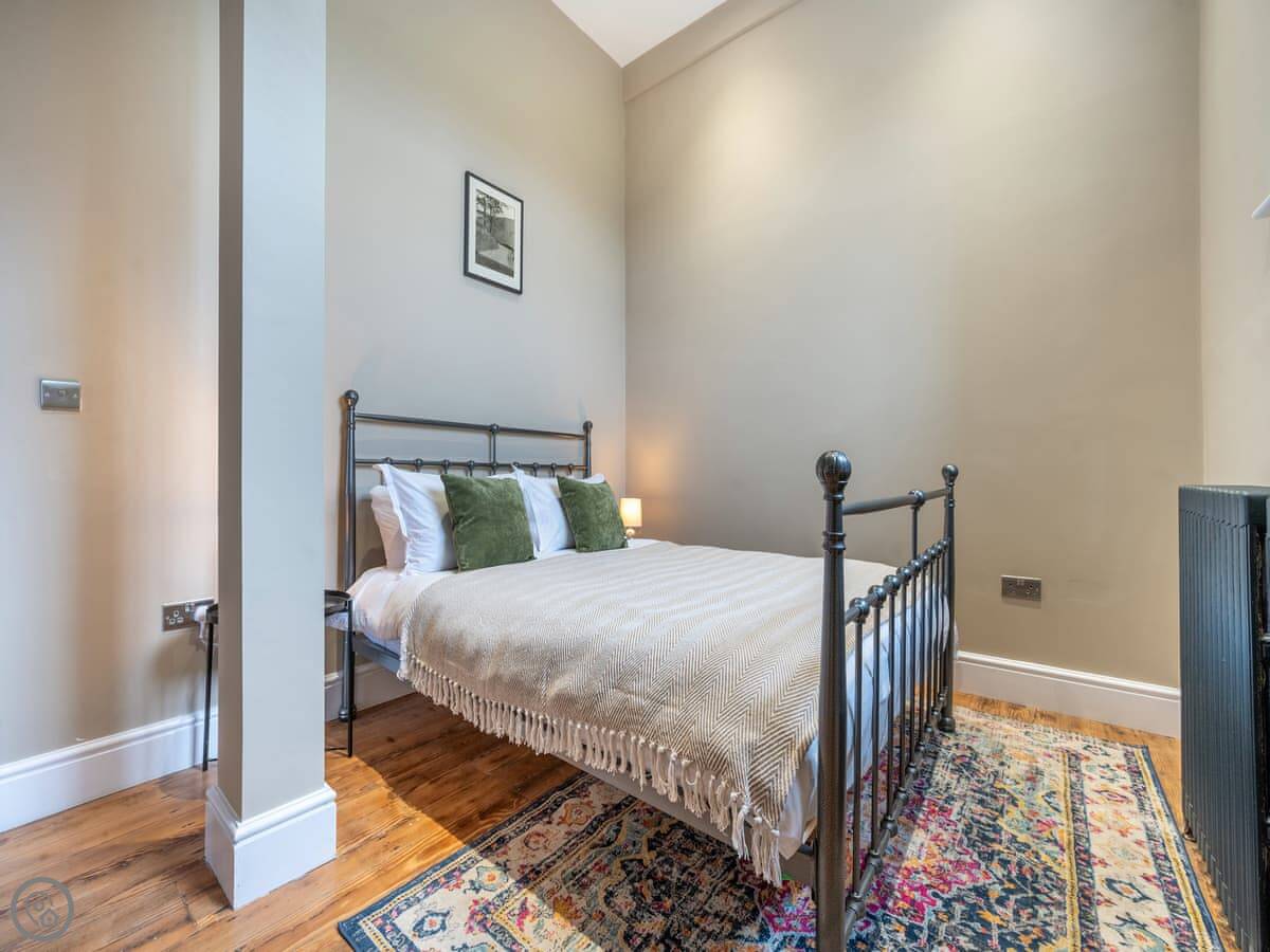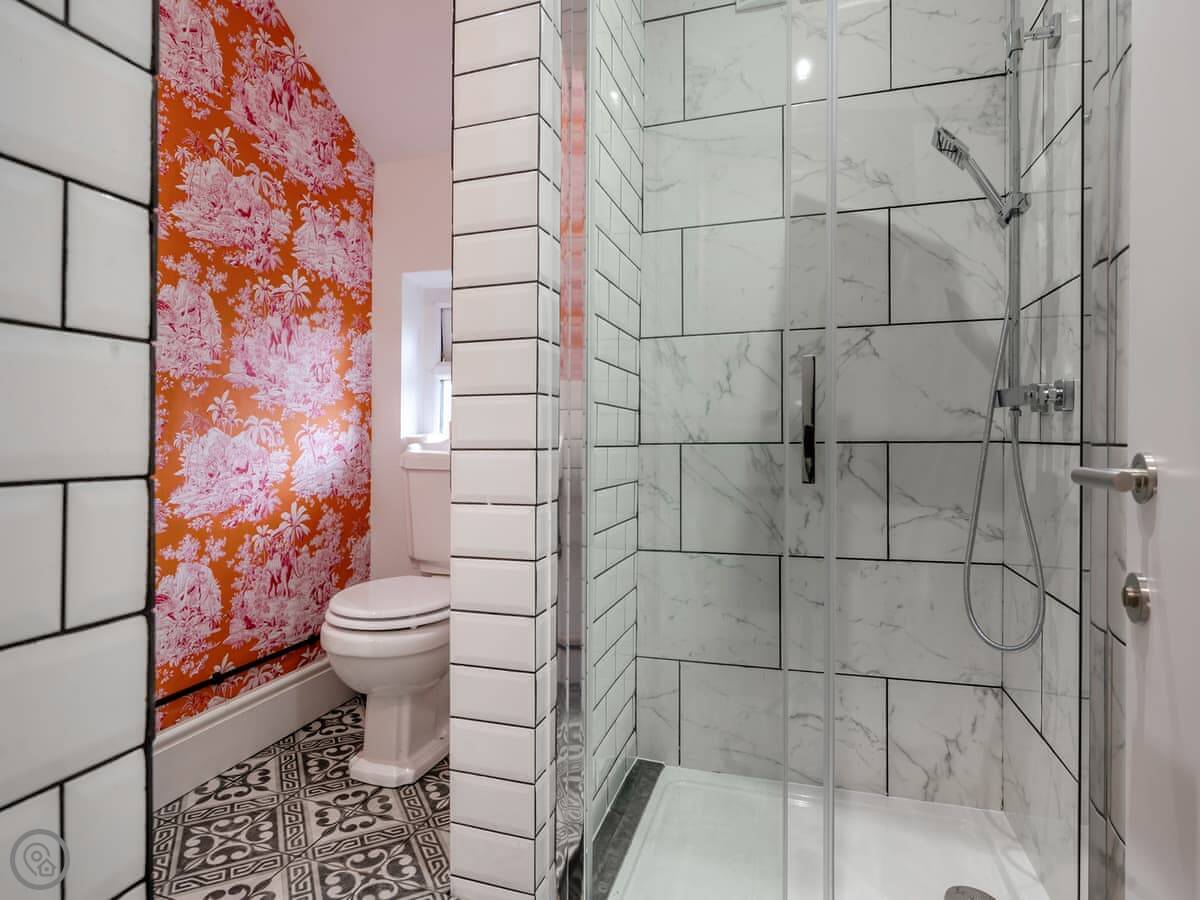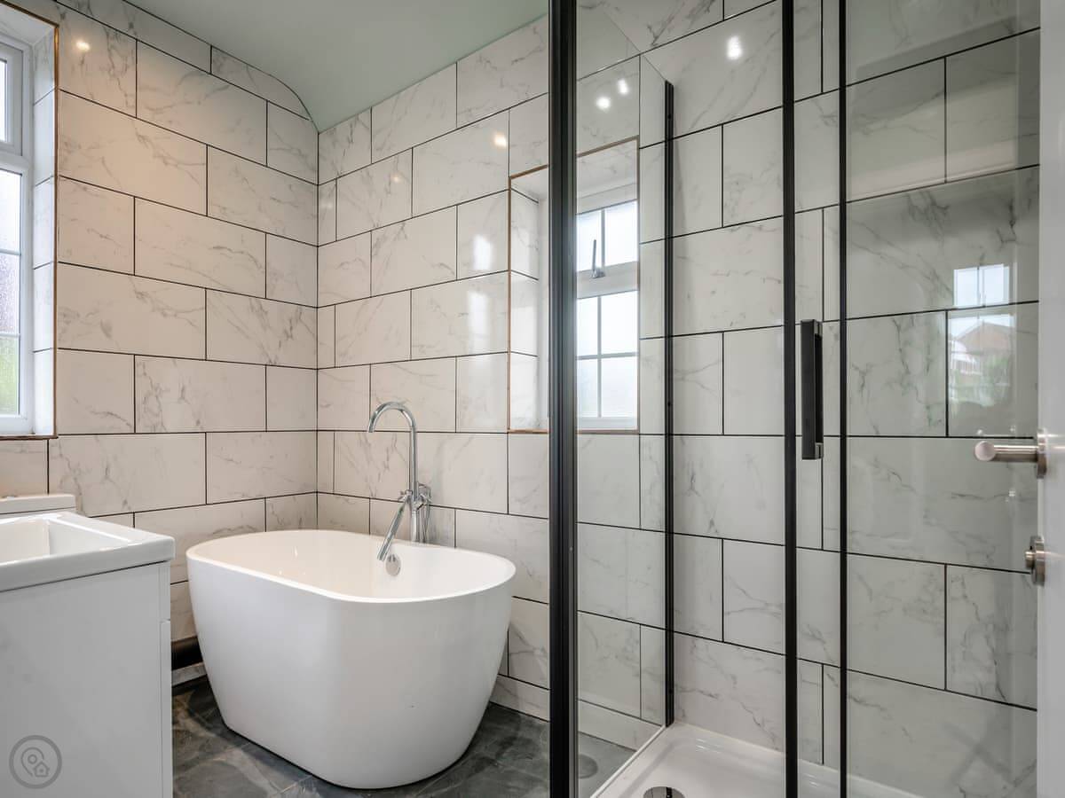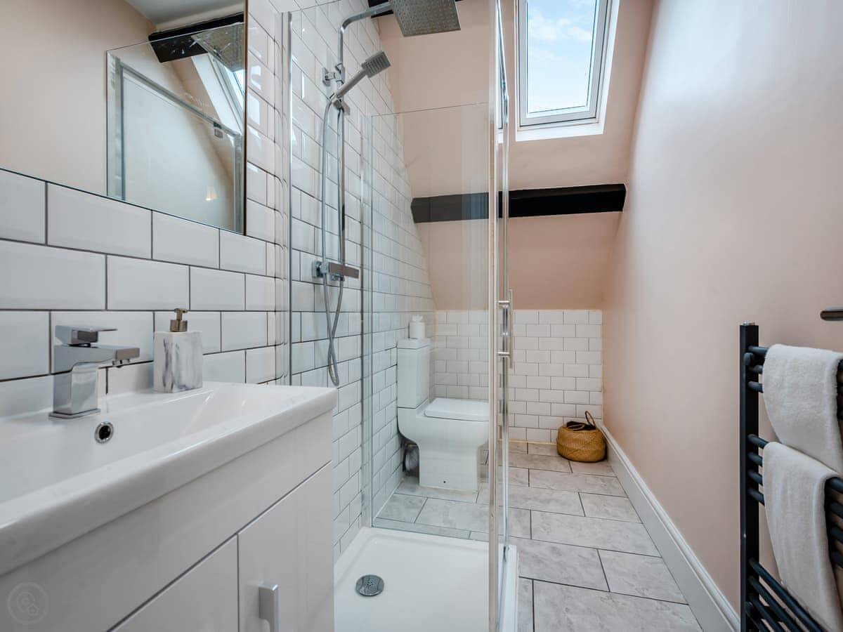 The layout is a bit different. Four of the bedrooms are on the ground floor, each with a kingsize bed. There are two bathrooms down there, one has a bath. The main living area is open plan, with the kitchen, dining, and a sitting area. The ceilings are high. There's a utility room with a washing machine and a desk if you need it.