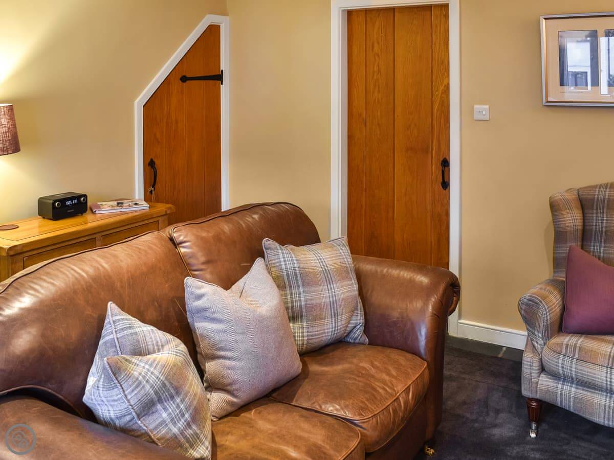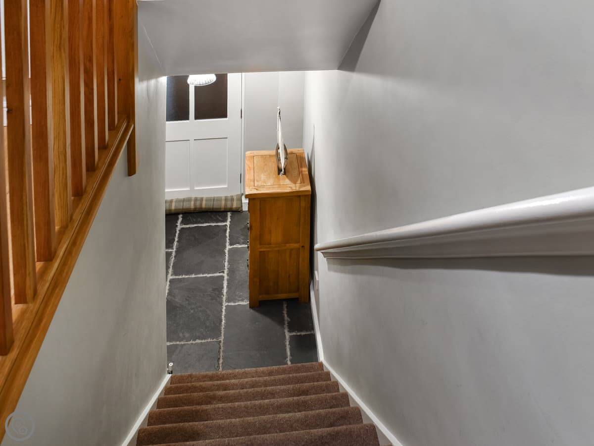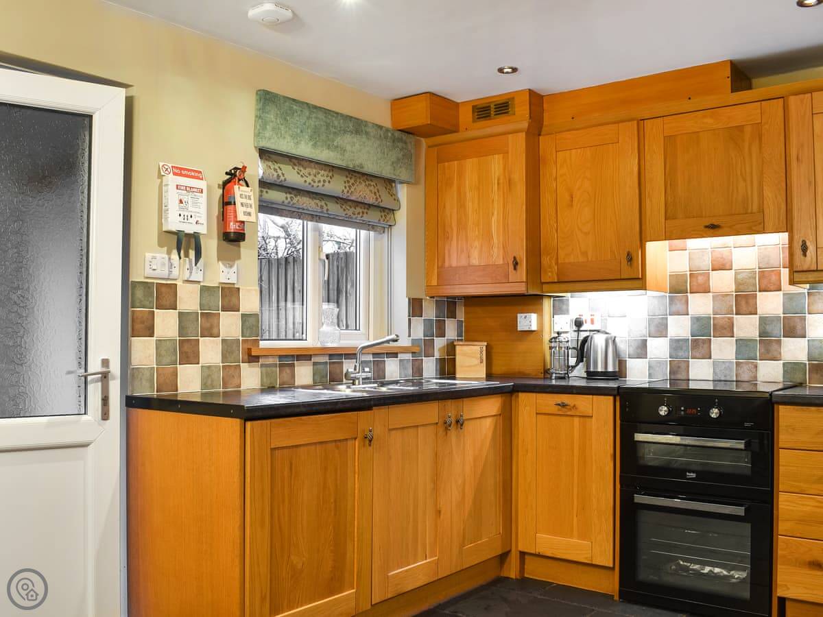 The sitting room has a wood-burning stove and a decent sized sofa. The kitchen has everything you'd need, and a table for four. There's a washing machine. Out the back is a small courtyard garden with a table and chairs. It gets the sun in the morning. There's an anchor point for bikes.