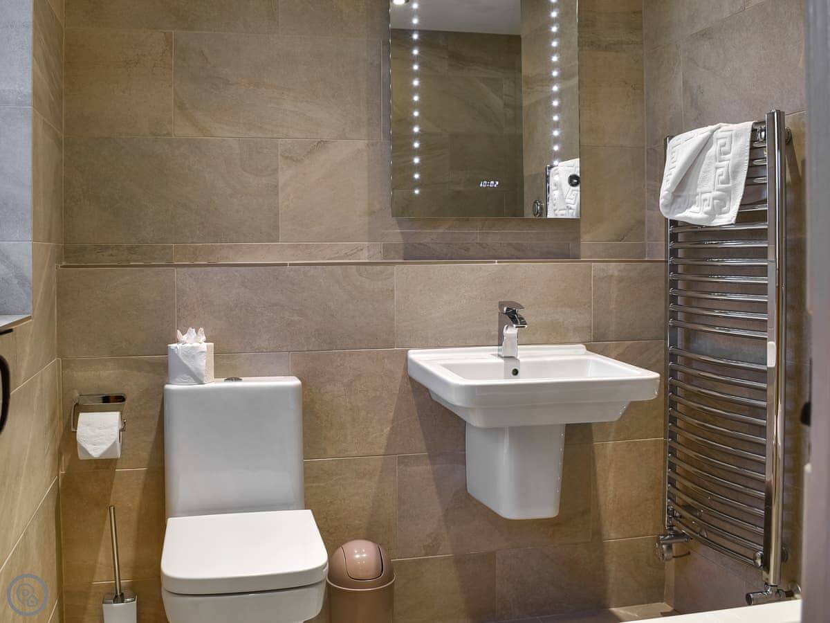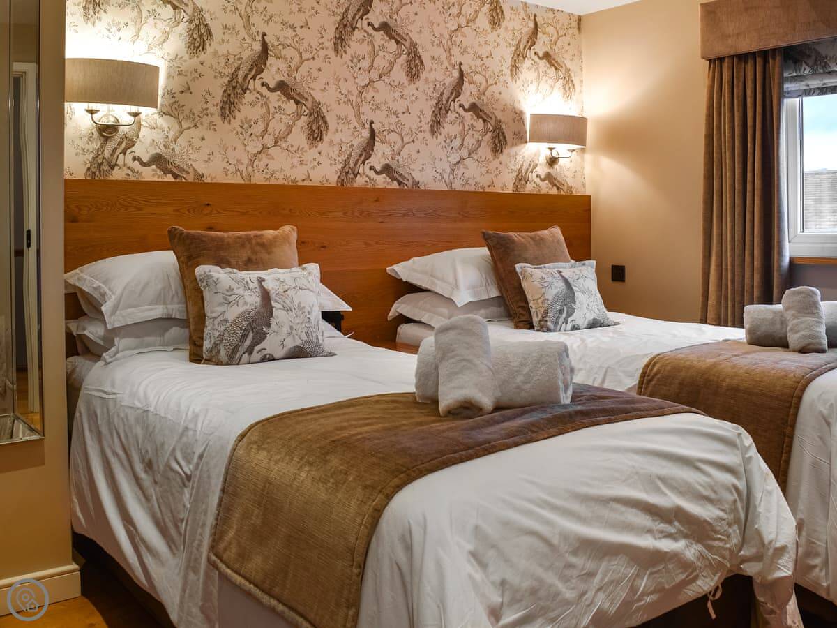It sleeps four. Two bedrooms, both with their own bathroom. One has a shower, the other a bath. It's a 4 Star place, so it's comfortable and well equipped.