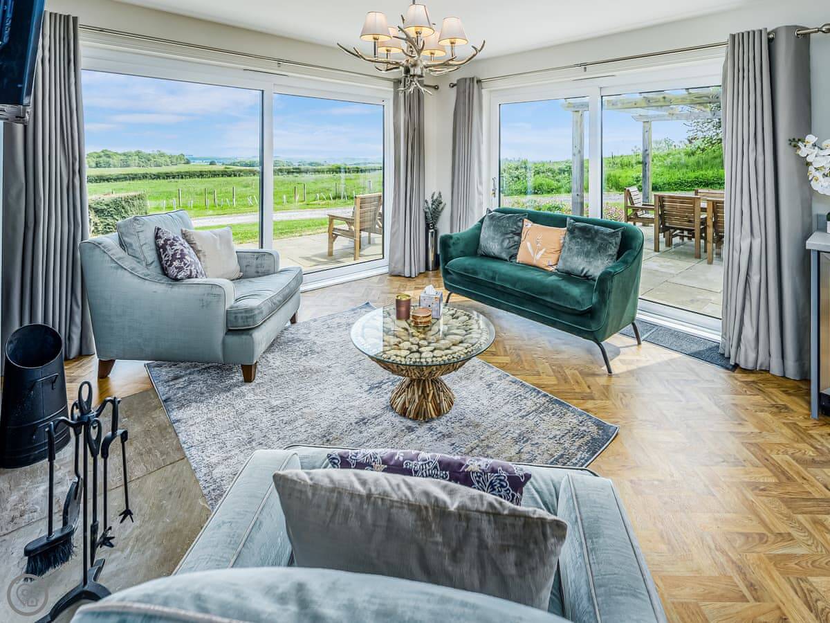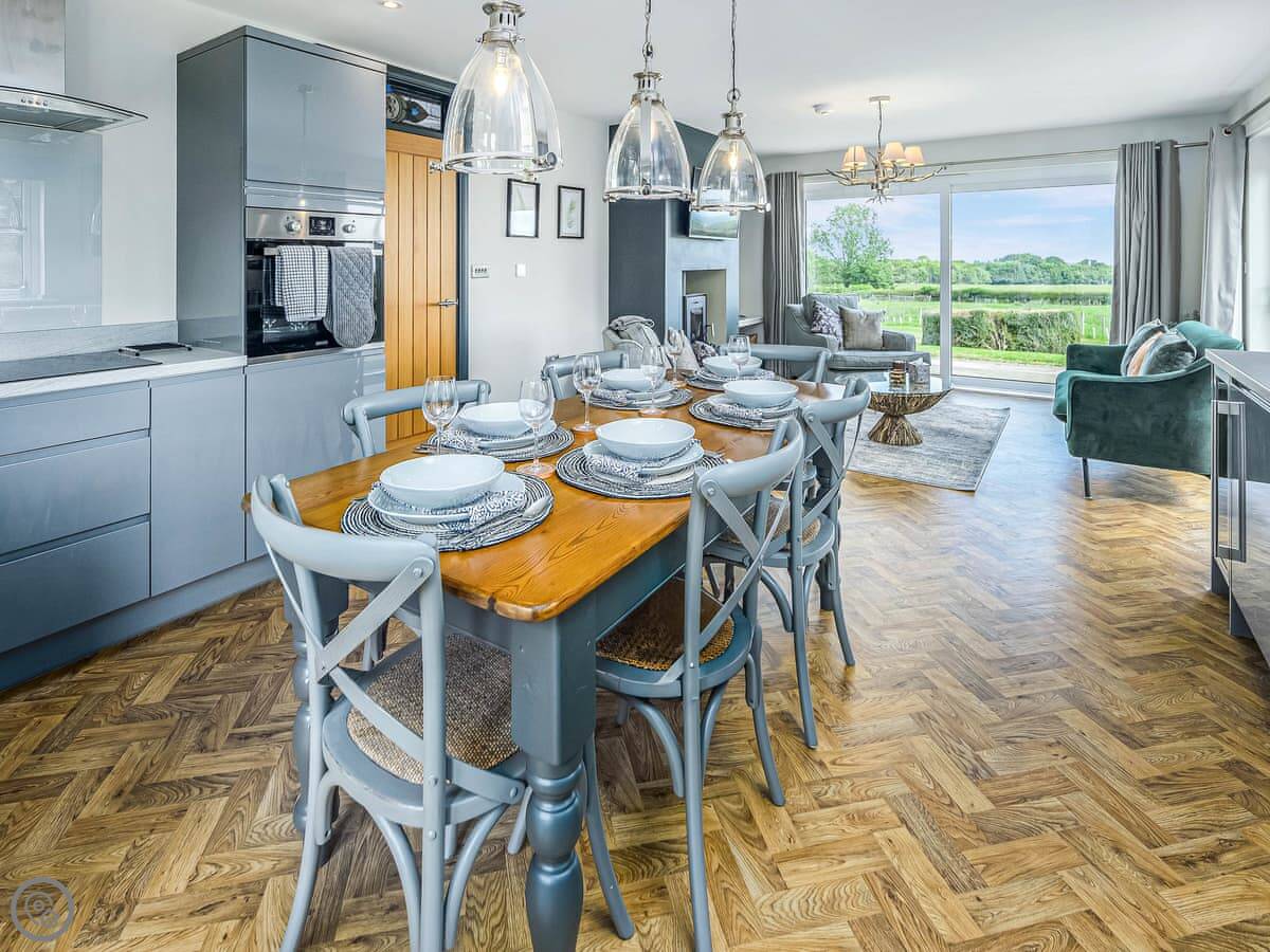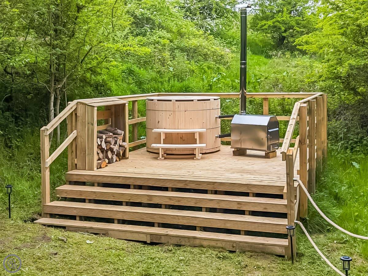 It has a wood burning stove, a hot tub in the garden, and a BBQ hut. The kitchen is open plan with a dining area. There's a second sitting room as well. Washing machine, dishwasher, WiFi, all that's included.