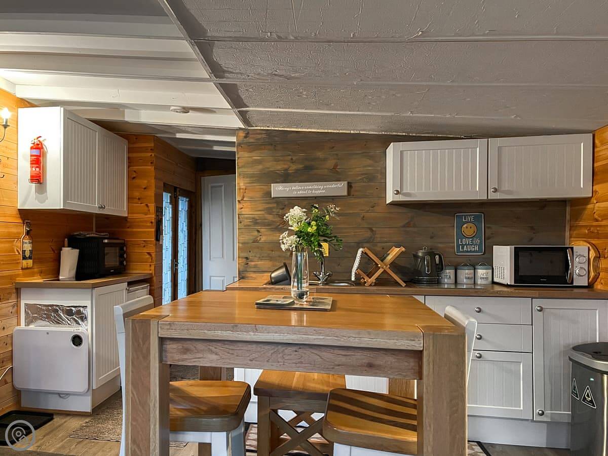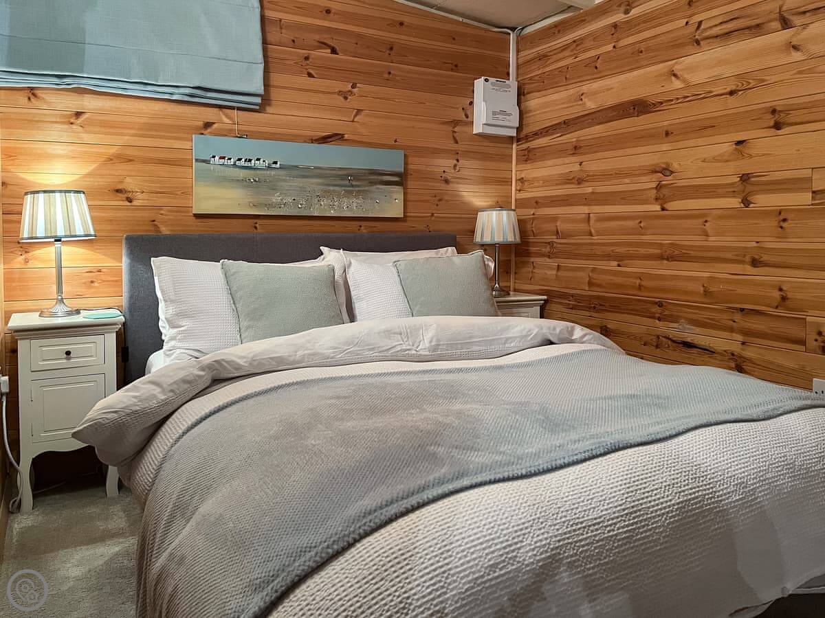 Inside it's all one room, with the kitchen, dining table and seating area together. It's newly furnished. There's a smart TV. The bedroom is through a door, it's a cosy double with good quality bedding. There's one shower room.