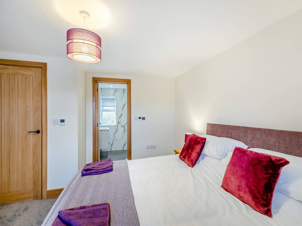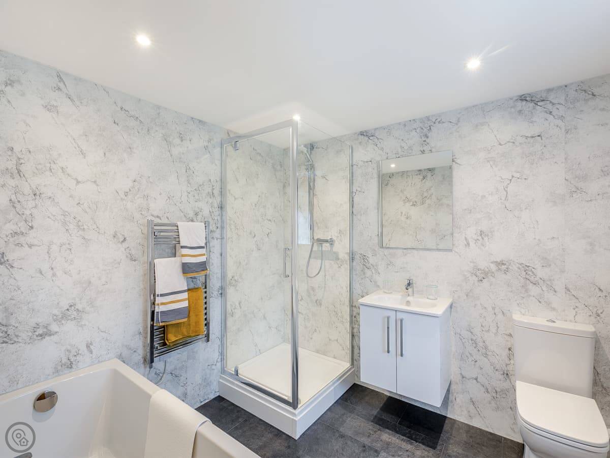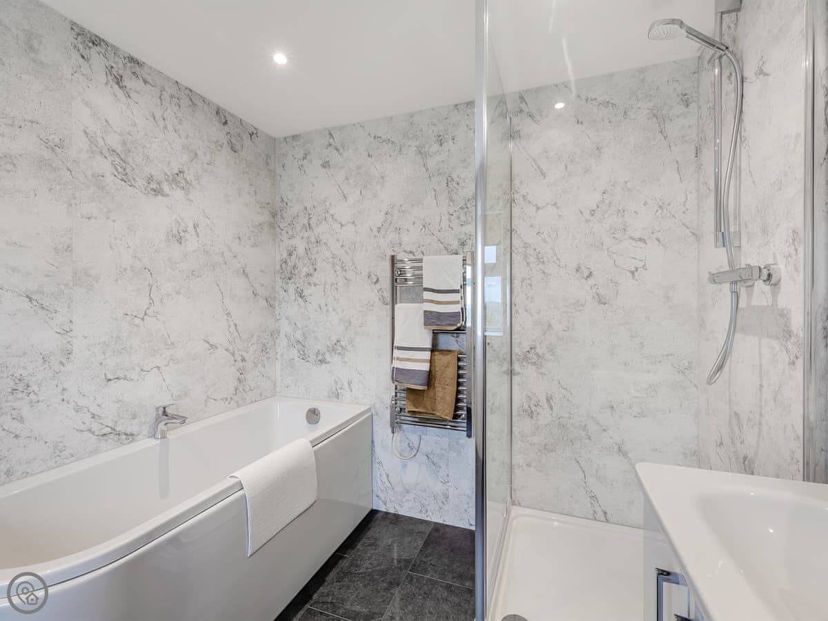 It sleeps four. Two bedrooms upstairs, both a good size. One has a double bed and its own bathroom. The other has two singles. There's a second family bathroom up there too, with a bath and a separate shower. The underfloor heating is on both floors, so it's warm underfoot.
