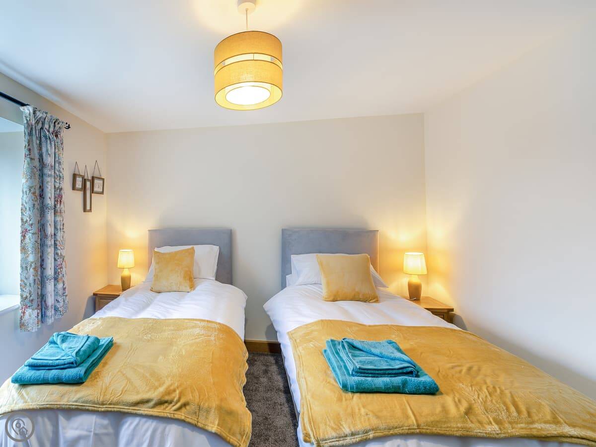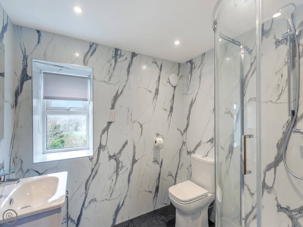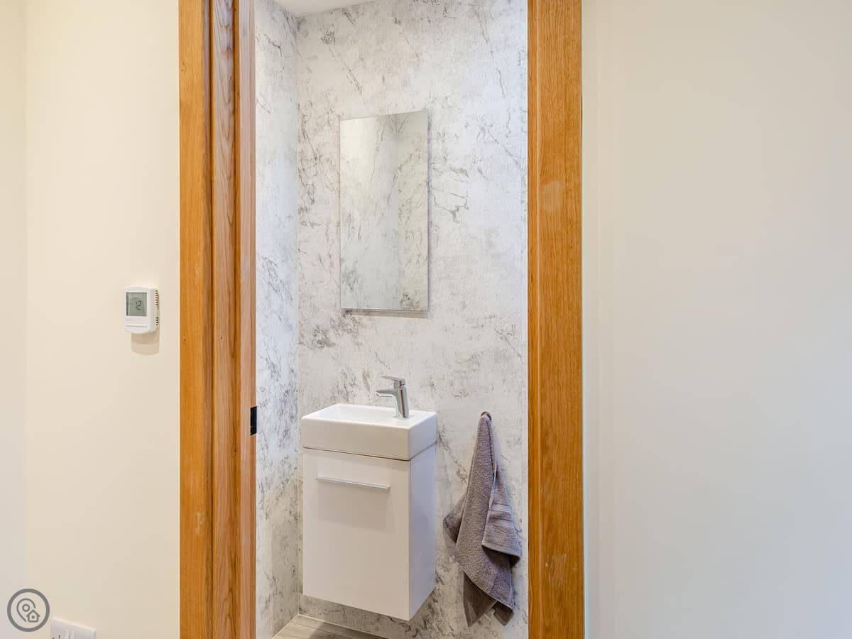 It sleeps four. Two bedrooms upstairs, both a good size. One has a double bed and its own bathroom. The other has two singles. There's a second family bathroom up there too, with a bath and a separate shower. The underfloor heating is on both floors, so it's warm underfoot.