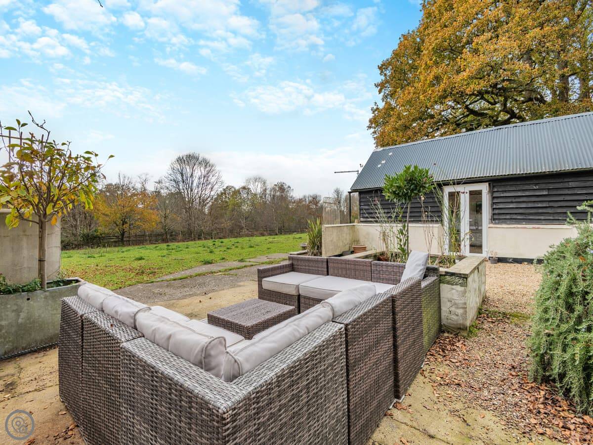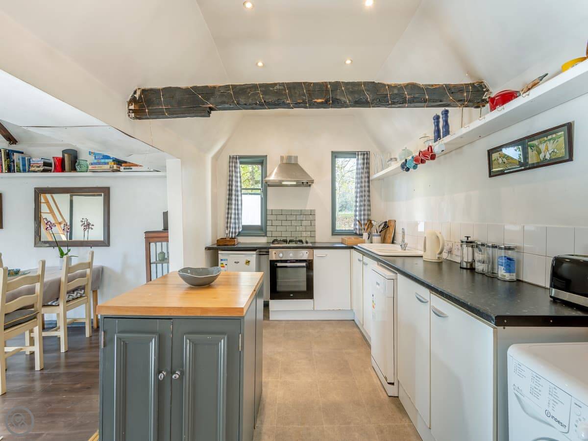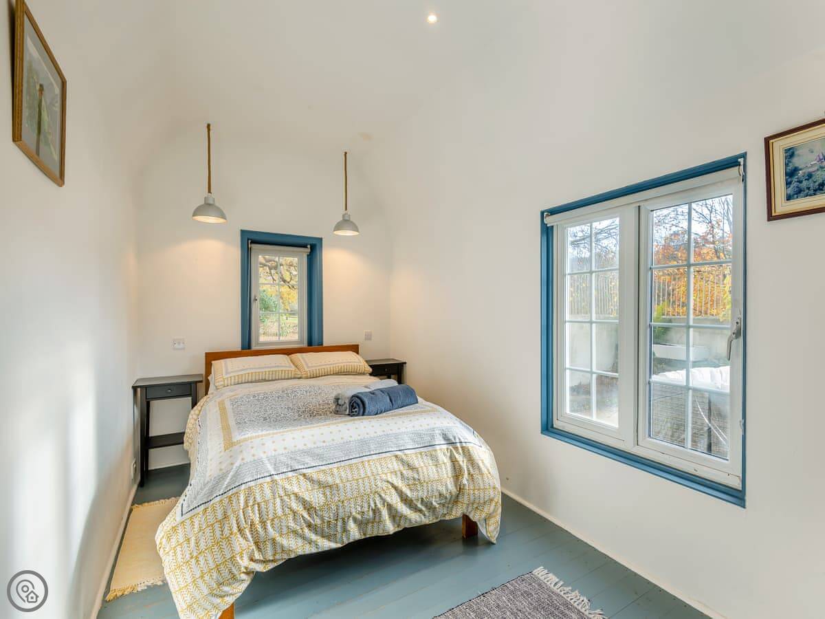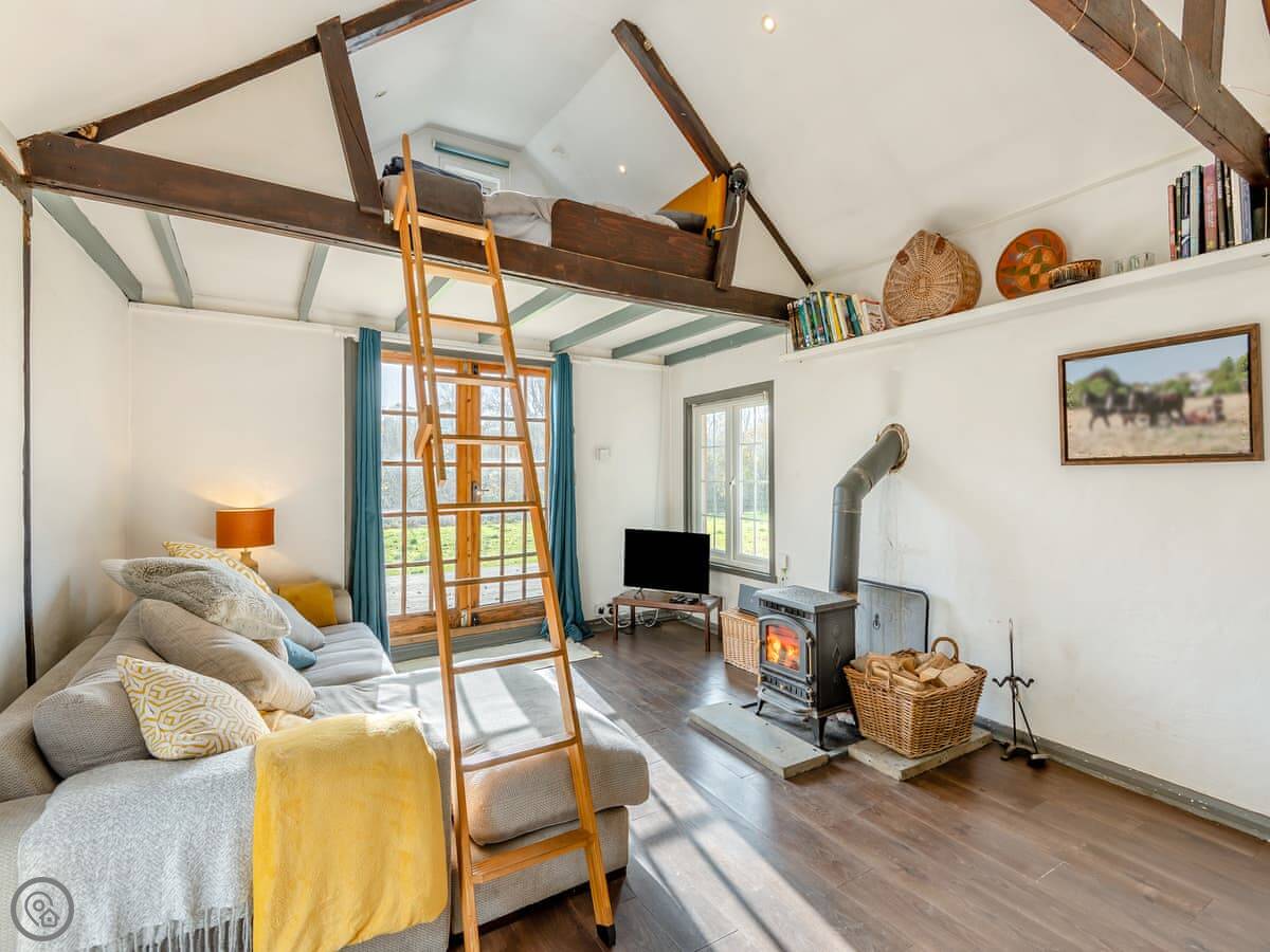 The main room is open plan. There's a wood burner for chilly evenings. French doors open onto a private courtyard garden, which is nice. Beyond that are bigger gardens and some woods you can walk in.