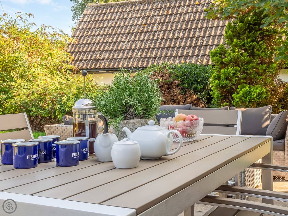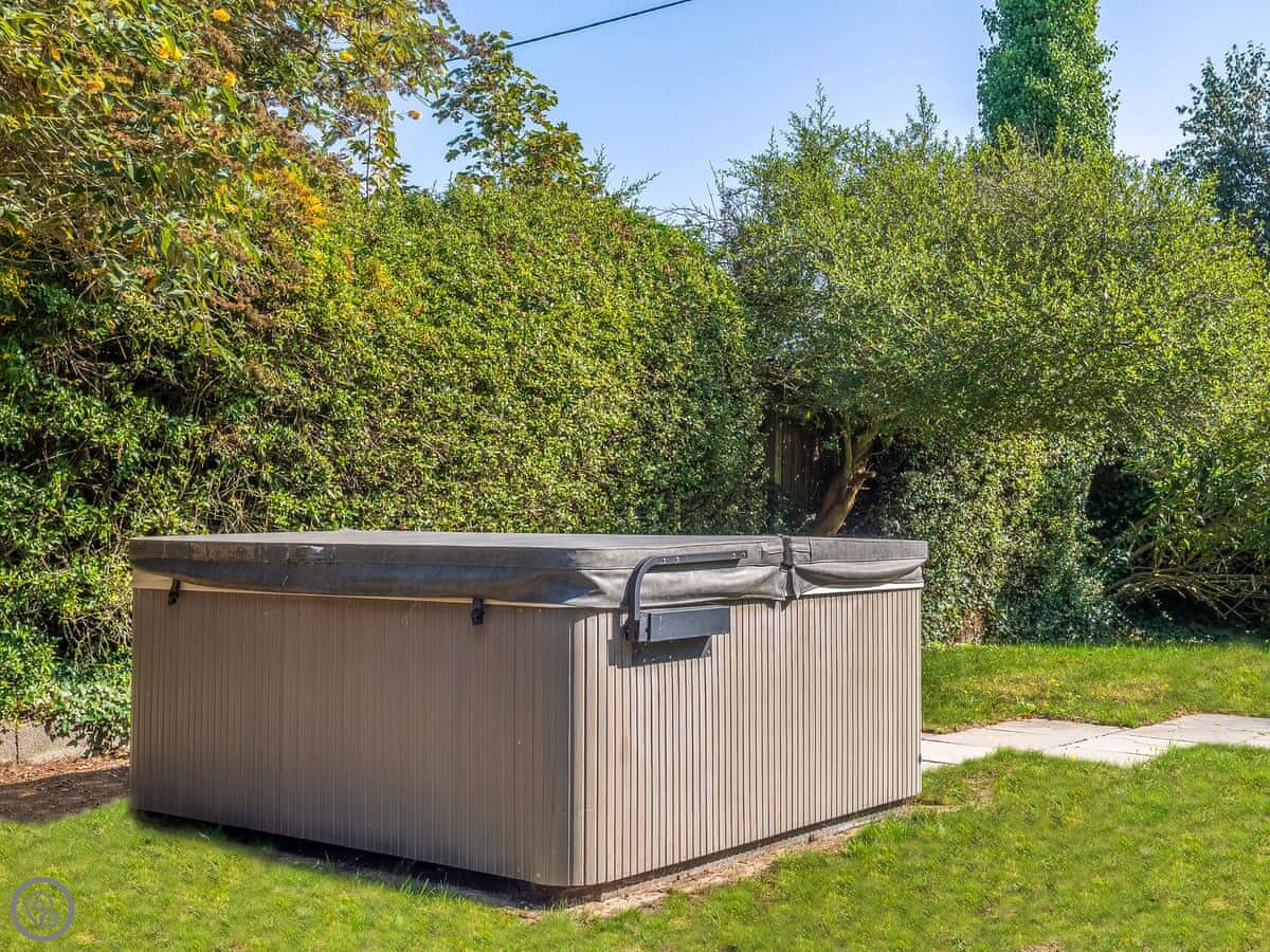 The garden is fully enclosed, with a lawn, a patio with a table, and a hot tub. The hot tub is for four people, electric, and there's an extra charge to use it.