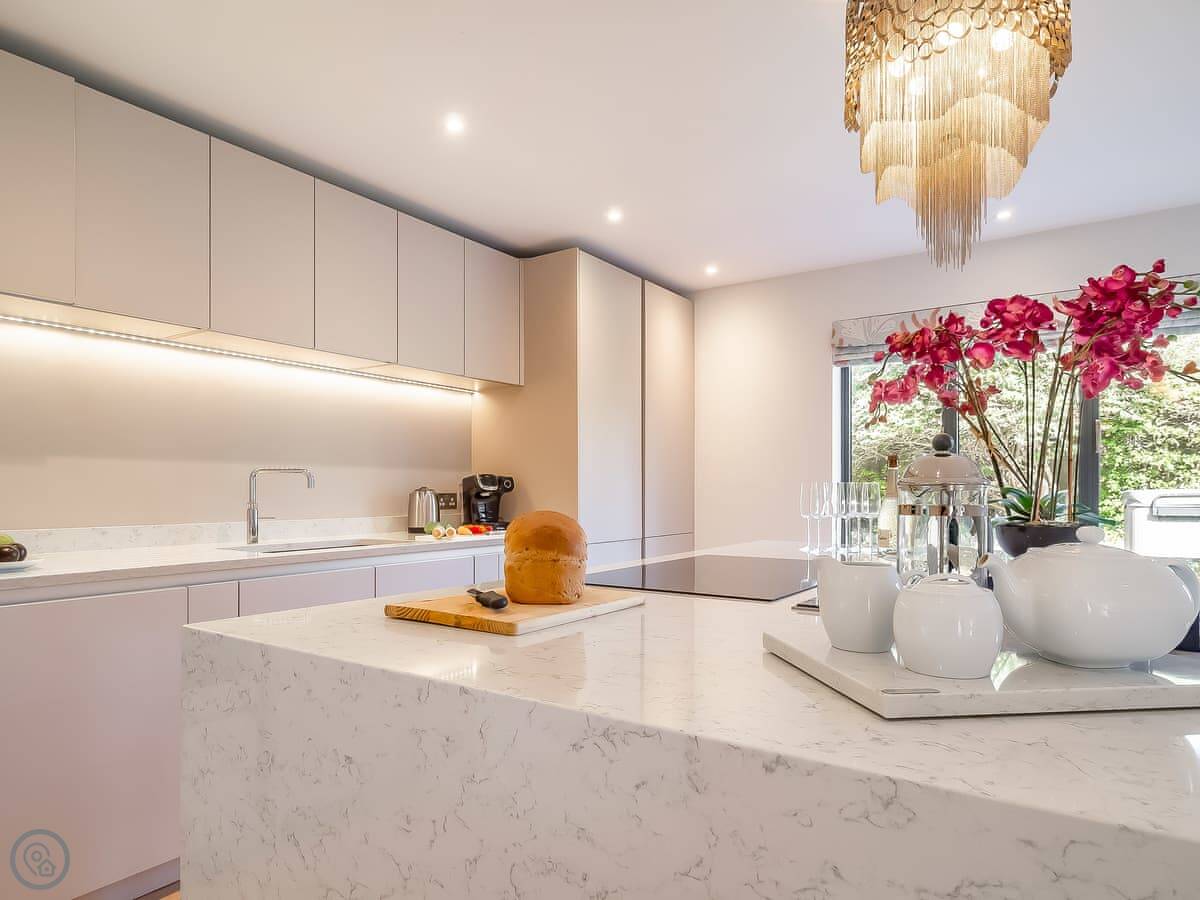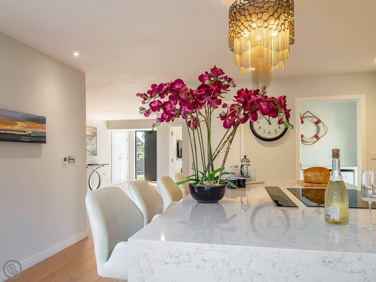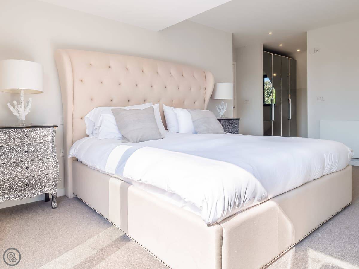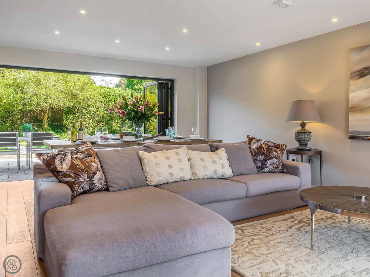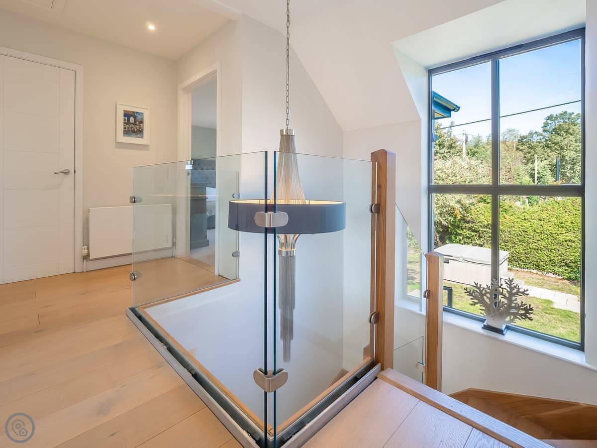It's got a 5 Star rating, which means it's well-equipped and finished to a high standard. The living areas are open plan with big windows. The kitchen has all the appliances you'd need. The main bedroom has a glass balcony looking over the garden.