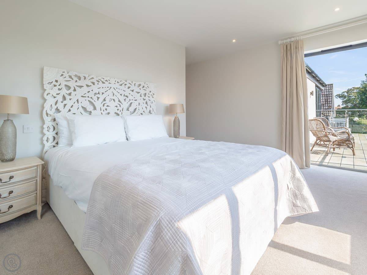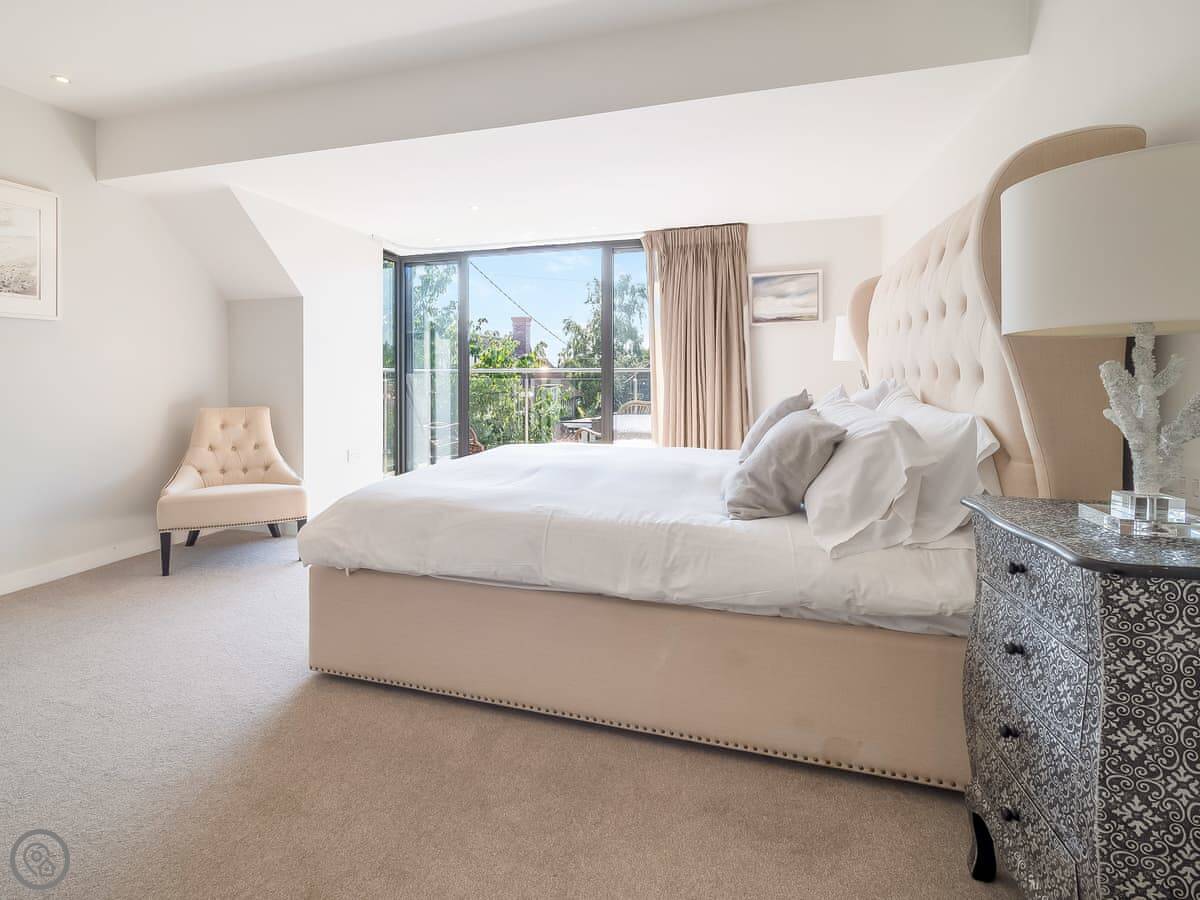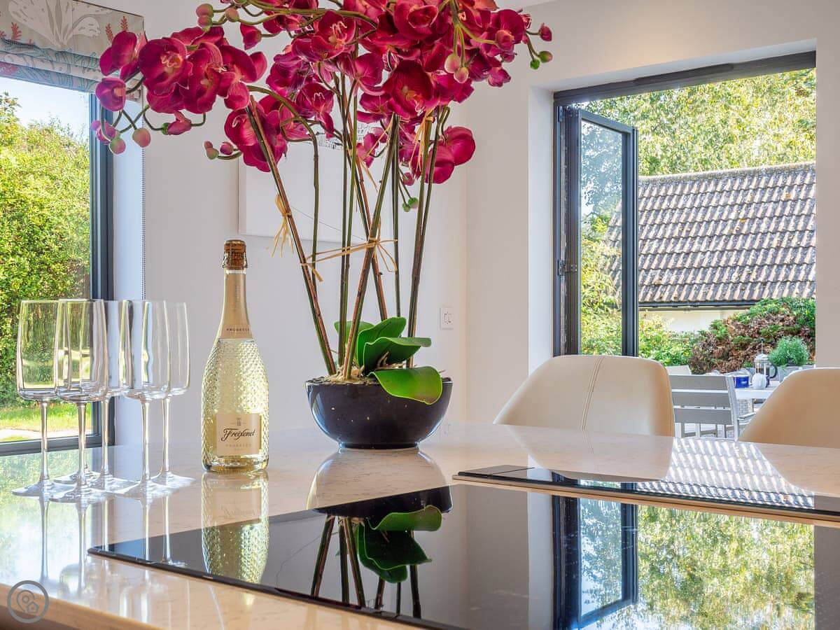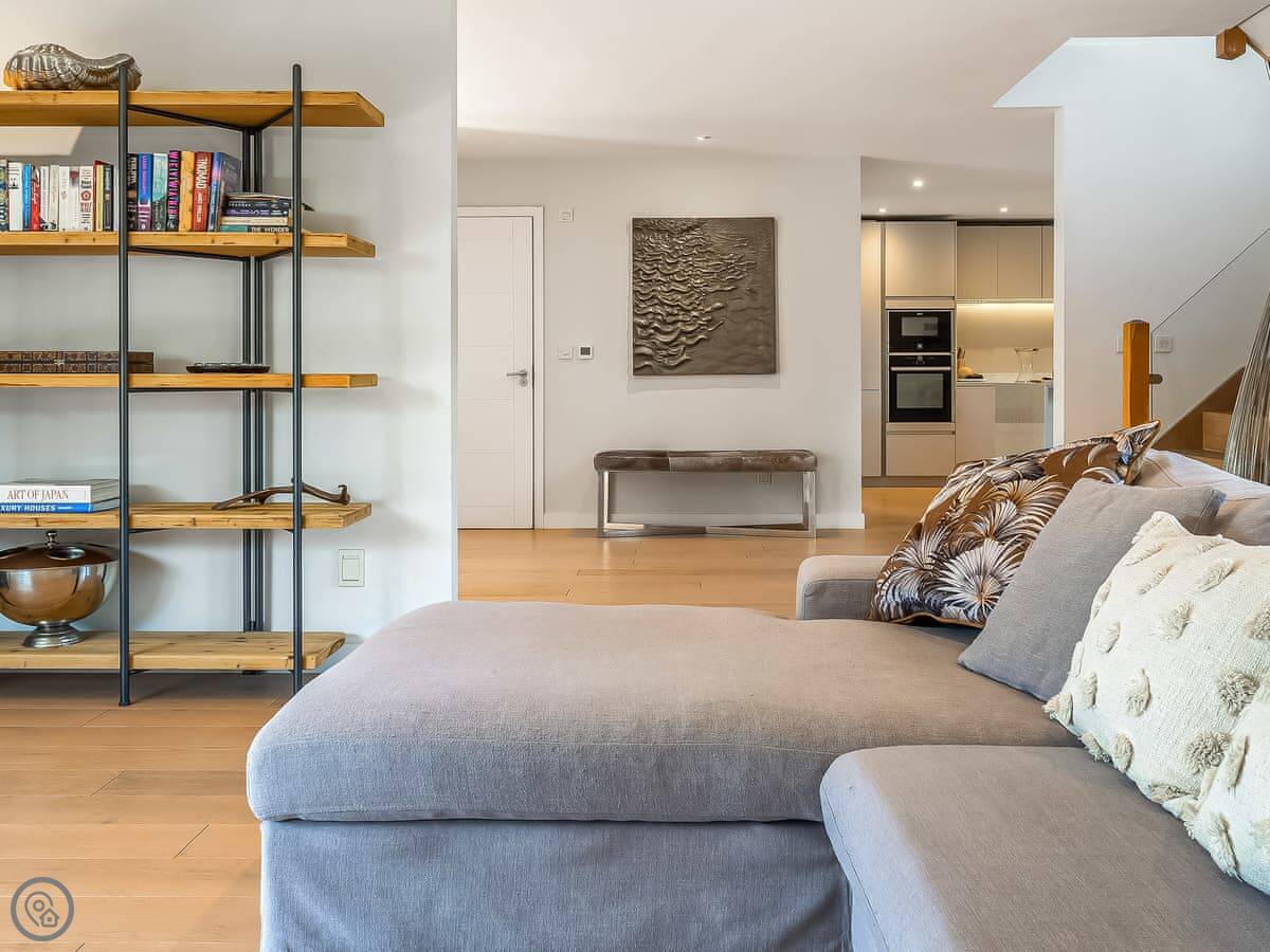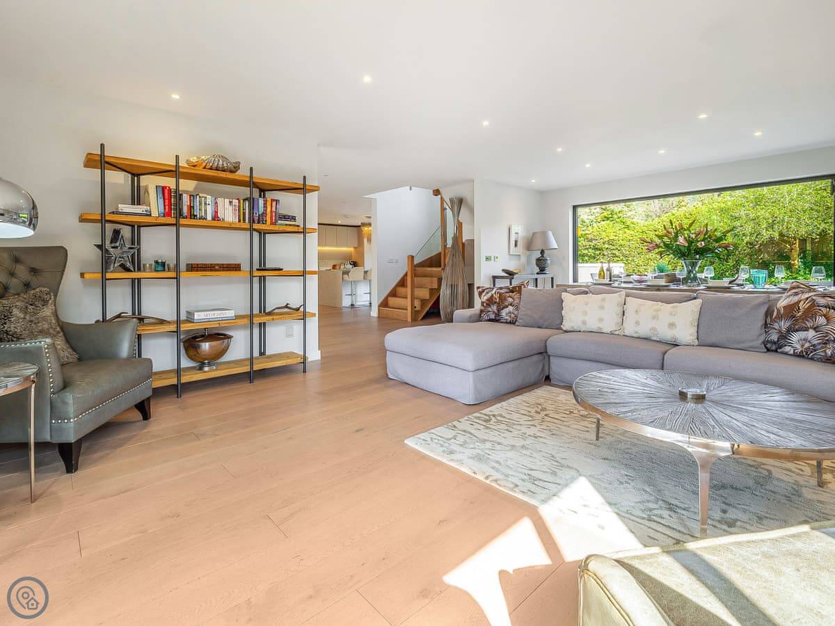 It's got a 5 Star rating, which means it's well-equipped and finished to a high standard. The living areas are open plan with big windows. The kitchen has all the appliances you'd need. The main bedroom has a glass balcony looking over the garden.