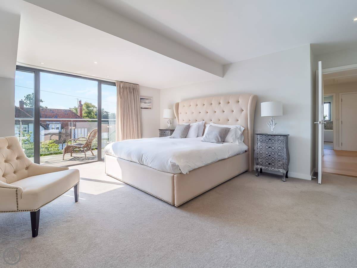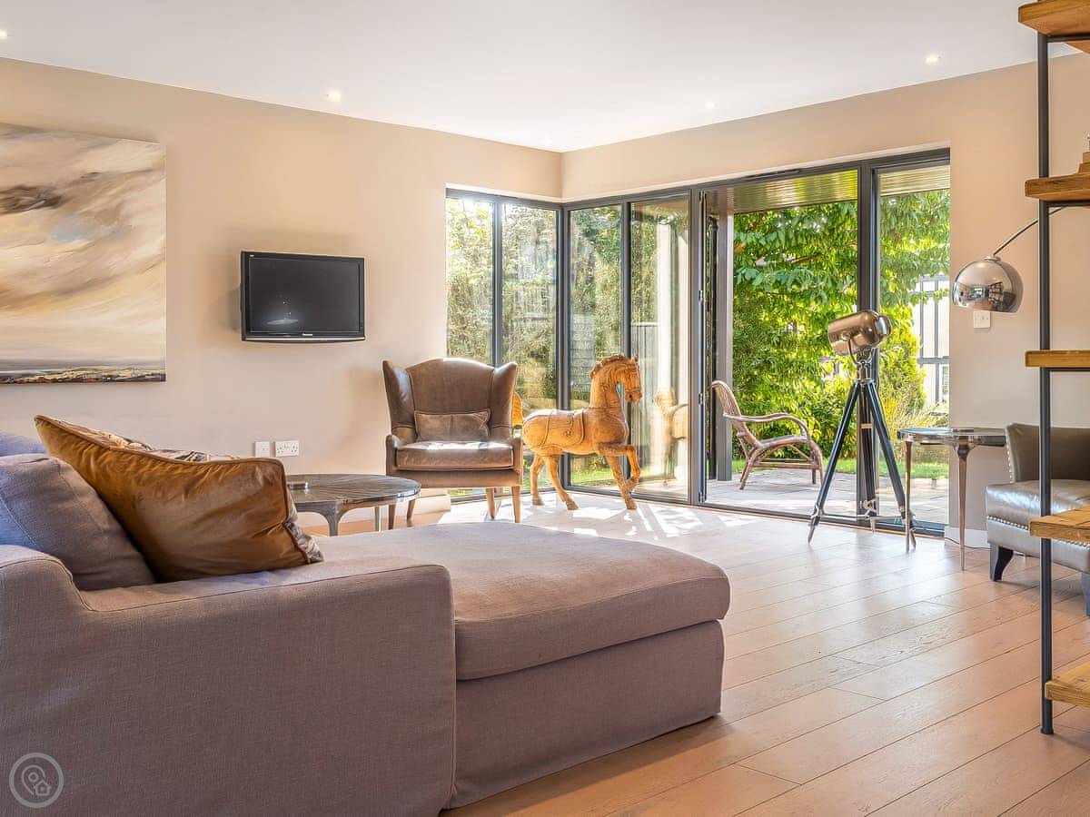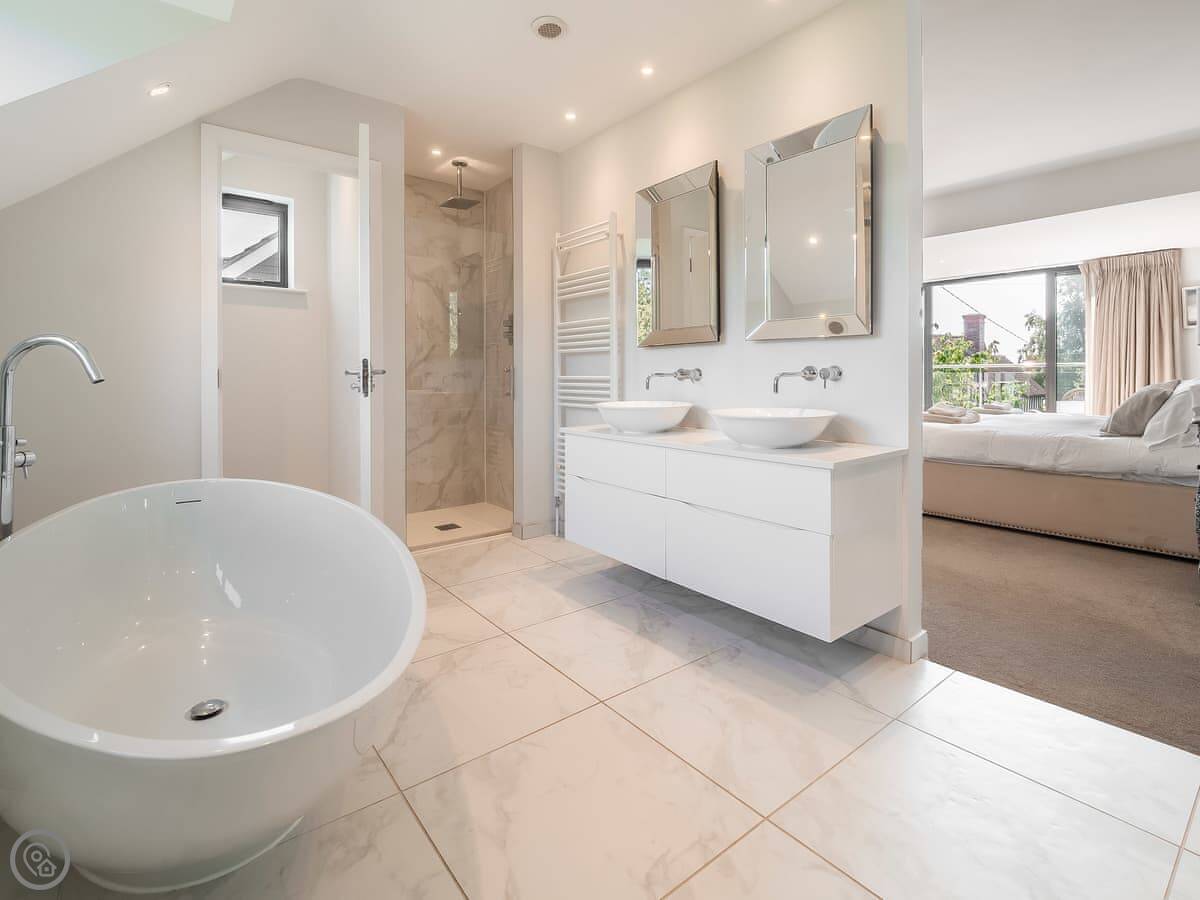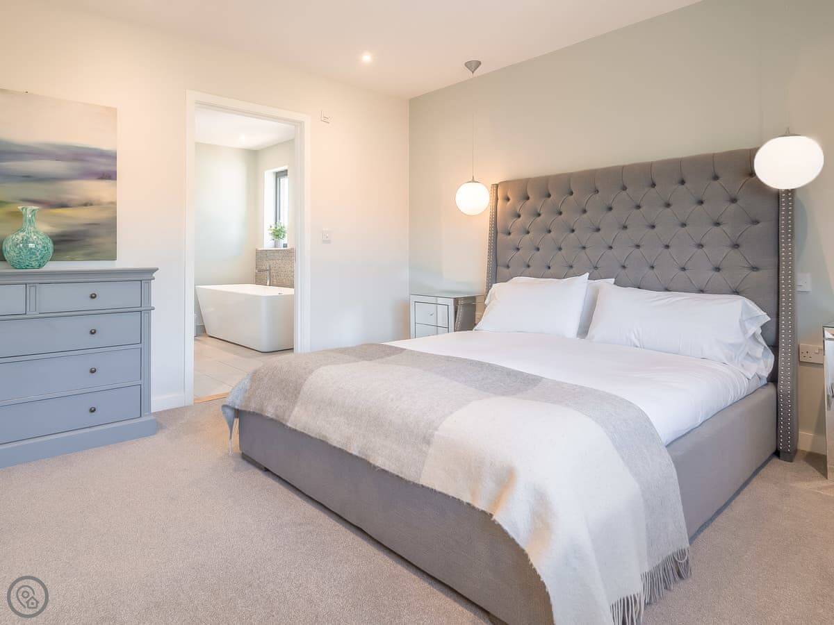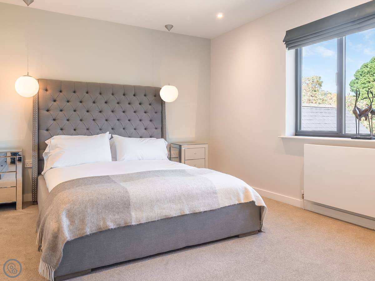 It's got a 5 Star rating, which means it's well-equipped and finished to a high standard. The living areas are open plan with big windows. The kitchen has all the appliances you'd need. The main bedroom has a glass balcony looking over the garden.