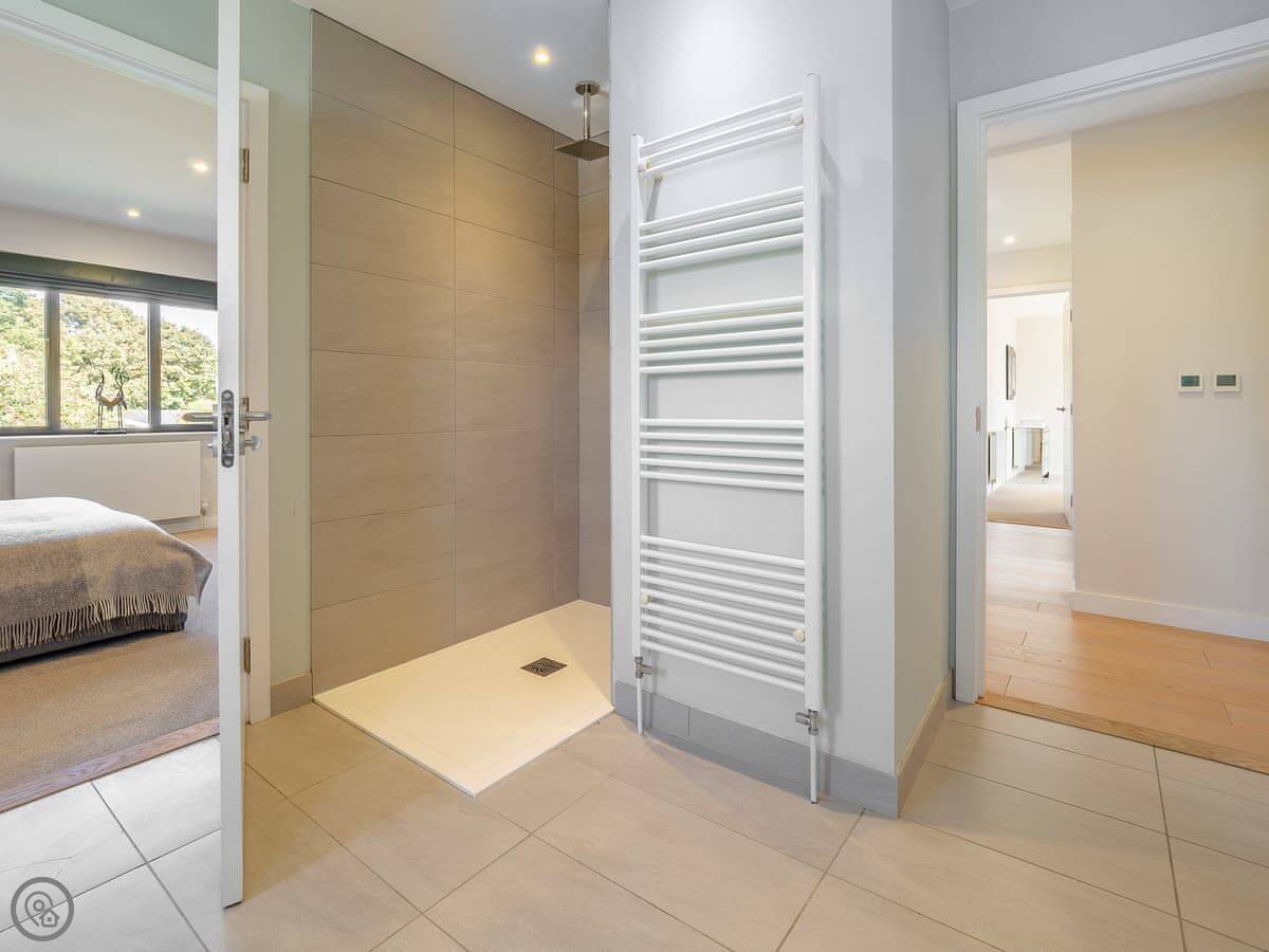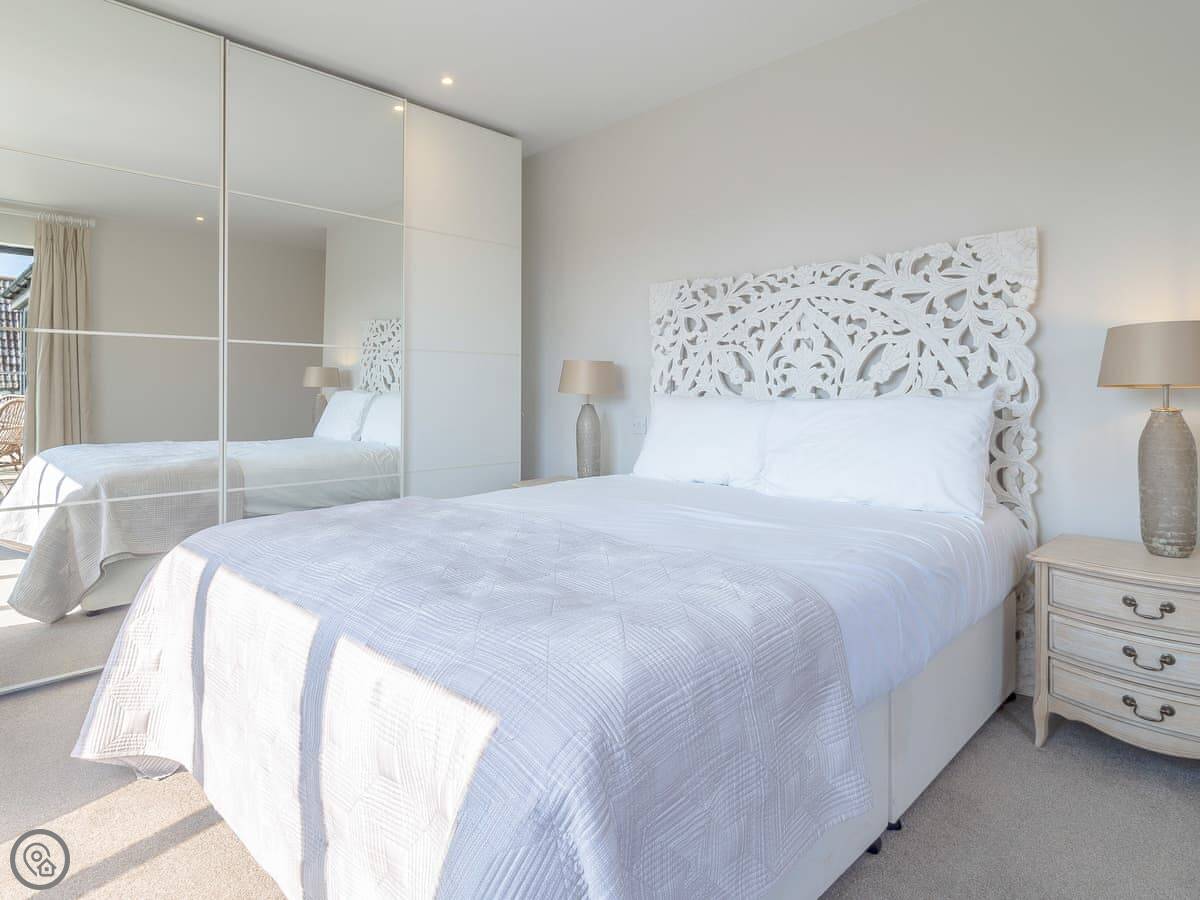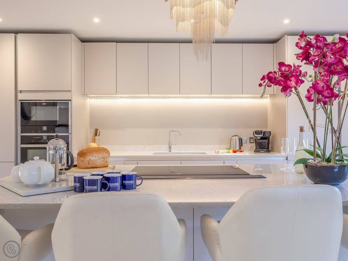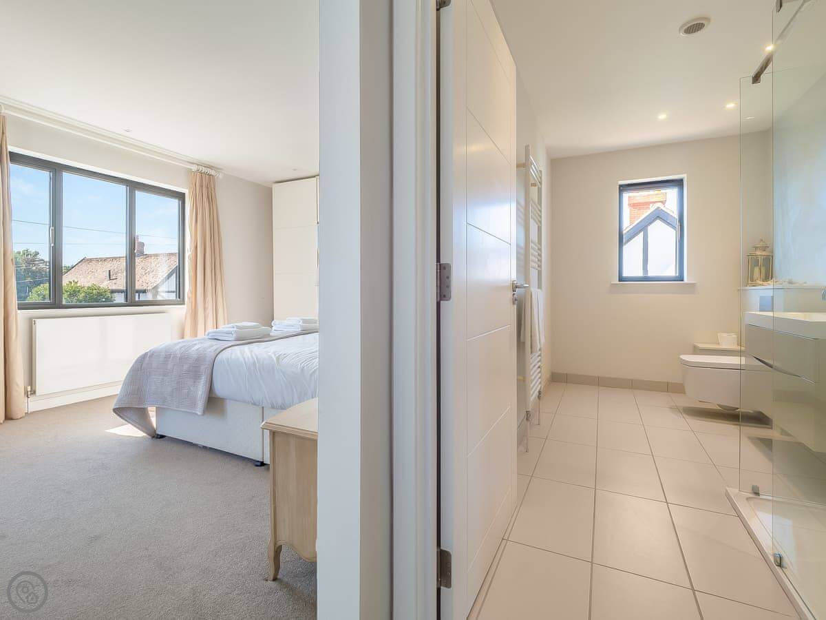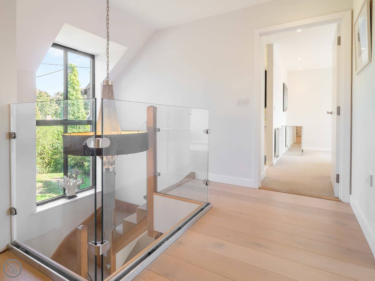 It's got a 5 Star rating, which means it's well-equipped and finished to a high standard. The living areas are open plan with big windows. The kitchen has all the appliances you'd need. The main bedroom has a glass balcony looking over the garden.