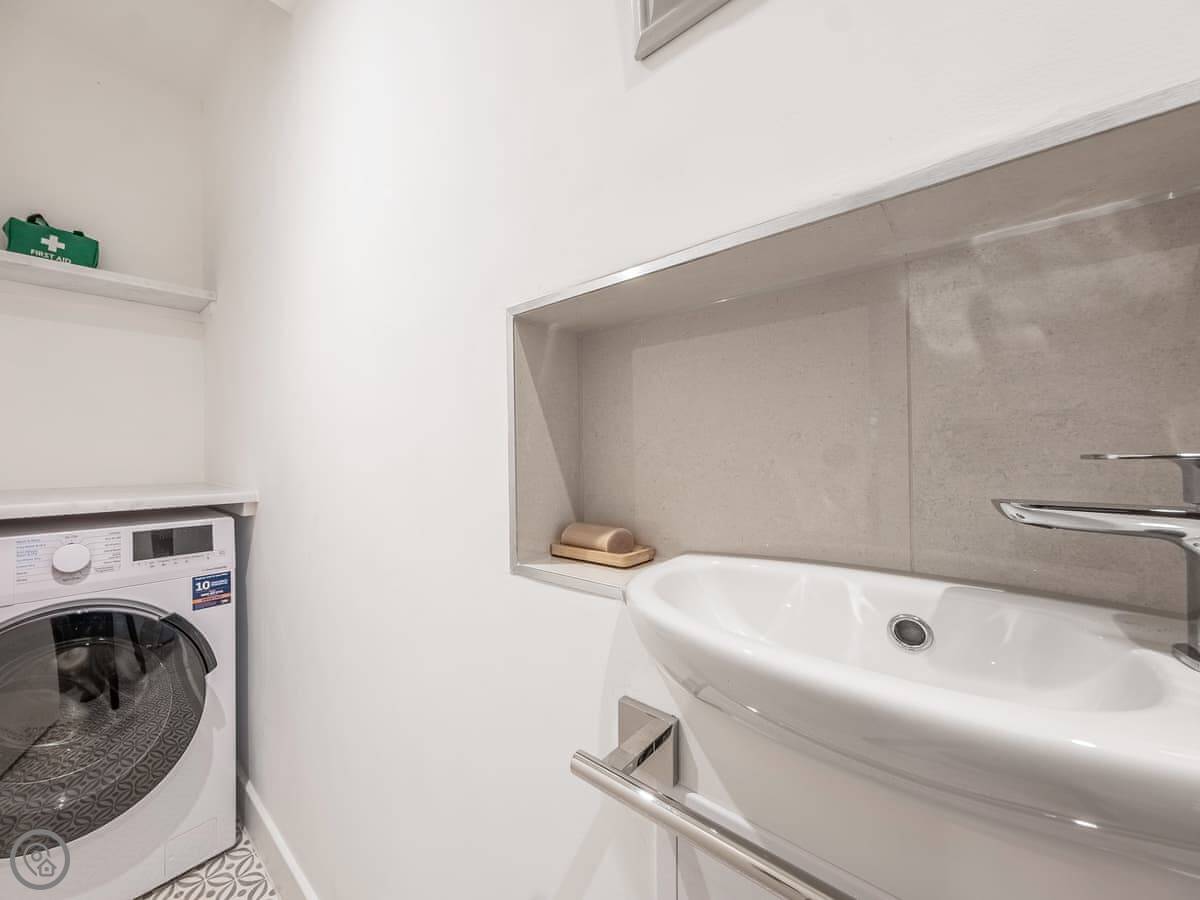 It sleeps four. Two bedrooms upstairs and one bathroom. It's a 5 Star place, so it's very well finished and comfortable. Everything is included, like bedding and towels. There's a dishwasher, Wi-Fi, and parking right there.