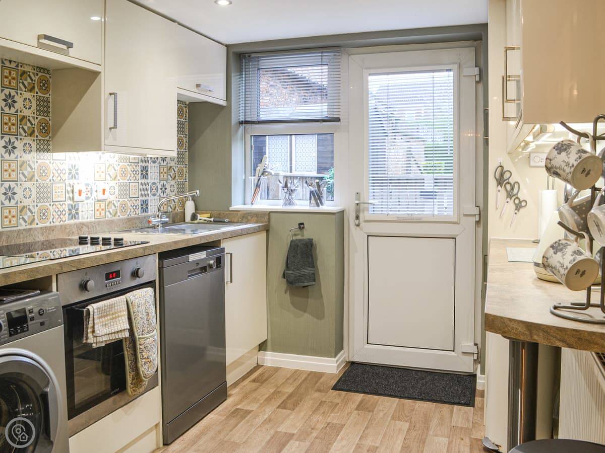 Out the back is a small, enclosed patio. It's private. You can bring up to two dogs. There's a washing machine, and bedding and towels are included.