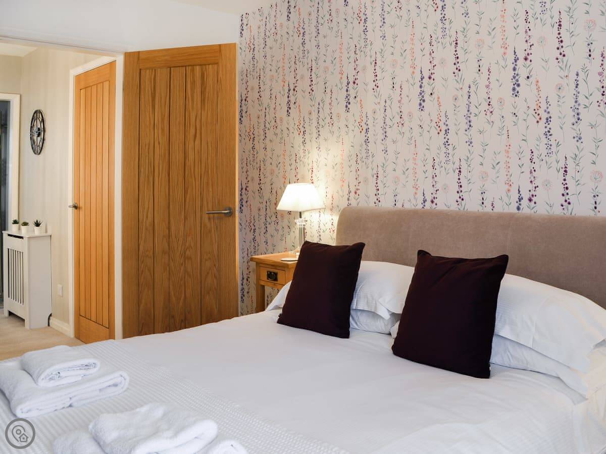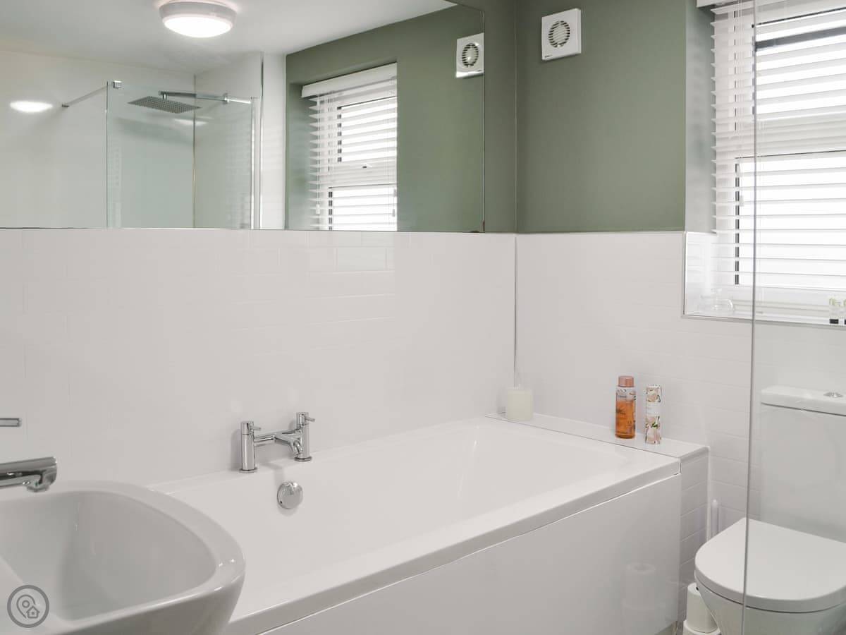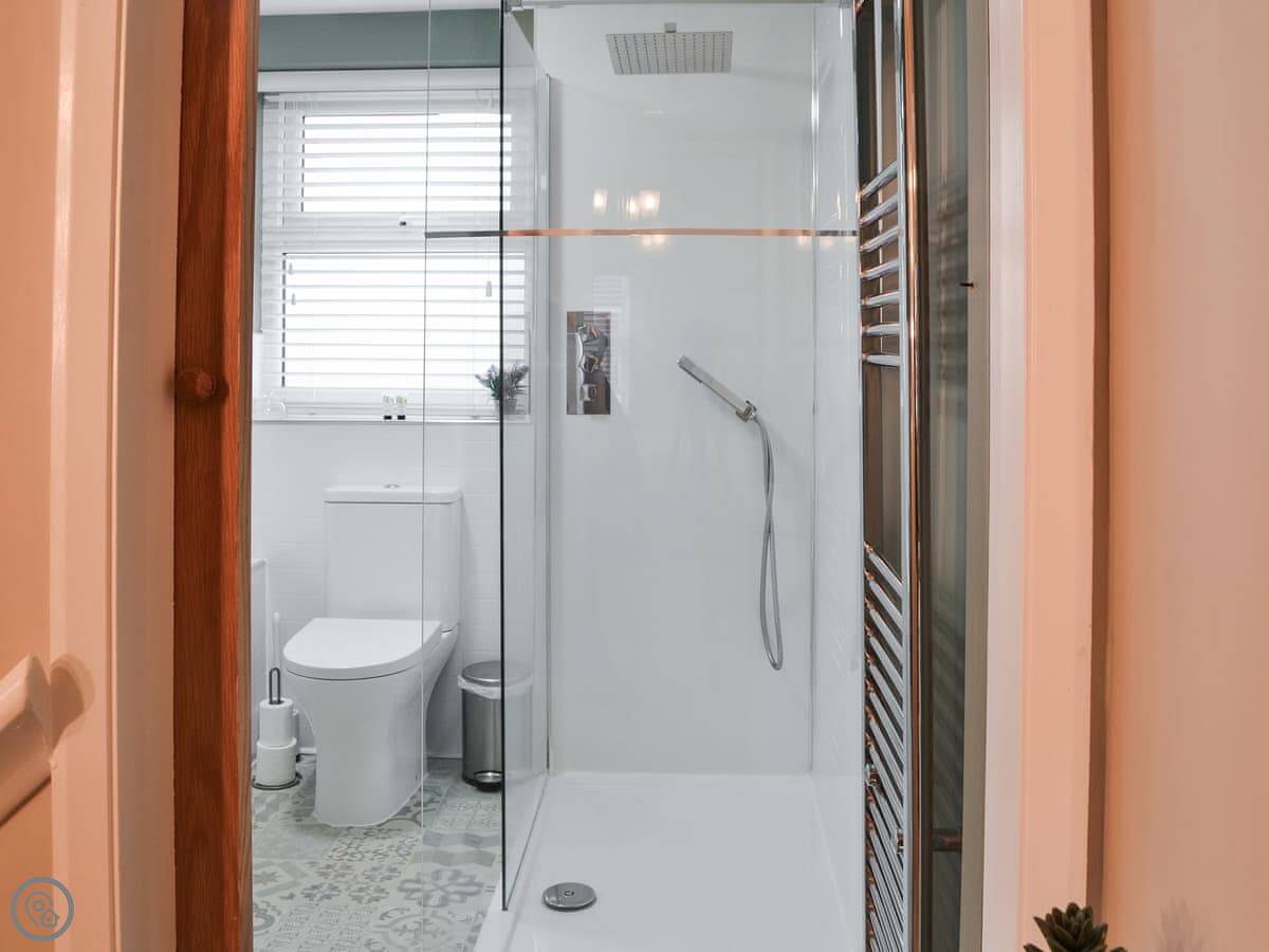 The cottage is all on two floors. Downstairs is the living room with a table for two, and the kitchen leads off from it. Upstairs is the bedroom with a king-size bed and the bathroom, which has both a bath and a shower.