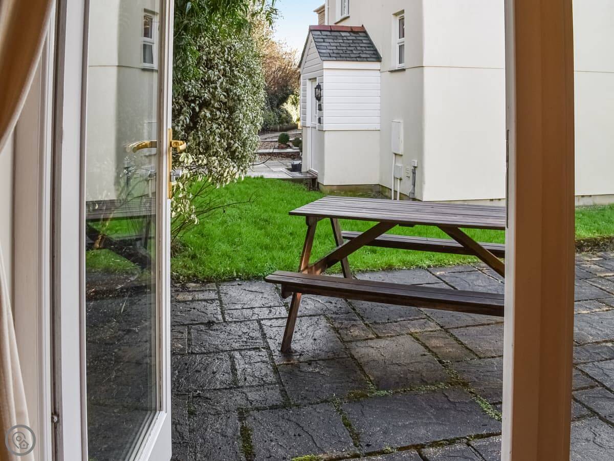 The living area is open plan. You've got a kitchen at one end, then the sofas and dining table. Doors open out to a small patio with a table and a BBQ, which is yours to use. It's south-facing, so it gets the sun. The garden beyond that is shared with the other cottages, but your patio is private.