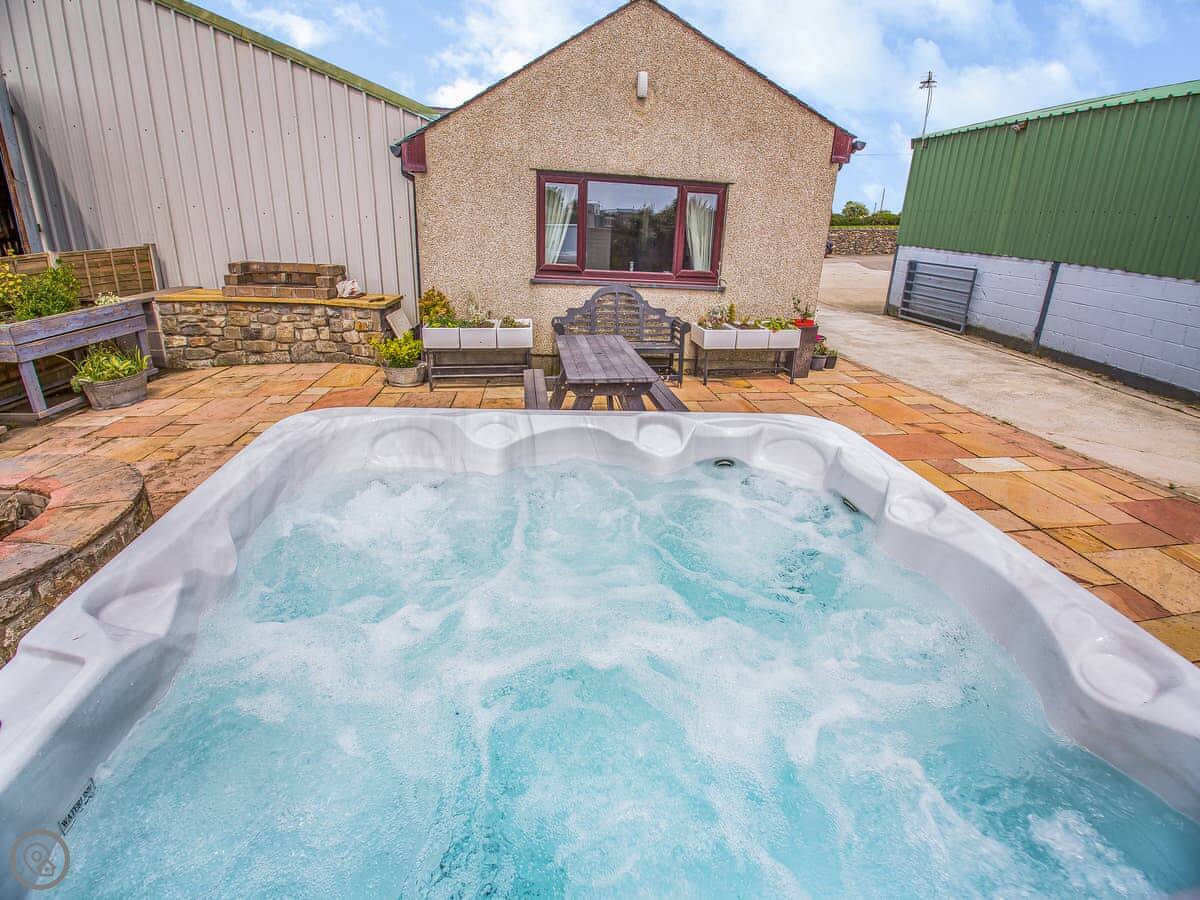 You've got two living areas, which helps if people want to do different things. There's a dining table in one and a gas fire. The kitchen looks out to the garden. Outside, there's a patio, garden furniture, a BBQ, and a hot tub.