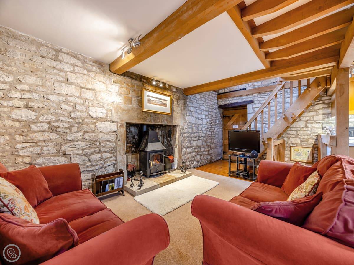 Downstairs there's a bedroom with a kingsize bed and the bathroom. Upstairs is all one room: the kitchen, a table, and the sitting area with a wood burner. There's a TV. The second bedroom is up another flight of stairs, it's a twin room under the eaves.