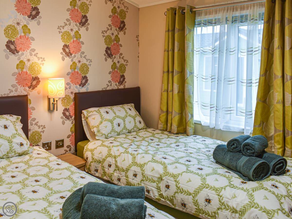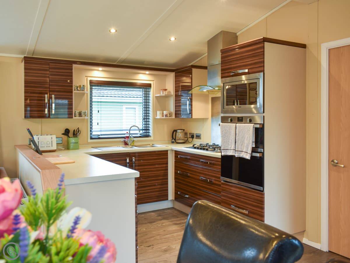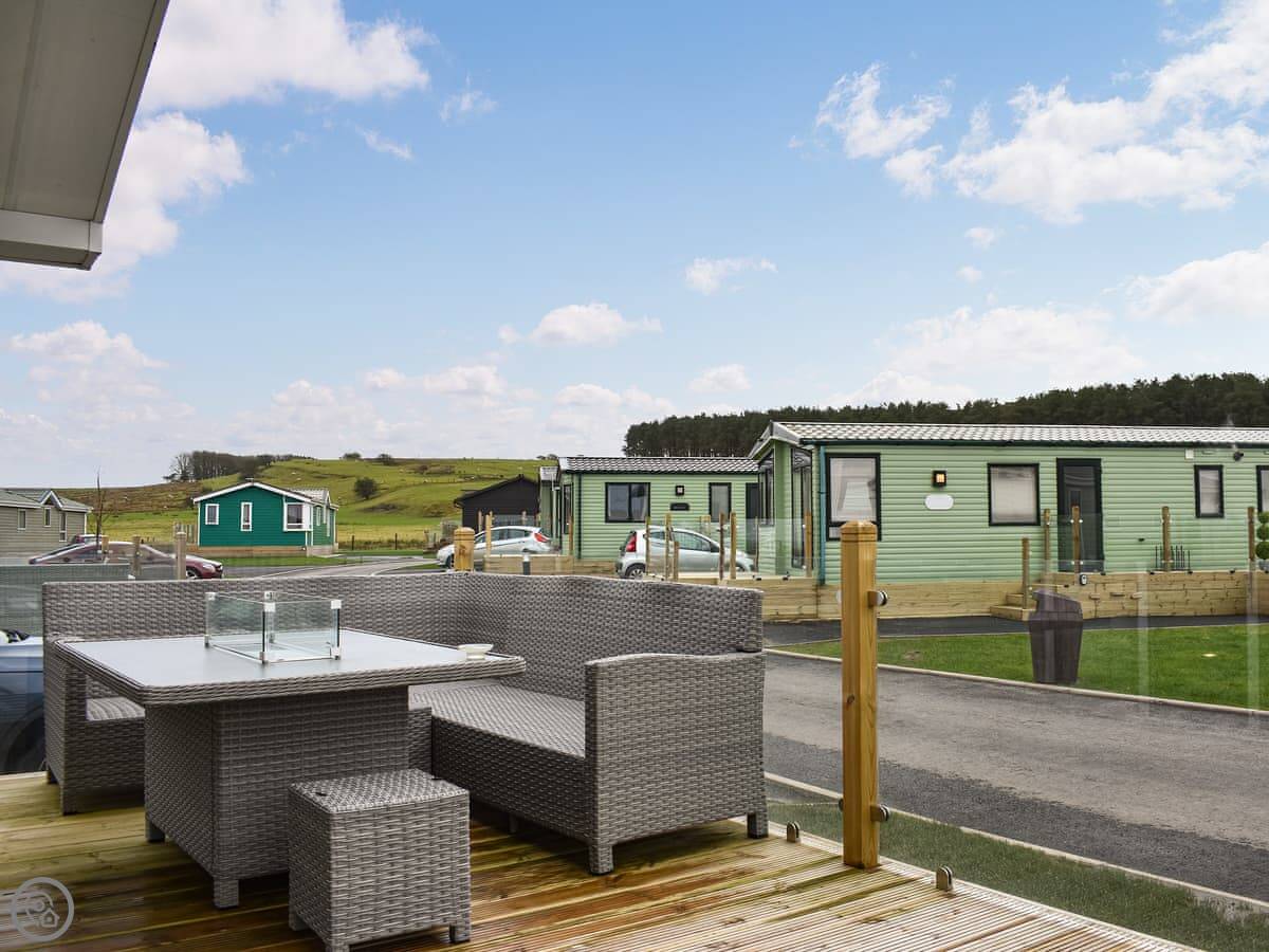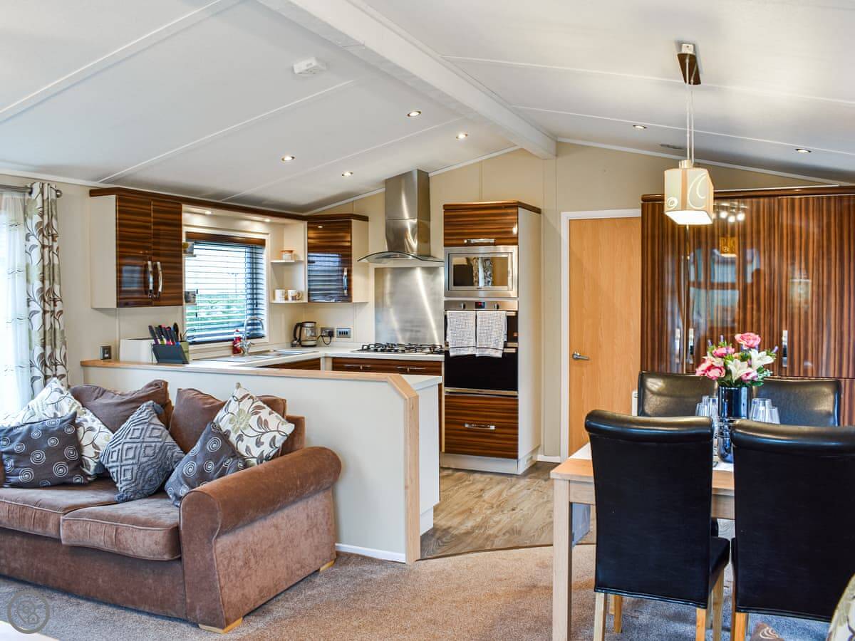 It sleeps four. Two bedrooms and two bathrooms, which is handy. One bedroom has a kingsize bed and its own ensuite. The other has twins. There's an open plan living area with a kitchen and dining space, and French doors that open onto the decking. The deck wraps around the side a bit. The garden is enclosed, so it's secure for a dog or kids.