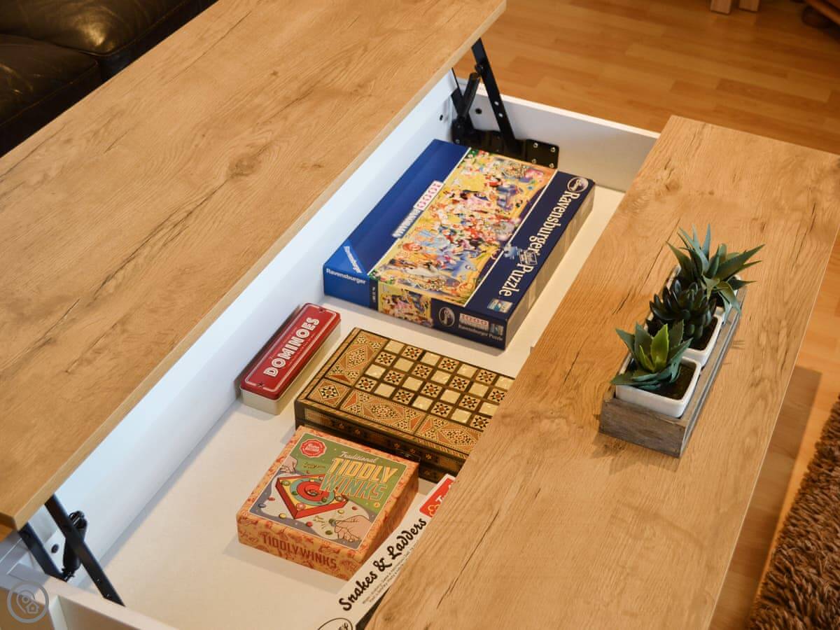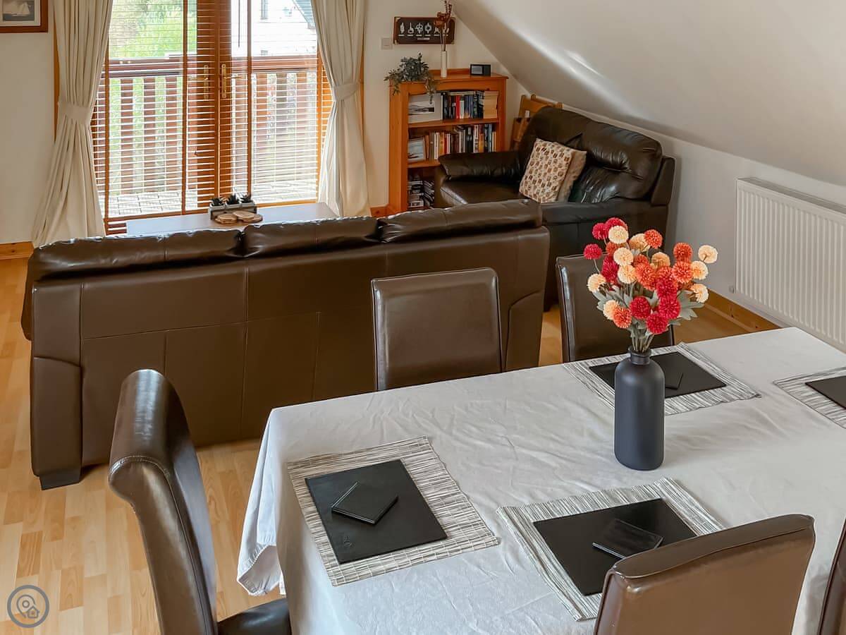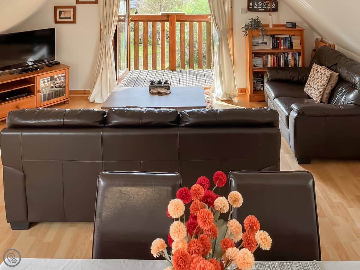 The main living area is upstairs. It's open-plan, with a kitchen and a sitting area. There's a balcony. The view from up there is good, you can see the water. Downstairs is a decked area too, if you want to sit outside.