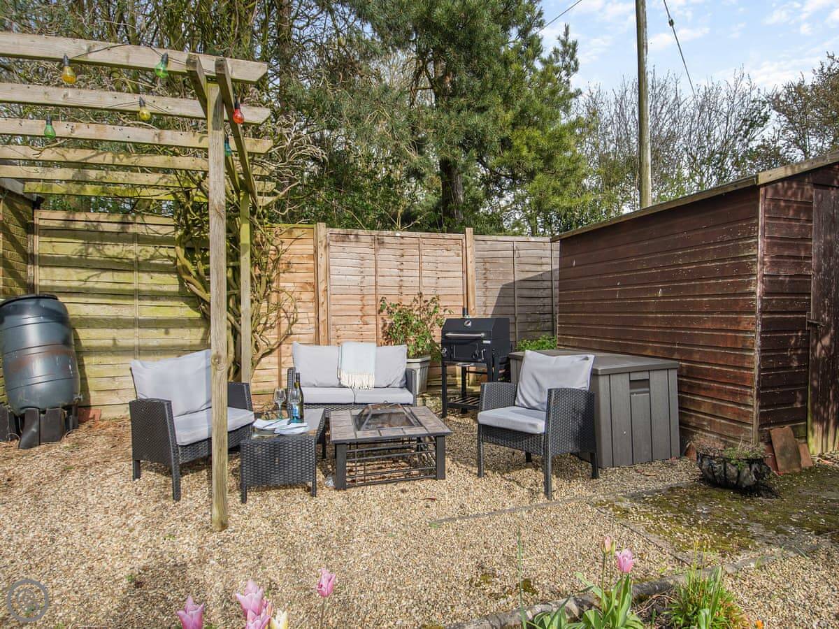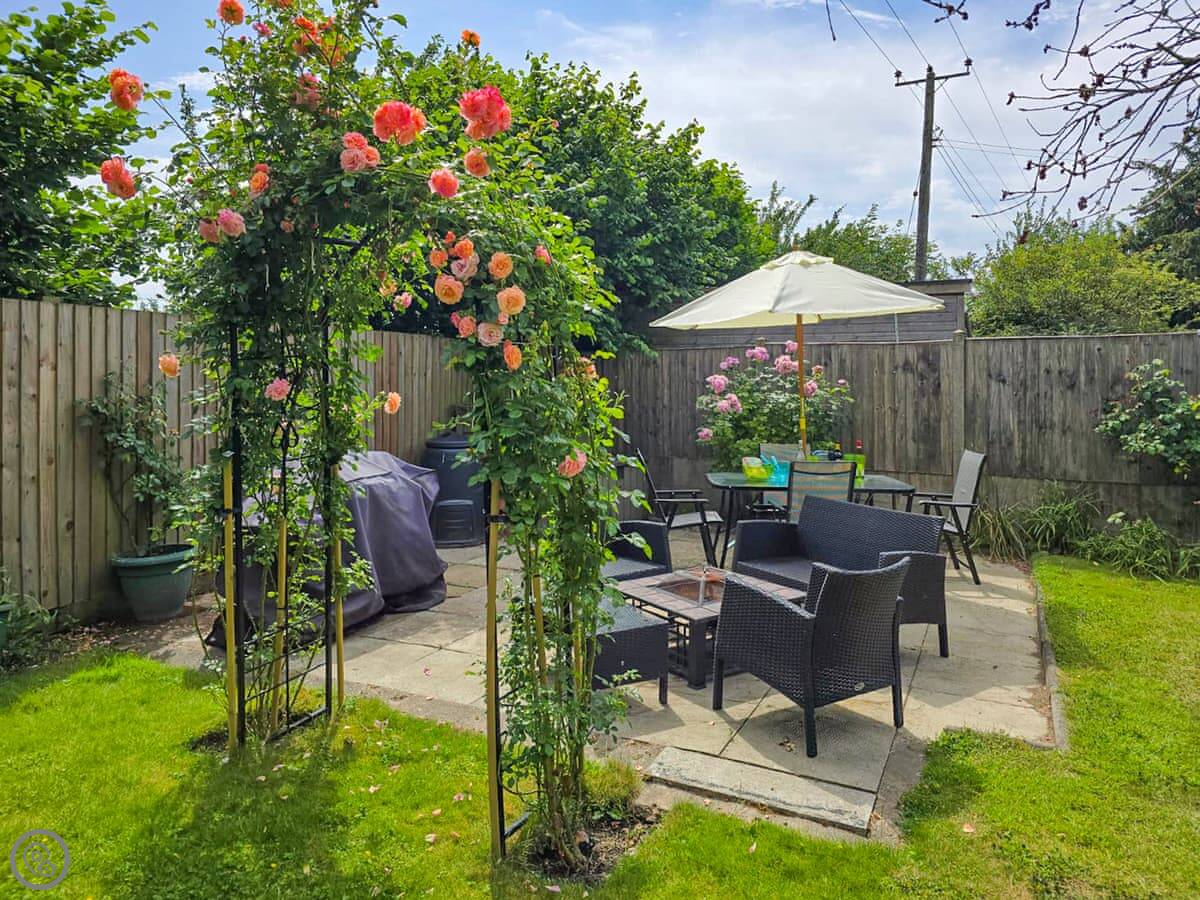 The garden is a lawn. It's got a patio area and looks out over fields. There's a BBQ out there if you want it.