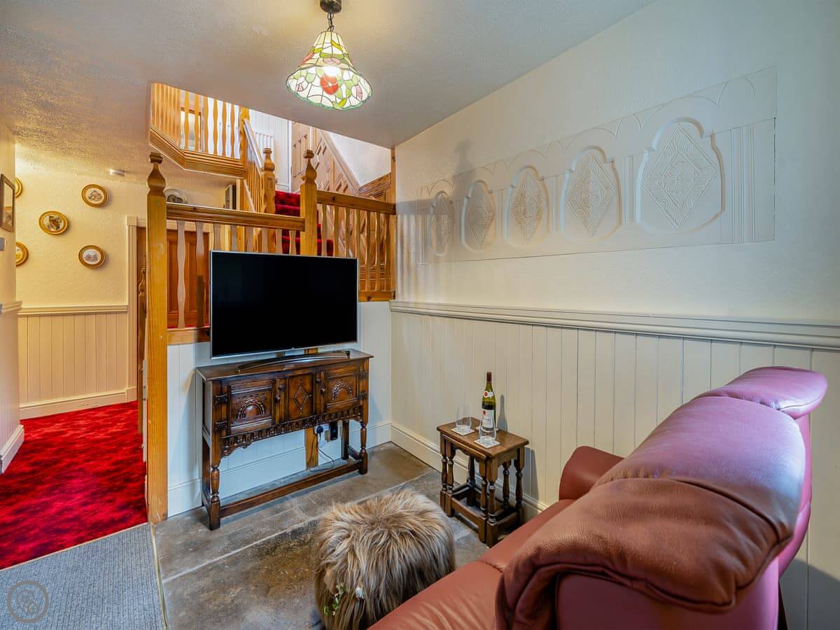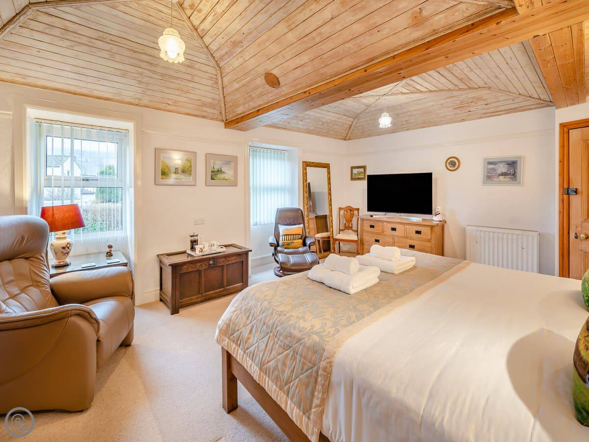 It’s a 5 Star place, so it’s very well equipped. The owners live here in the winter, so everything is good quality and it has things like underfloor heating, a heat pump, and solar panels. The kitchen has proper crockery and cutlery. There’s a wood burner in the main living room, a separate snug with a TV, and a study with a printer and a phone for free calls.