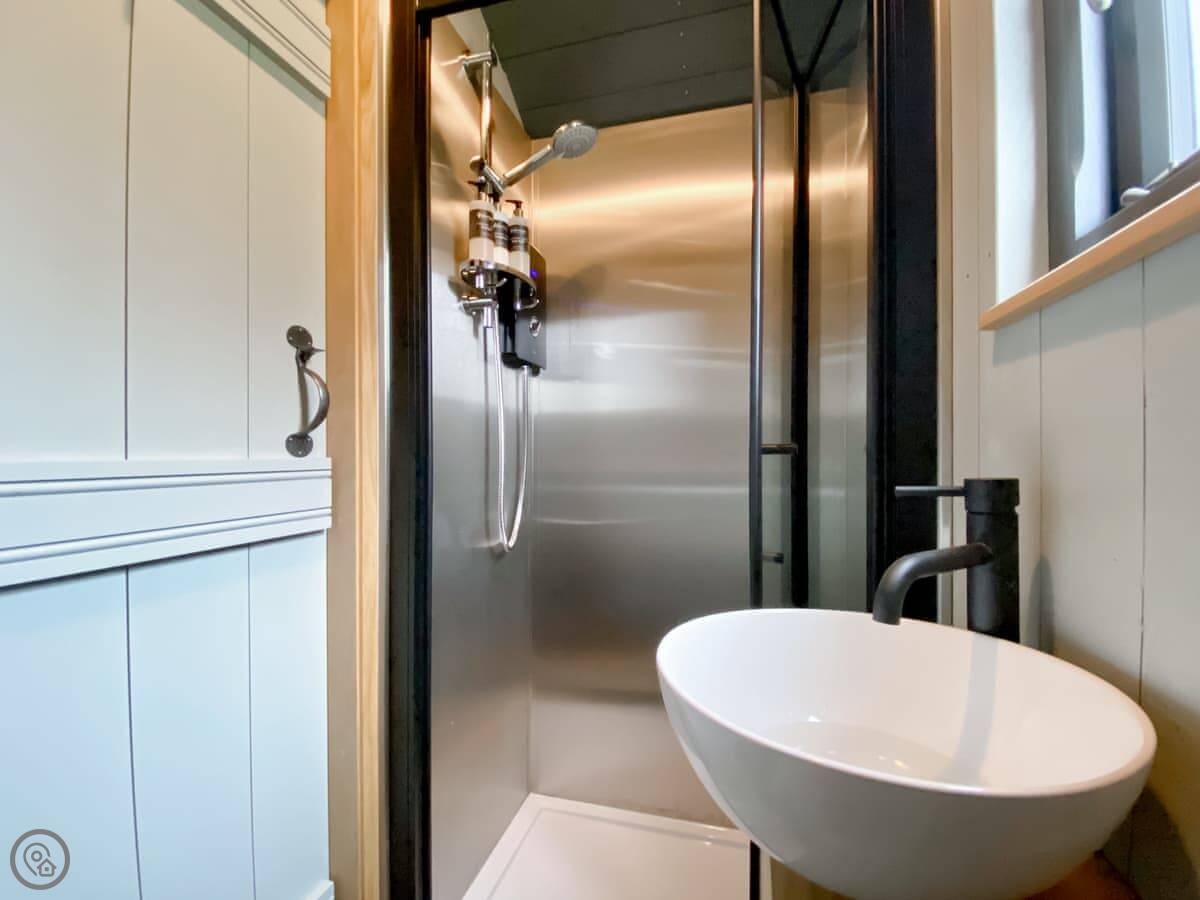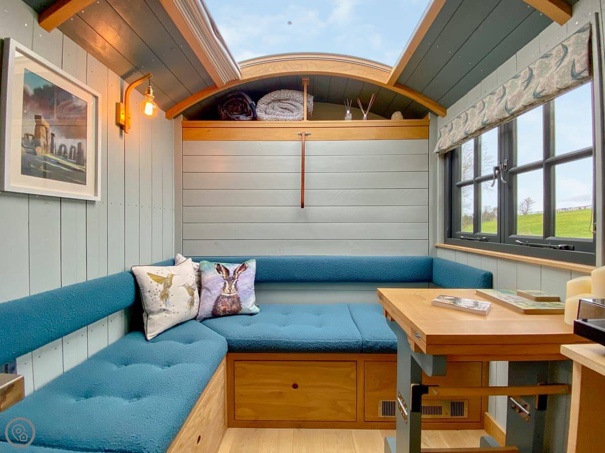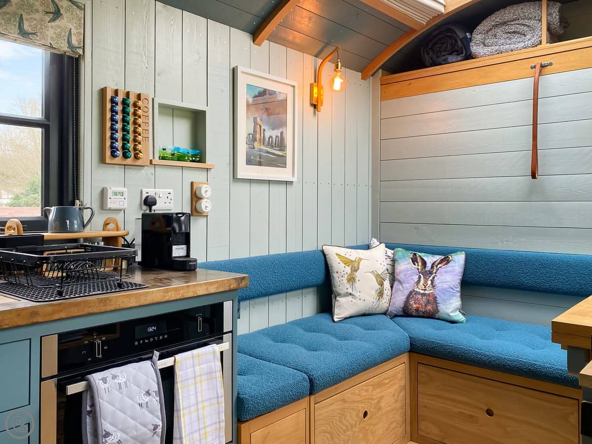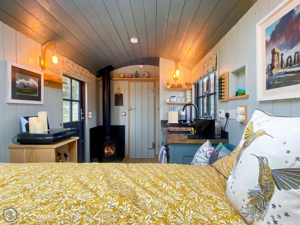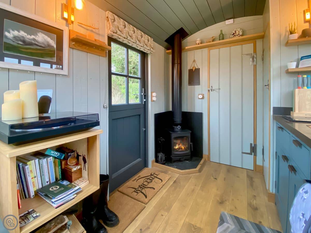 Inside, it's open plan with a wood burner. They leave you logs. There's Wifi and a record player with some records. Under the dining table is a chess board. The kitchen has what you need.