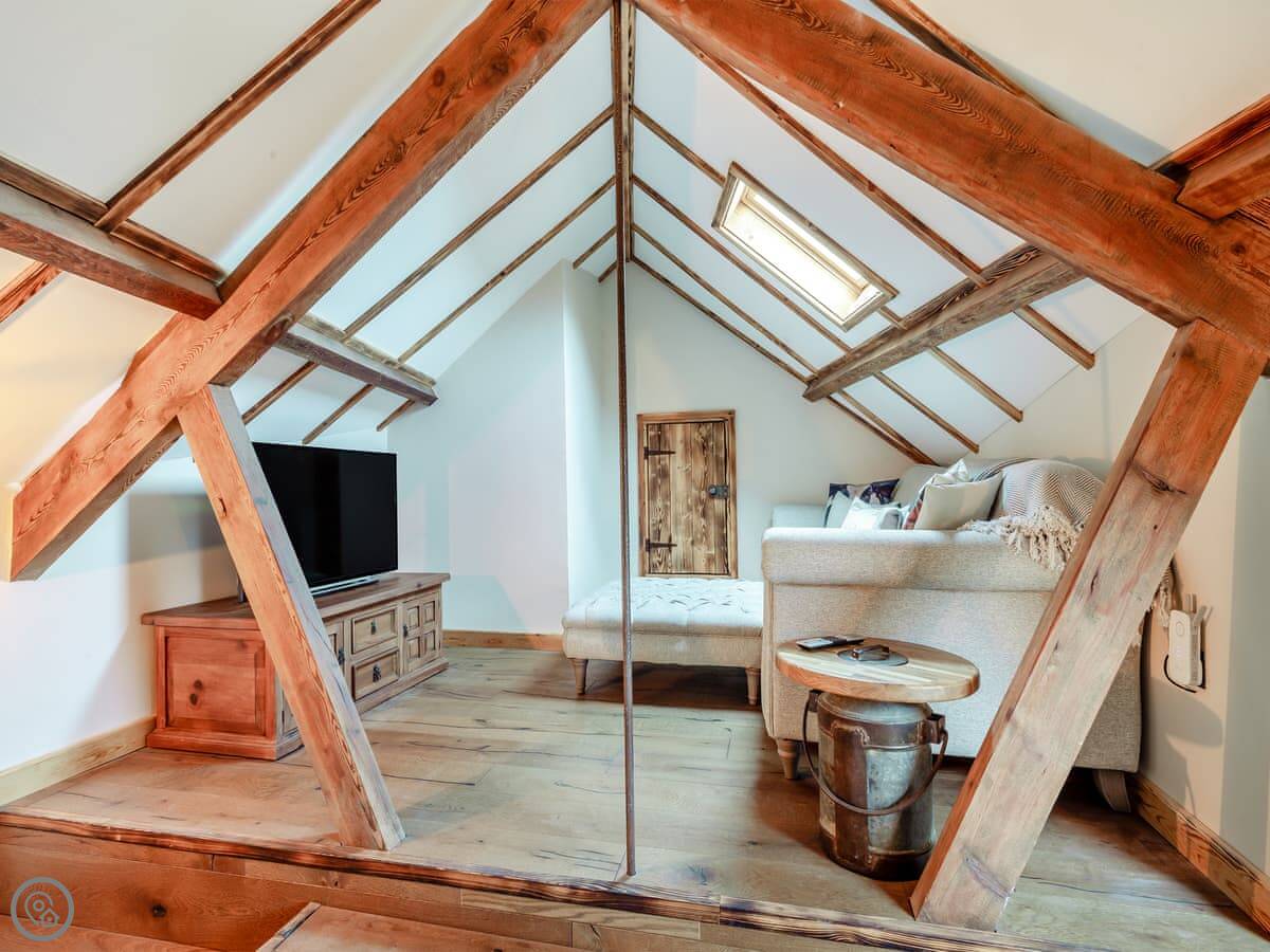 Inside, it's open plan downstairs. There's a spiral staircase up to an extra sitting area. The stairs are spiral and quite steep.