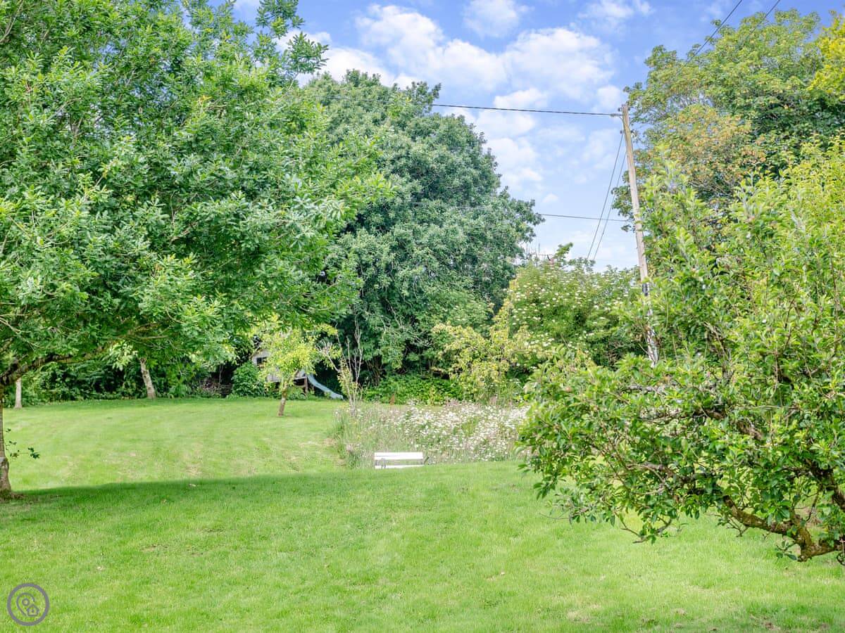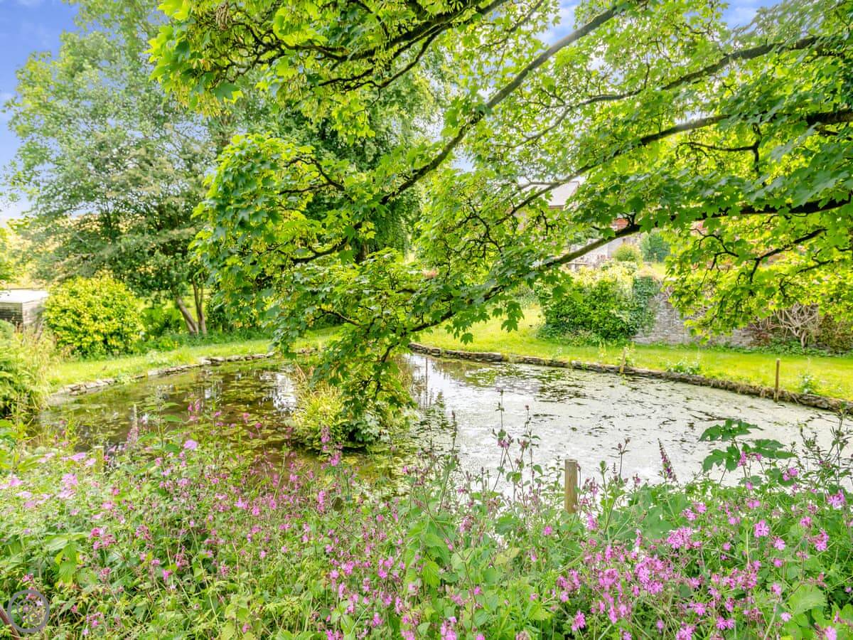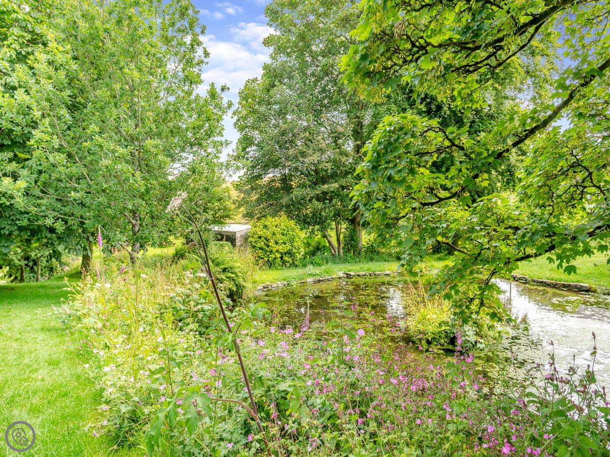 Outside, there's a shared garden area of about an acre and a half. It's got a brick BBQ, picnic tables, some swings and a playhouse for kids. There are a couple of ponds with wildlife. You get a view over the fields.
