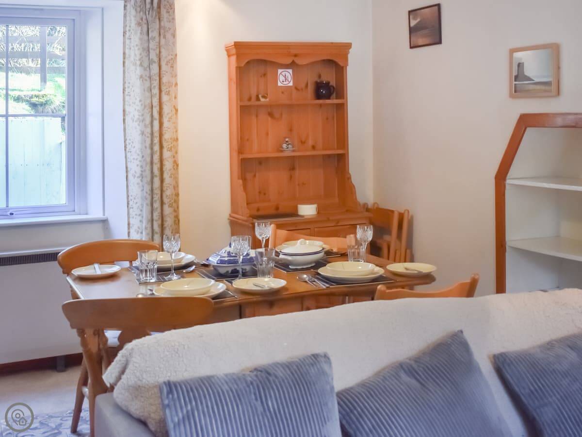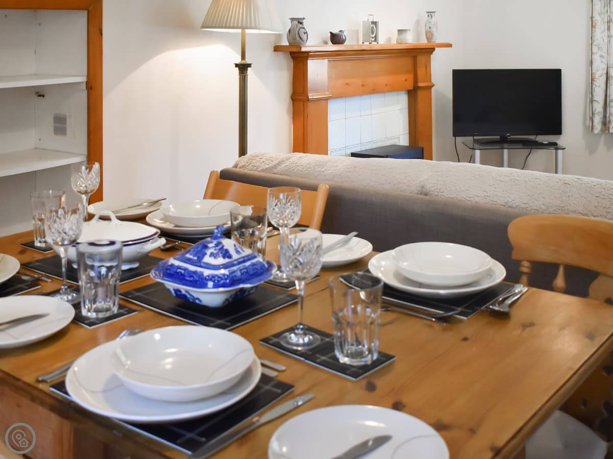 The living room has a dining table and an electric stove that looks like a wood burner. It's cosy. The stairs up to the bedrooms are a bit steep, just so you know.