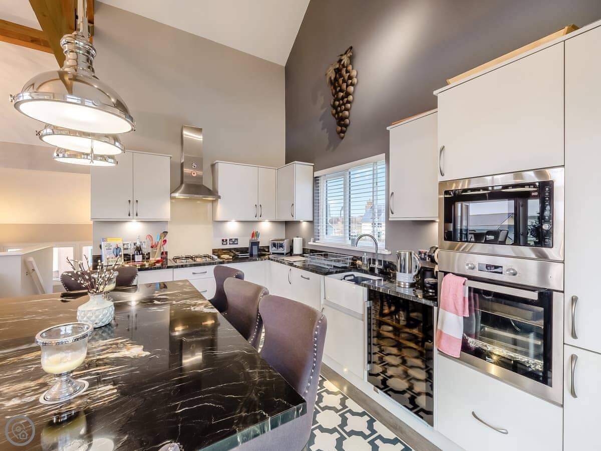 The living space is all upstairs. It's open plan with high ceilings and big windows so you get the views. There's a proper kitchen with a dishwasher and a wine fridge. The main thing is the balcony. It looks towards the Cheviot hills. It's a good spot for a coffee or to watch the stars. The property has a 5 Star rating, so it's well finished and comfortable.