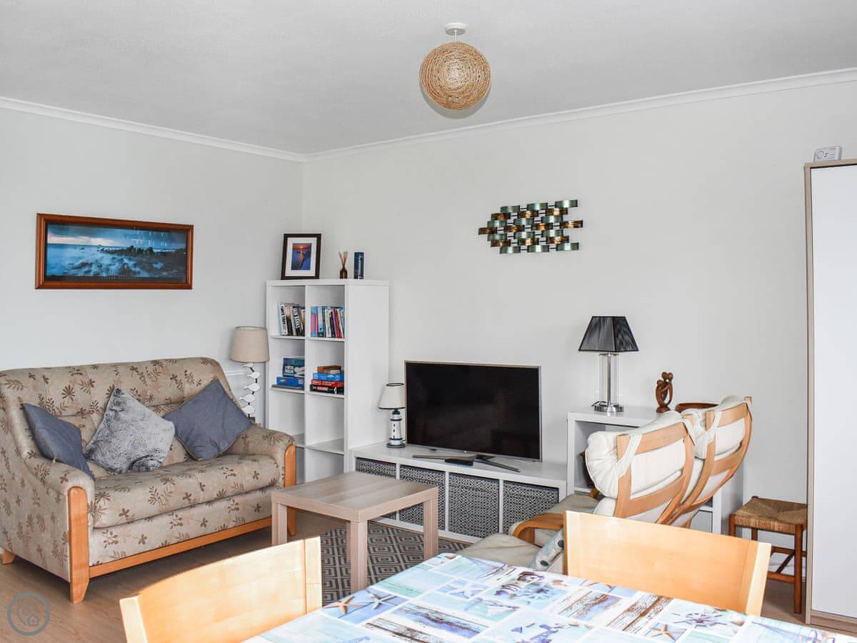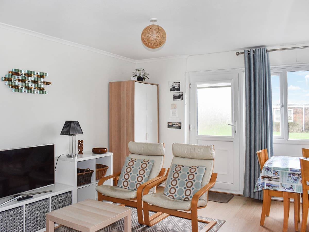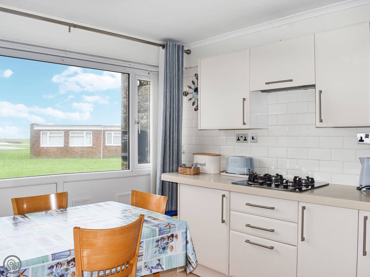 The layout is open plan. There's a lounge, dining area and kitchen all together. The main view is of the cliff tops, and you can see a bit of the sea from the windows. Outside the front there's a patio with some garden furniture.