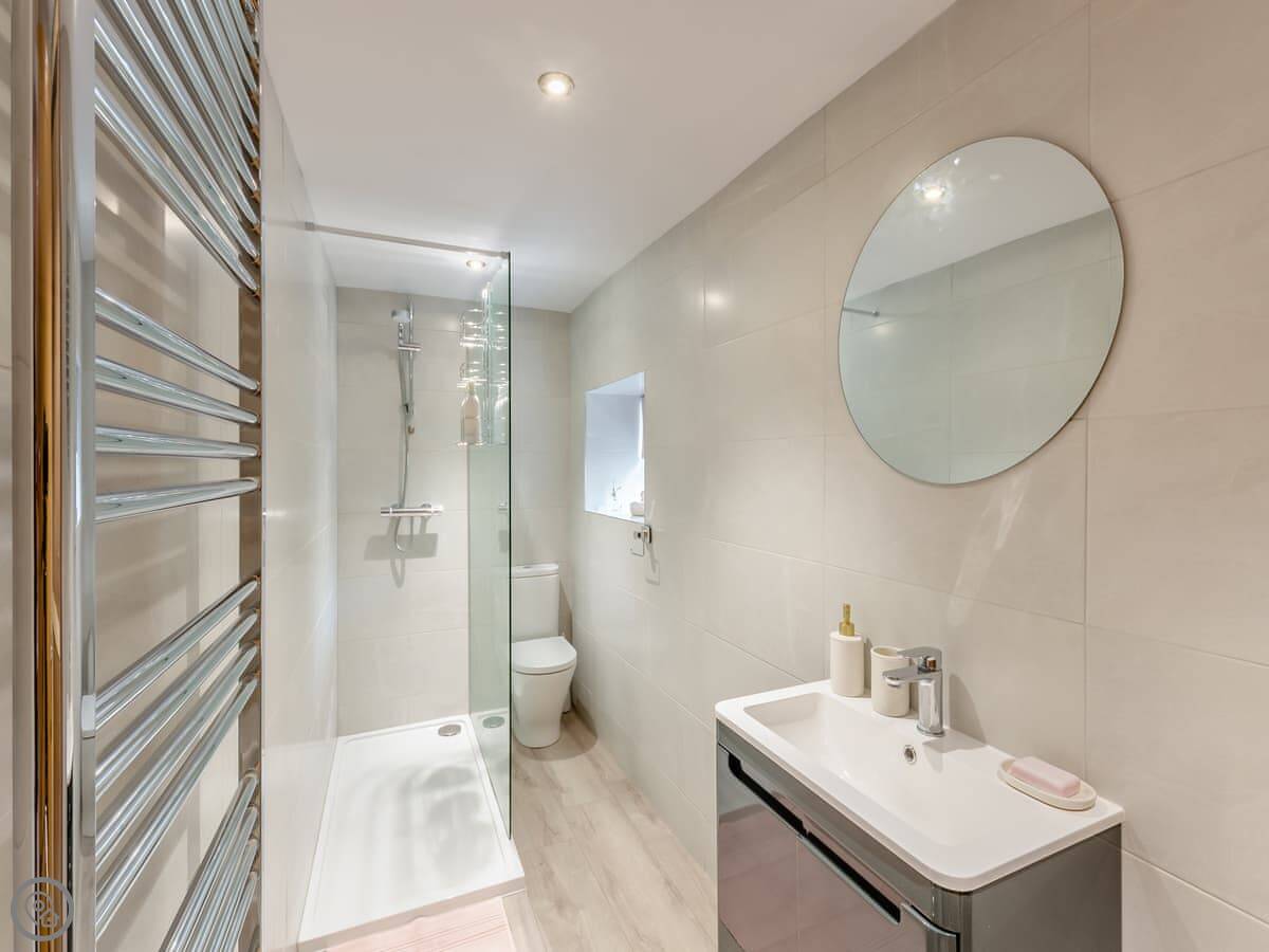 Upstairs is the bedroom. It's a super king bed but it can be split into two singles if you ask. The bathroom is next to it with a shower cubicle. Outside the front, there's a small enclosed patio with a table and chairs.