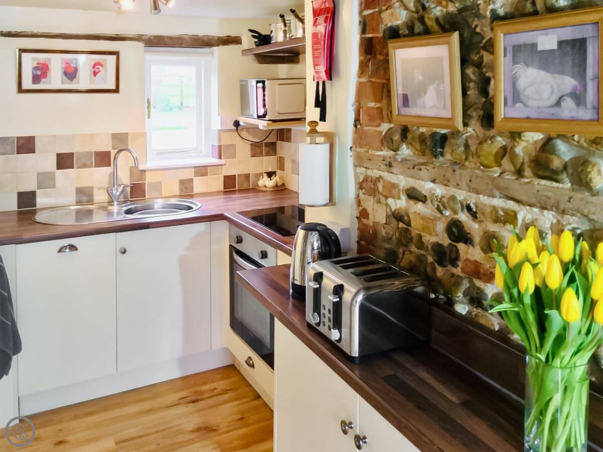 There's a wood burner in the front room and a TV. The kitchen has what you need, plus a dishwasher. The garden is a proper sun trap. It's enclosed and there's a big paddock for the dogs to run around in. We allow two pets.