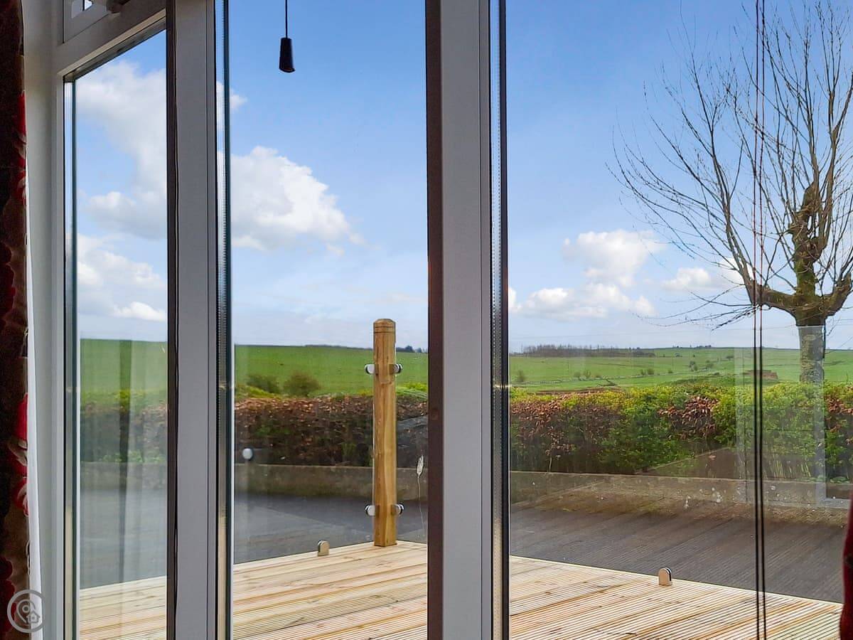 The main room is all open plan. Kitchen, dining, living area. Lots of windows so you get the light and the view. French doors open onto a deck. You can see Skiddaw from there.