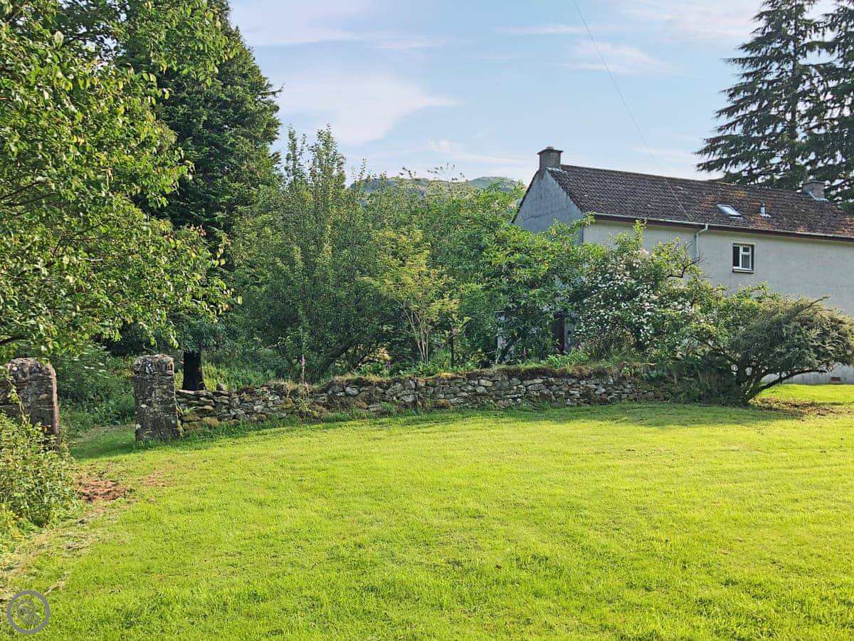 Bridge Park is in Killin. It's a detached cottage, used to be an old croft. It's in the middle of a big garden, mostly lawn with some trees. There are fields all around with sheep and cattle, and a small burn runs along one side. It's very quiet.