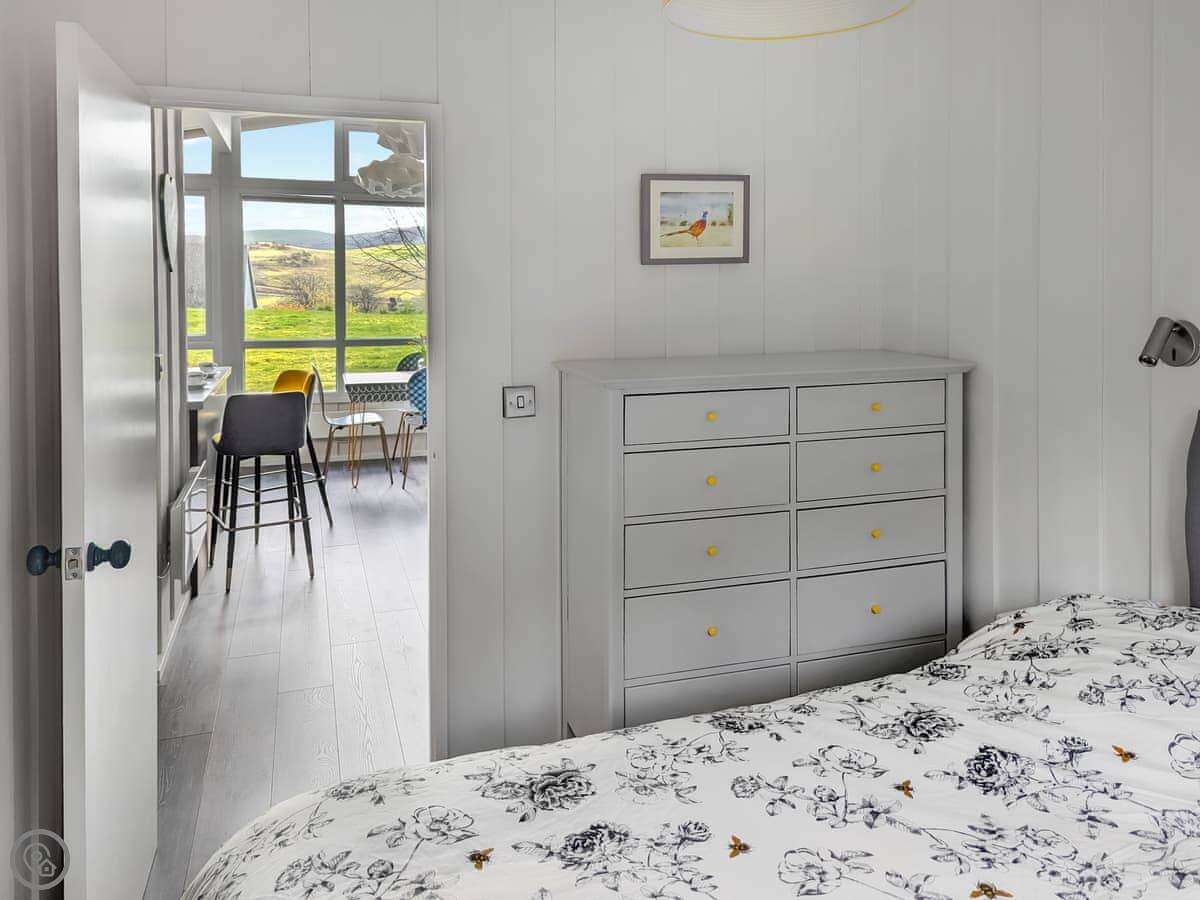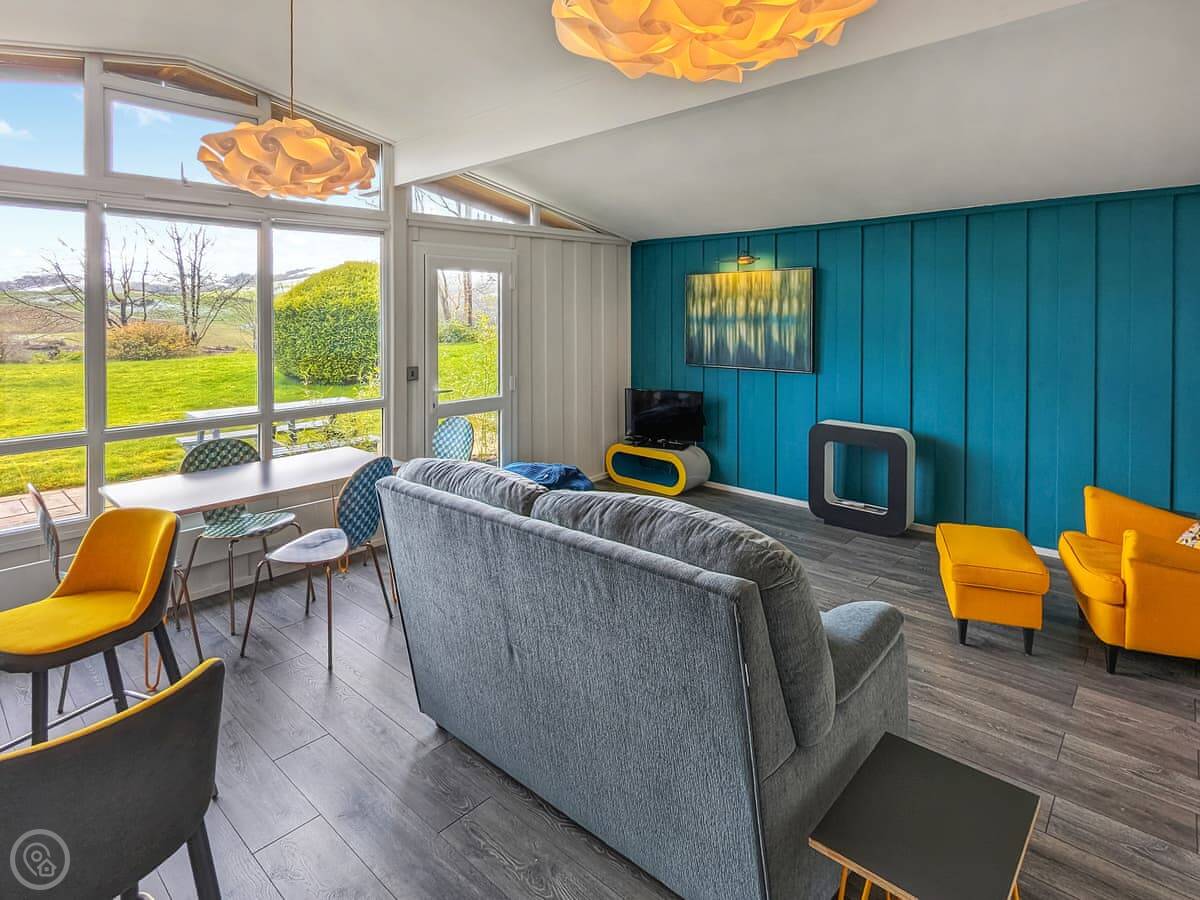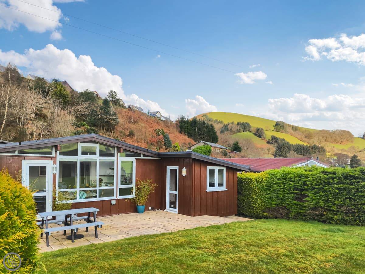 Ysgubor Lodge is a modern cabin in Llanwrin, near Machynlleth. It's on a small, private park of a few other lodges, so it's quiet but not totally isolated. The views out the back are the main thing, straight down the valley.