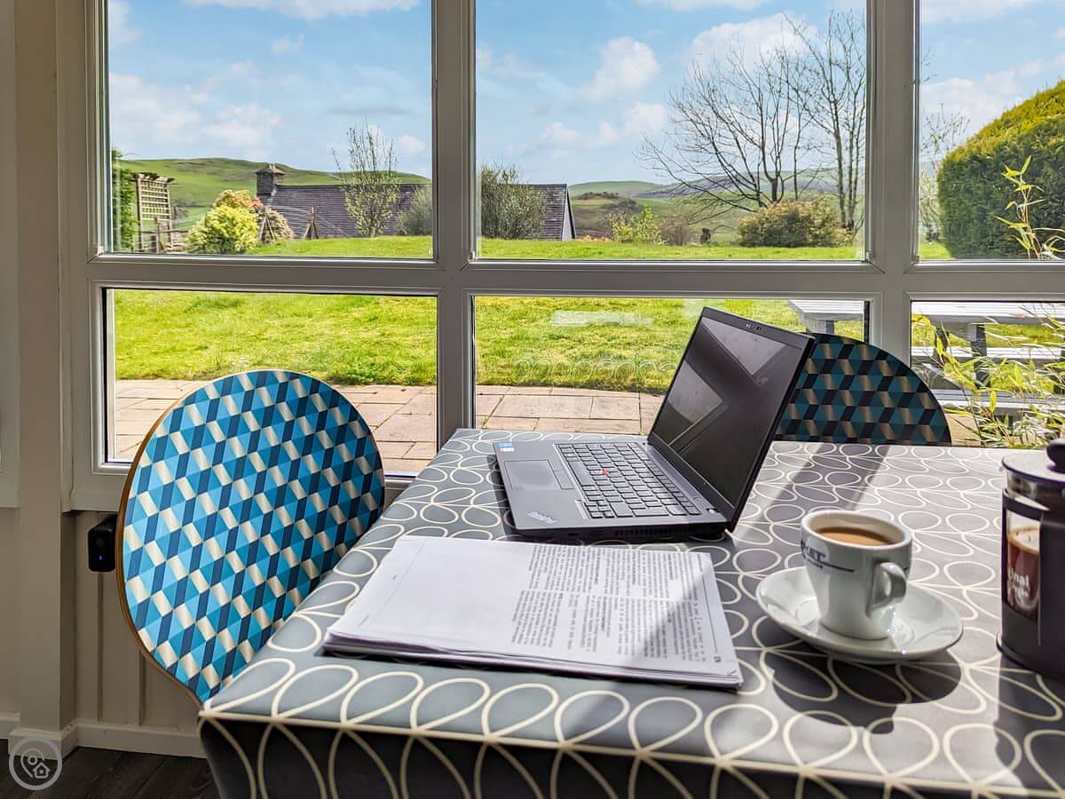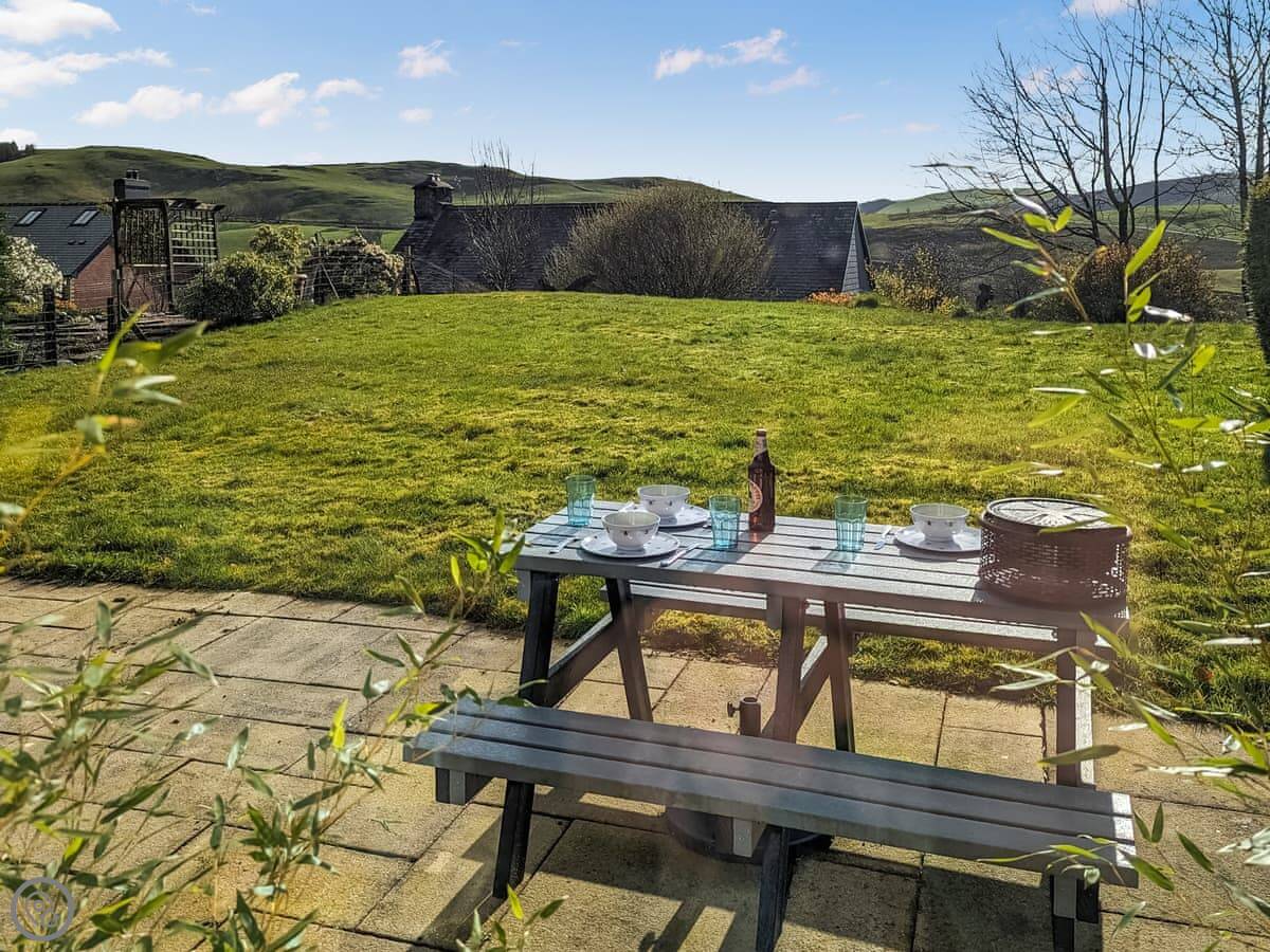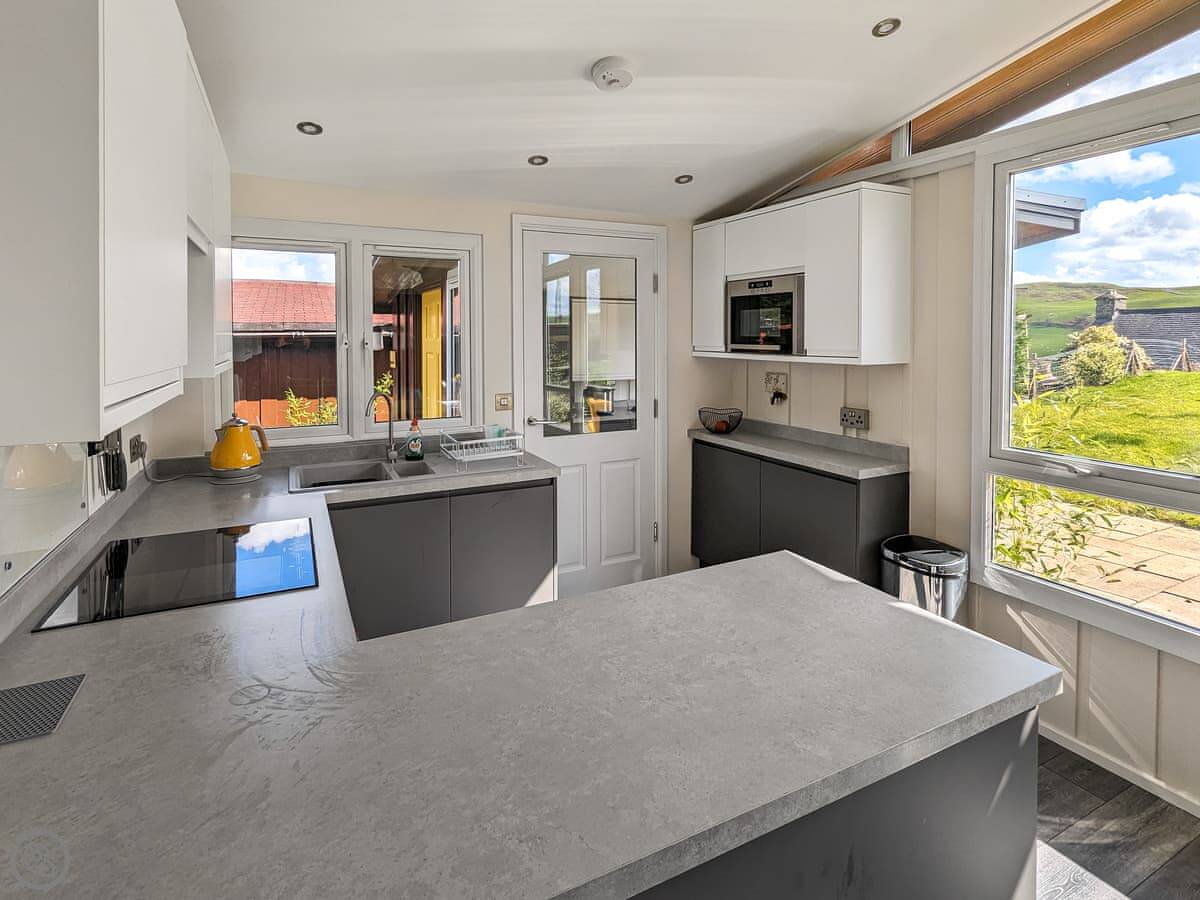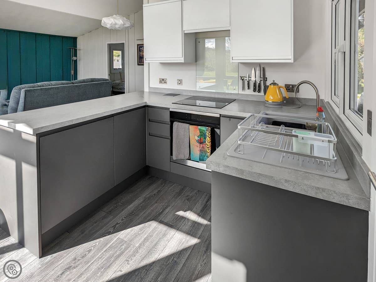 The living area is all open plan. Big windows at the back make it feel light and you get that view from inside. There's a decent kitchen with a dishwasher and a washing machine. The garden is enclosed, with a picnic bench and a BBQ.