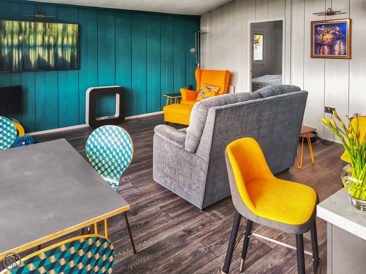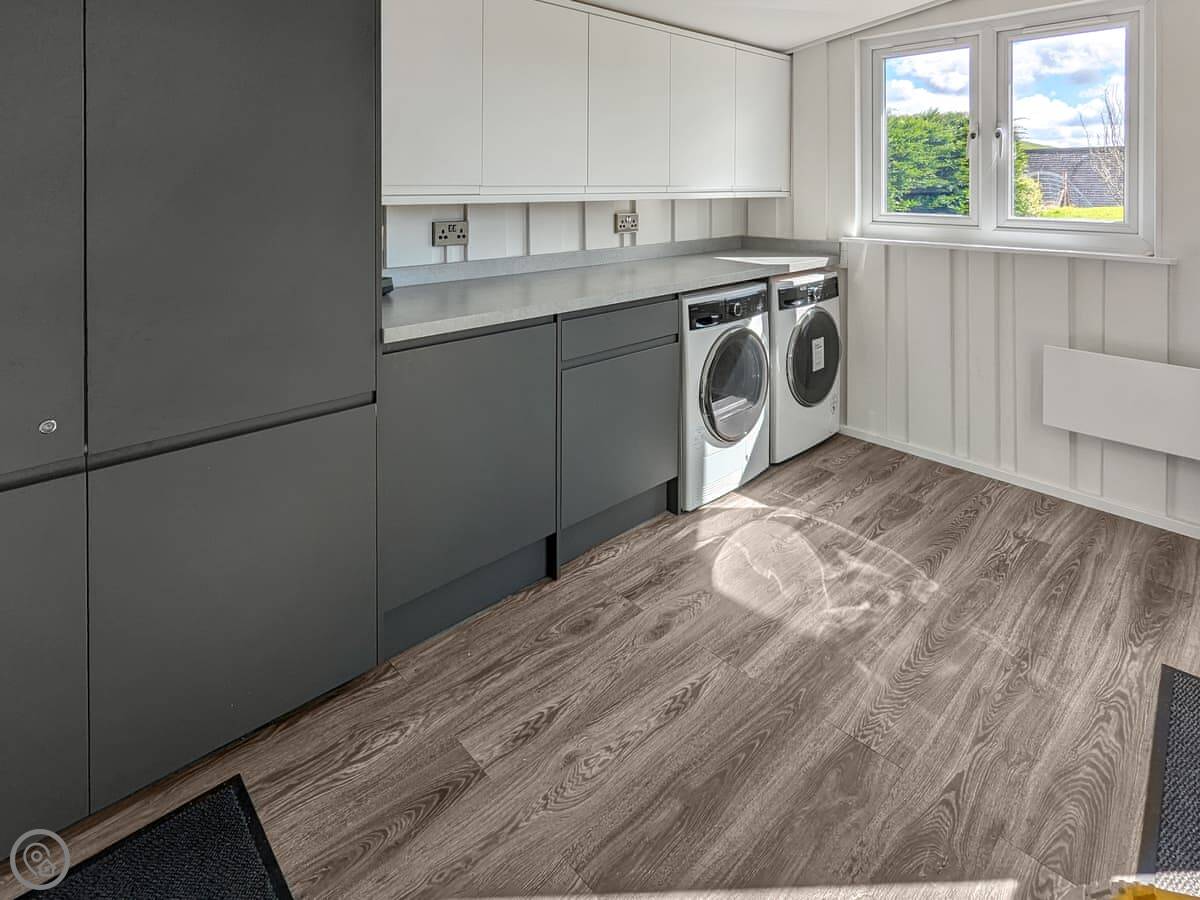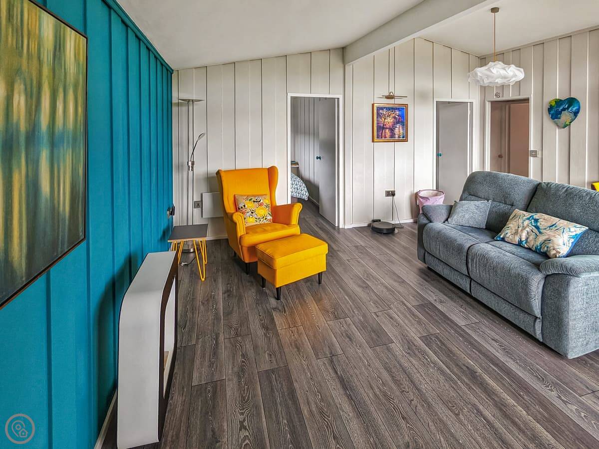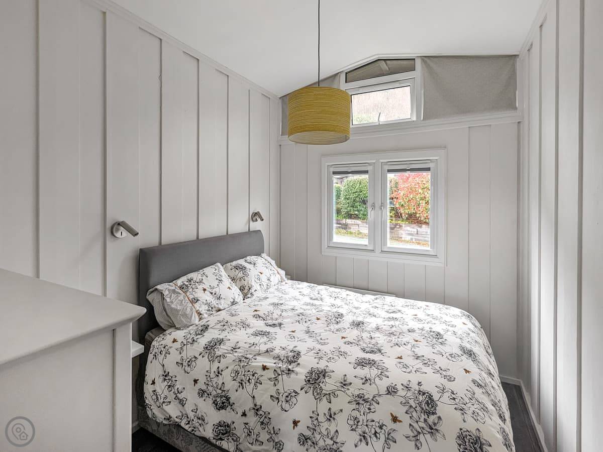 The living area is all open plan. Big windows at the back make it feel light and you get that view from inside. There's a decent kitchen with a dishwasher and a washing machine. The garden is enclosed, with a picnic bench and a BBQ.