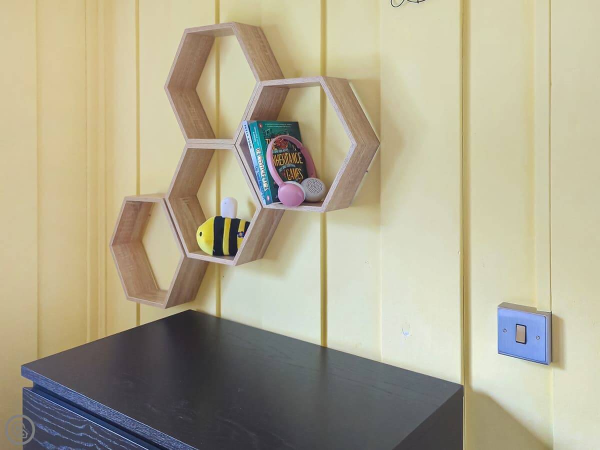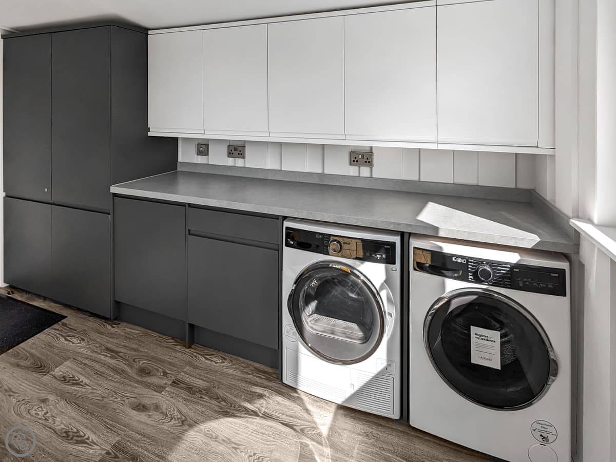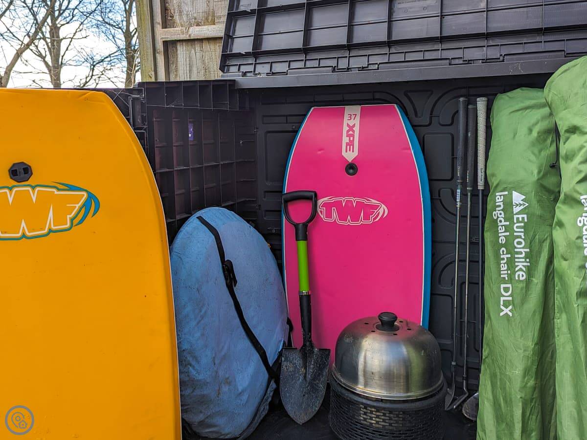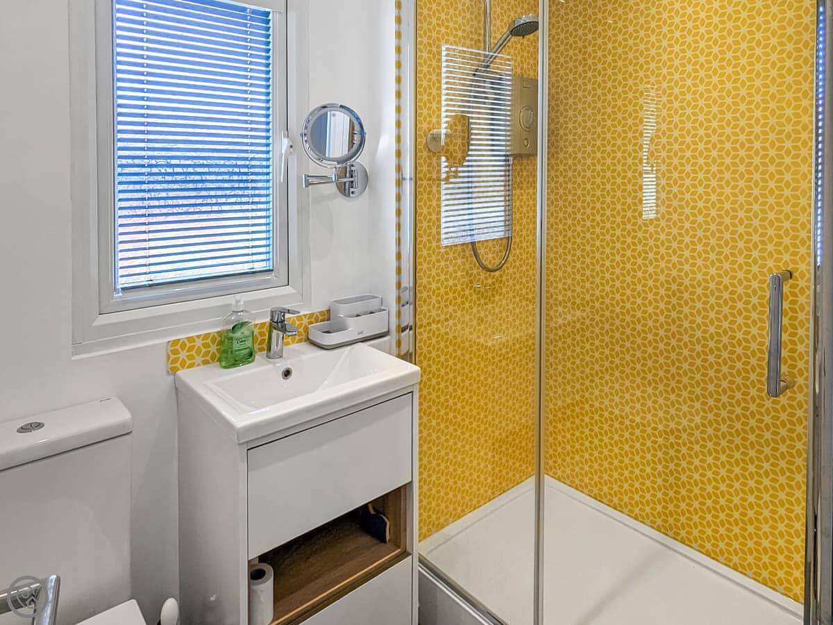 The living area is all open plan. Big windows at the back make it feel light and you get that view from inside. There's a decent kitchen with a dishwasher and a washing machine. The garden is enclosed, with a picnic bench and a BBQ.
