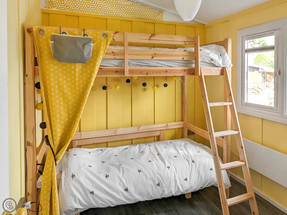 It sleeps four. There are three bedrooms: one double, one kingsize, and one with bunk beds. The bunk room is really only suitable for children. One bathroom with a shower. It's got a 4 Star rating, so it's well-equipped and comfortable. Everything's included: bedding, towels, electricity.