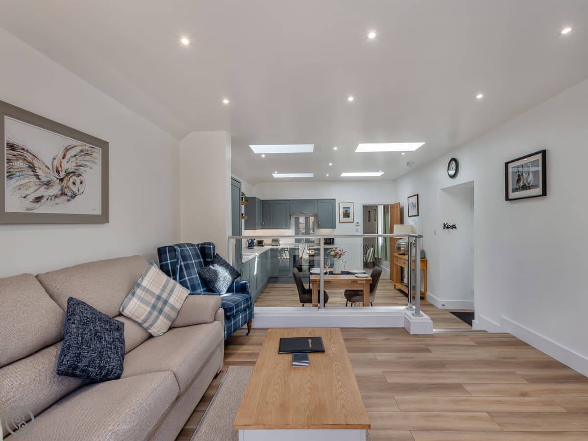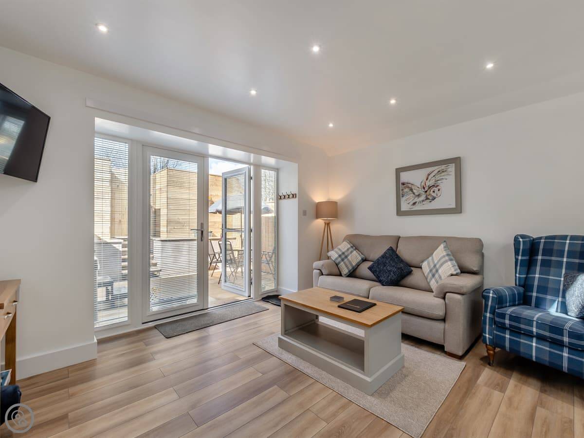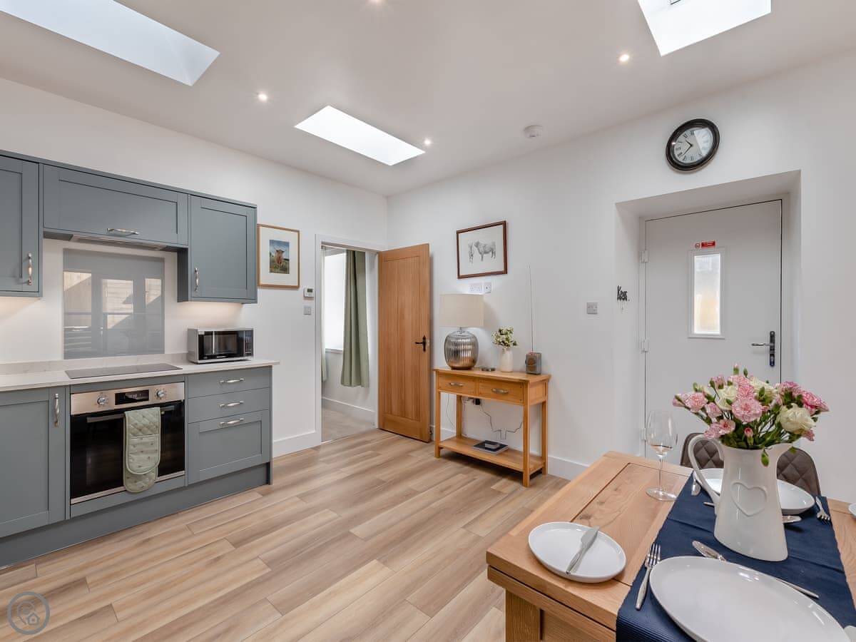 The Old Byre is on the A68, up at Kiln Pit Hill. It's a converted stone barn, so it's detached. You get the whole place and the garden to yourselves. It's all on one level, which is handy. There's a step up into the lounge from the hallway, just so you know.
