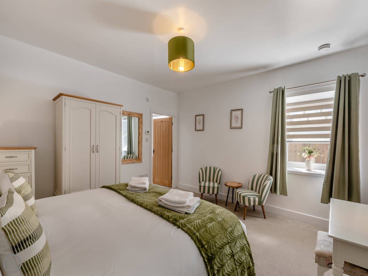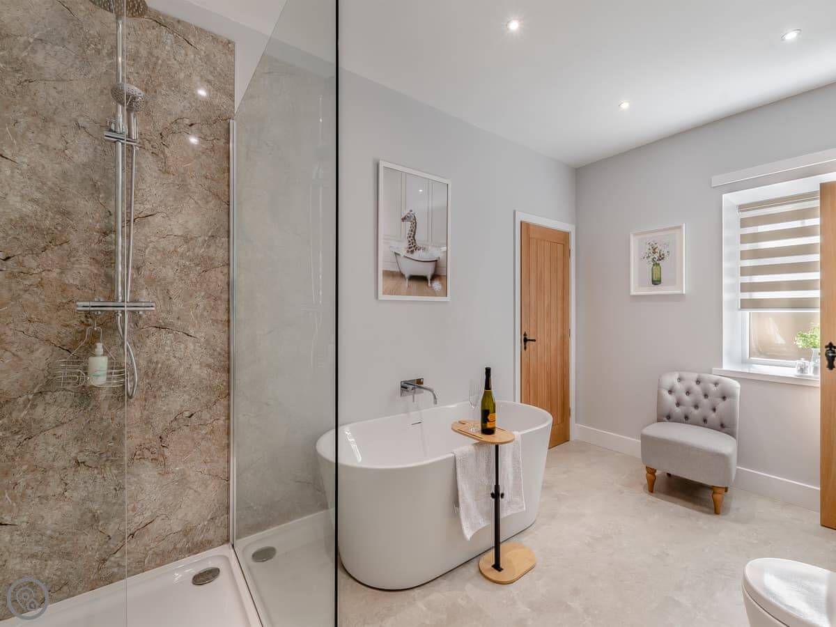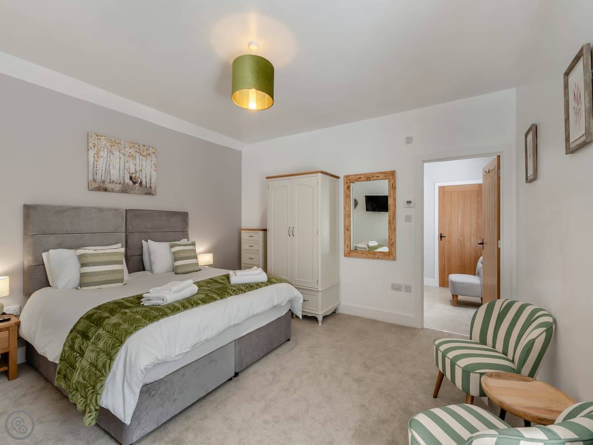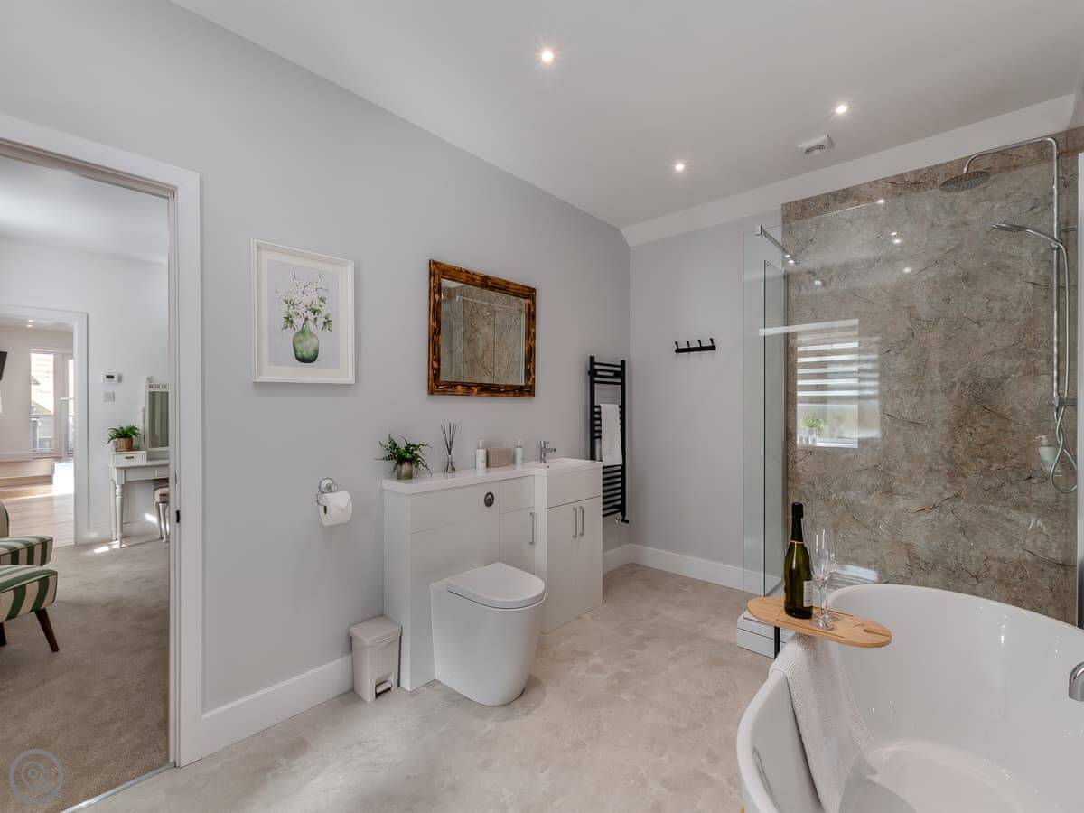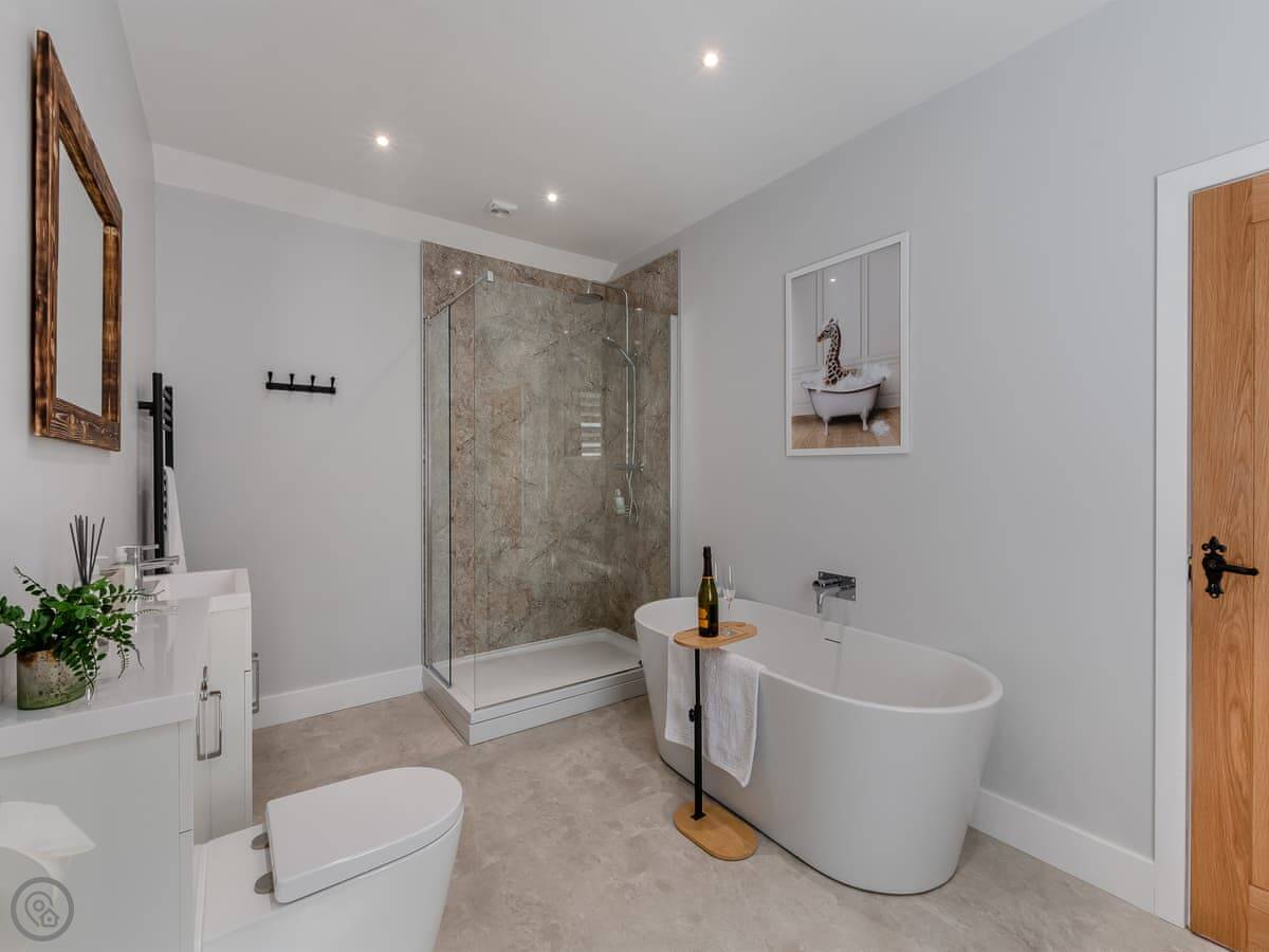 It's for two people. One bedroom, one bathroom. It's got a 5 Star rating, so it's done to a high standard. Everything's new. The bed is a super king that can be split into two singles if you need it. The bathroom is big, with both a bath and a large shower.
