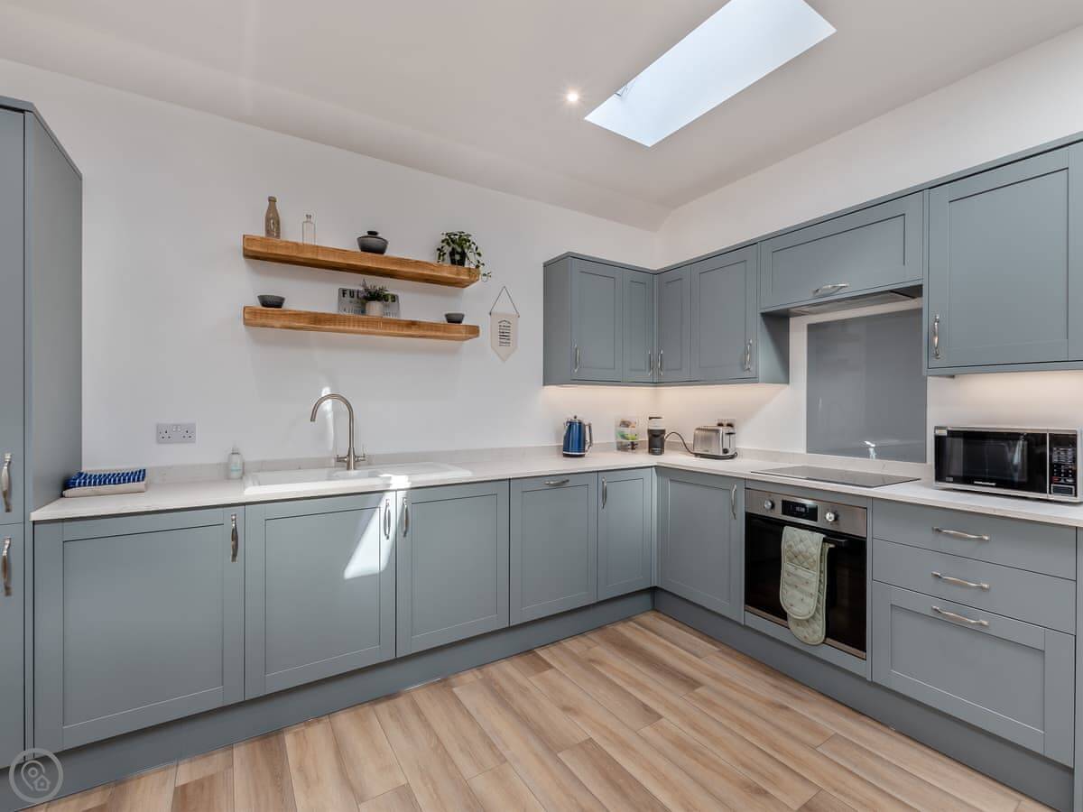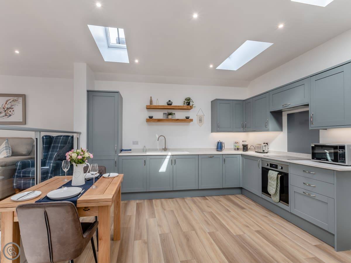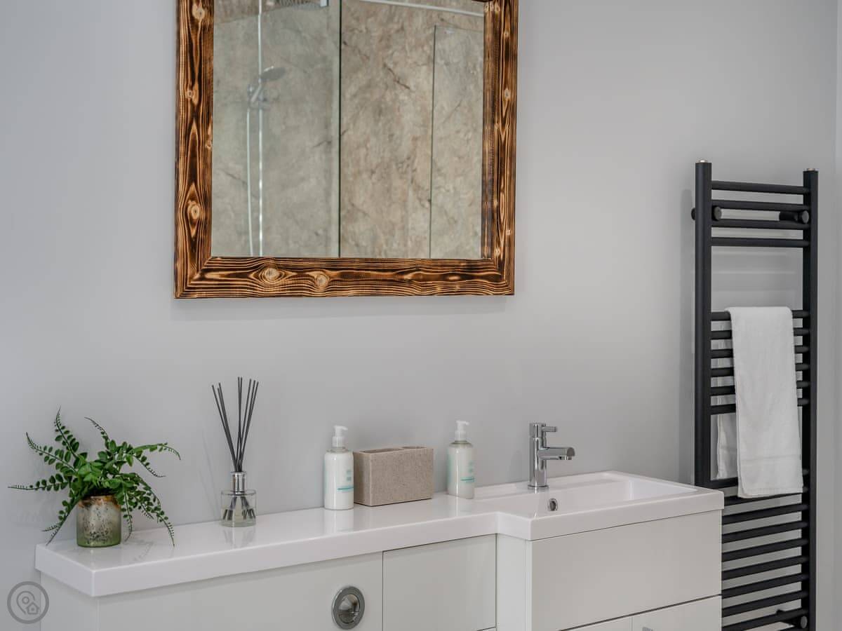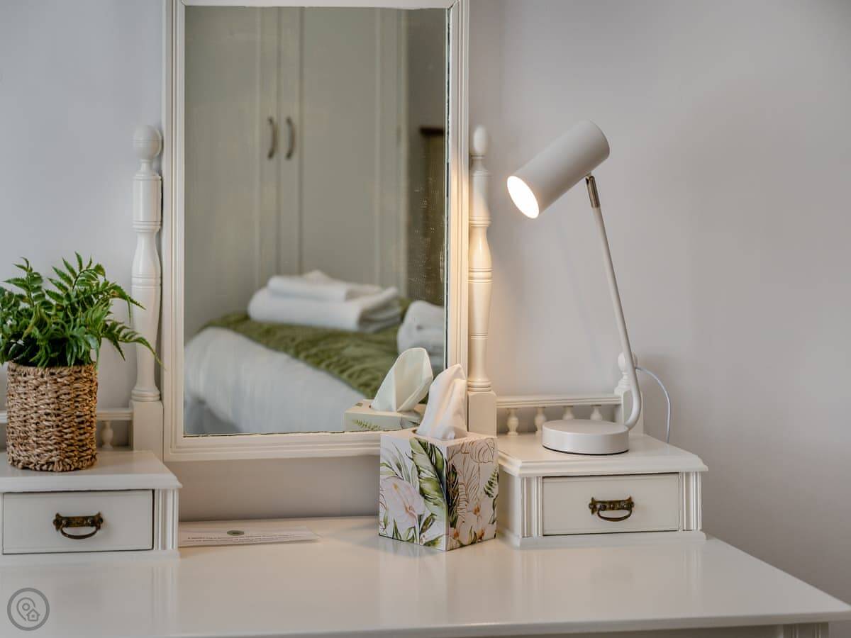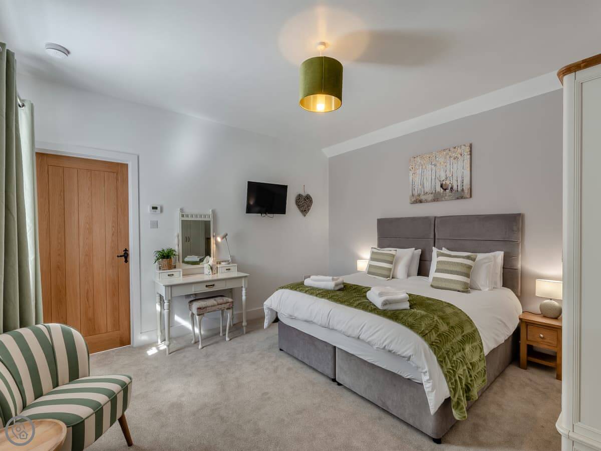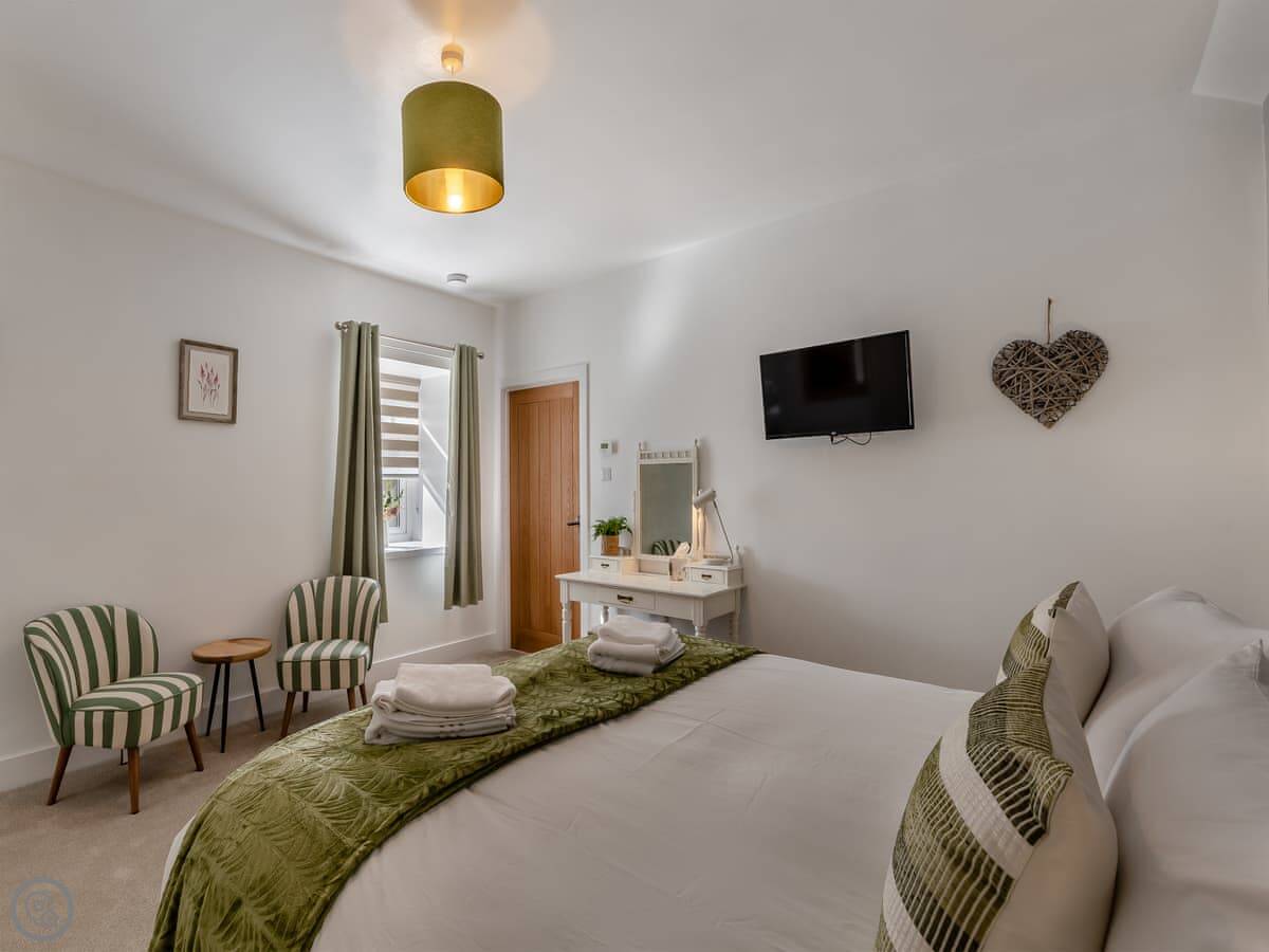 It's for two people. One bedroom, one bathroom. It's got a 5 Star rating, so it's done to a high standard. Everything's new. The bed is a super king that can be split into two singles if you need it. The bathroom is big, with both a bath and a large shower.