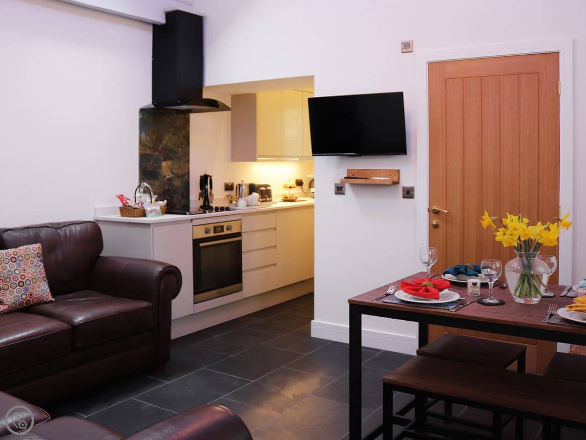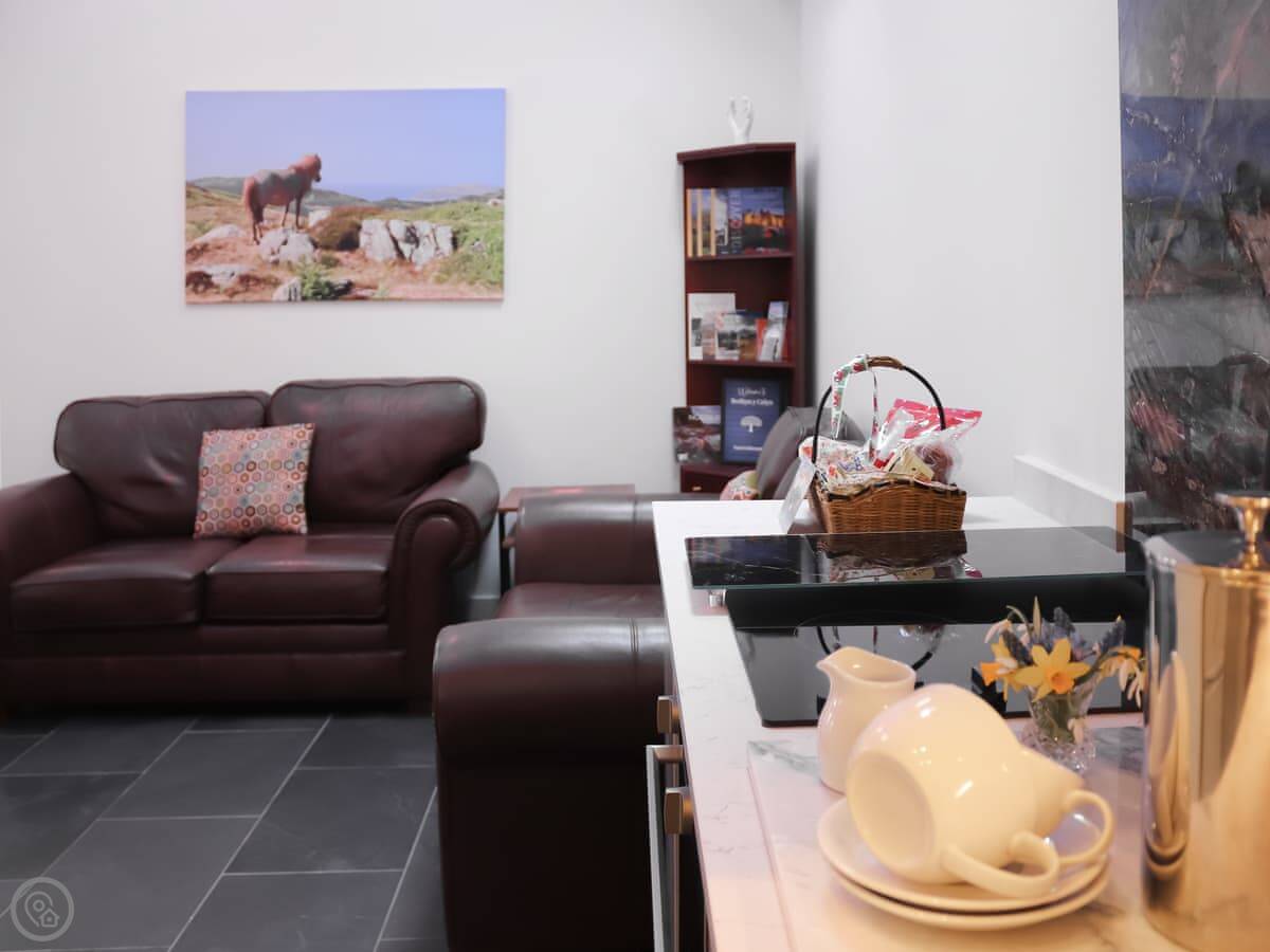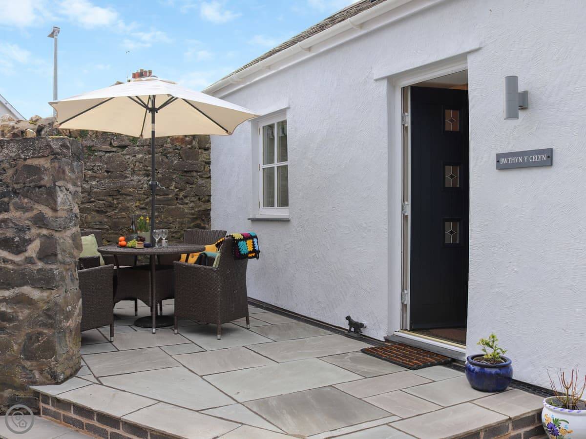 It's a five-star place, so everything is in good order and it's well looked after. The kitchen is open plan with the living area. You have your own patio and you're welcome to use the main gardens of Bryn Guest House next door. They've won awards for them.