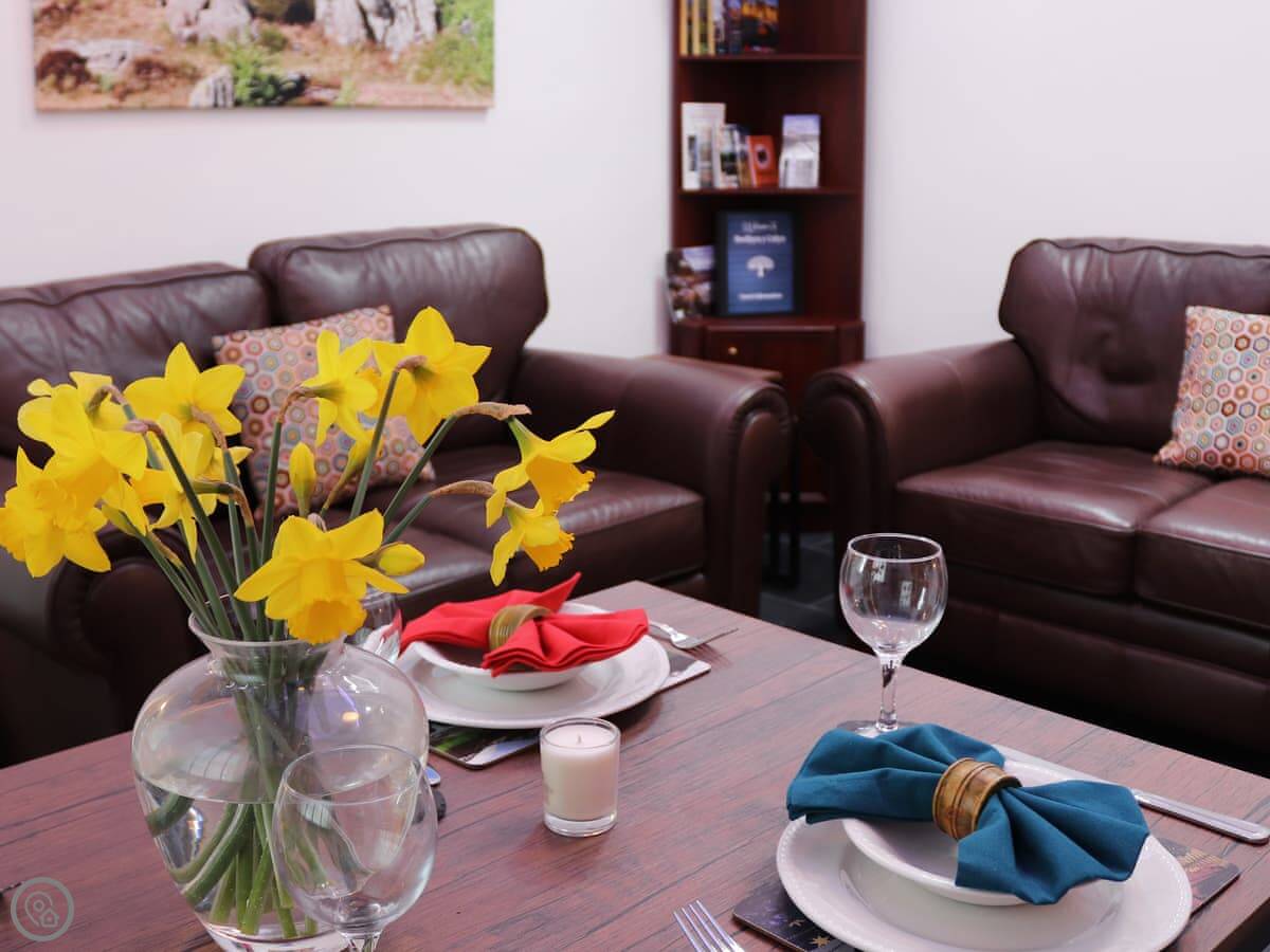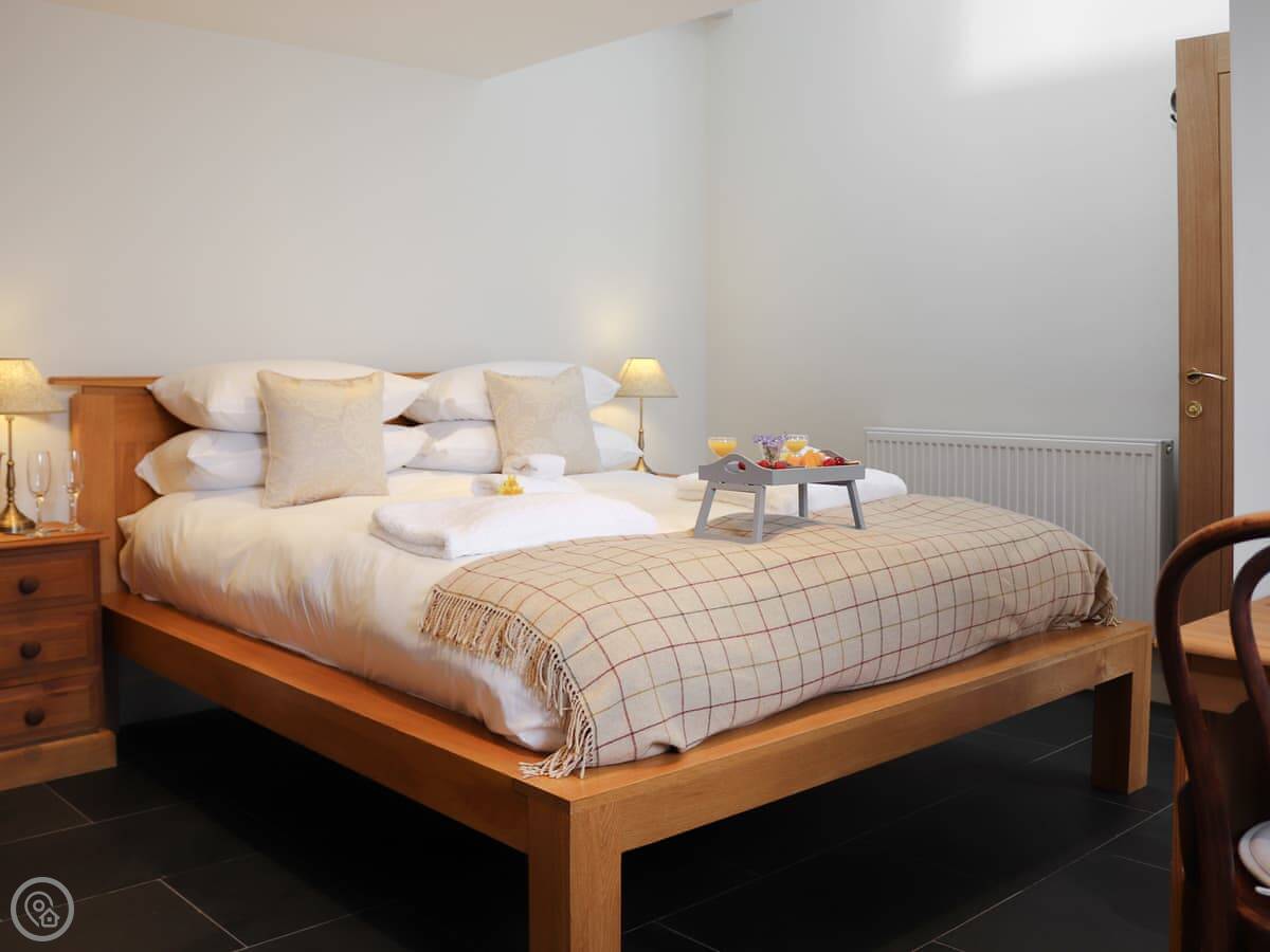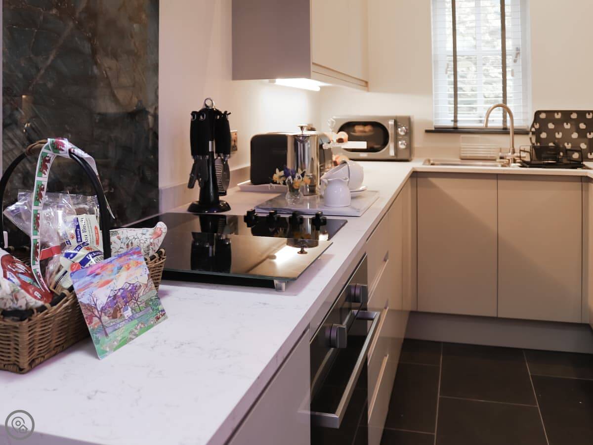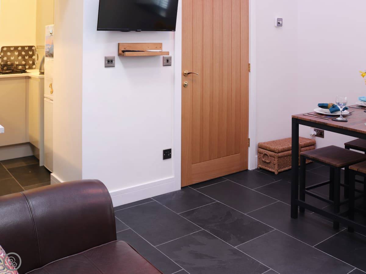 It's a five-star place, so everything is in good order and it's well looked after. The kitchen is open plan with the living area. You have your own patio and you're welcome to use the main gardens of Bryn Guest House next door. They've won awards for them.
